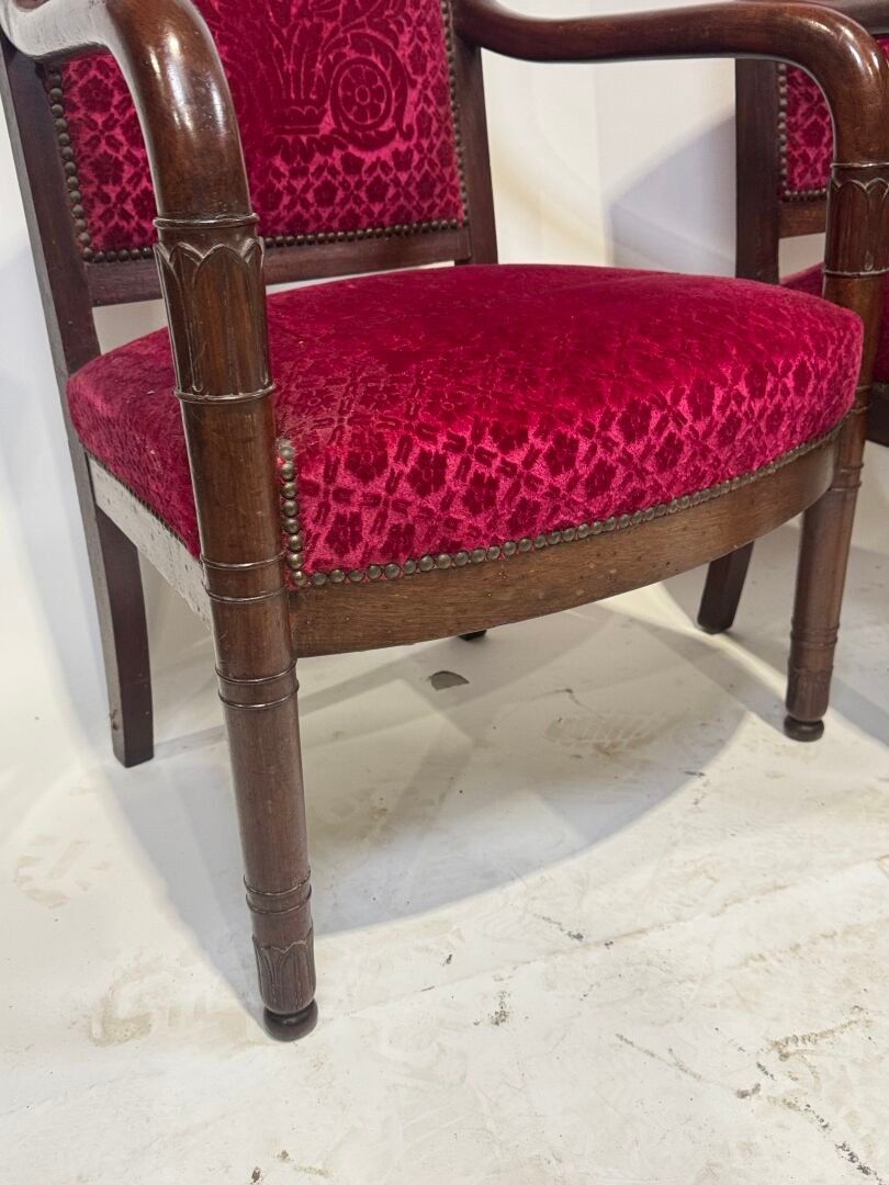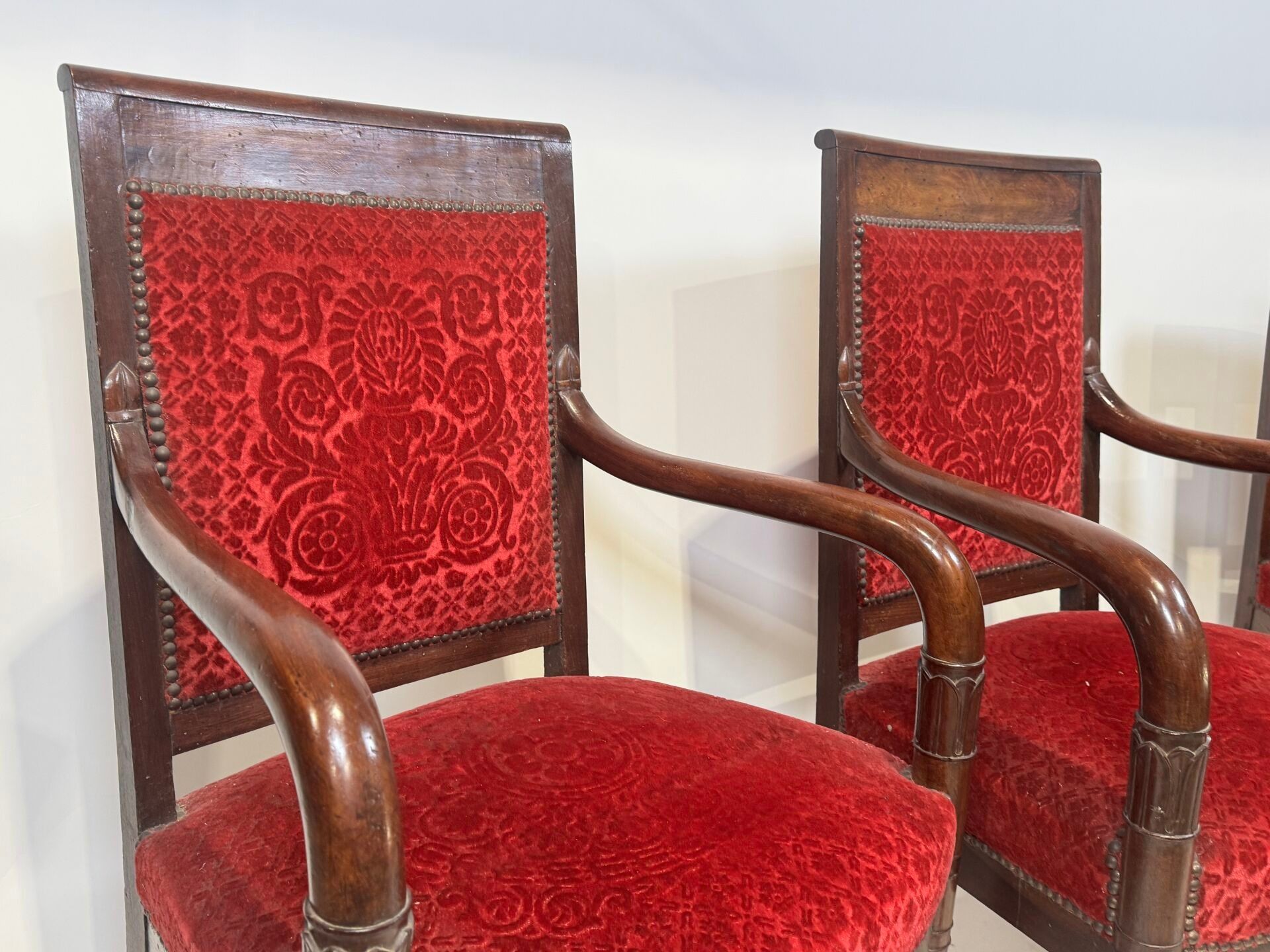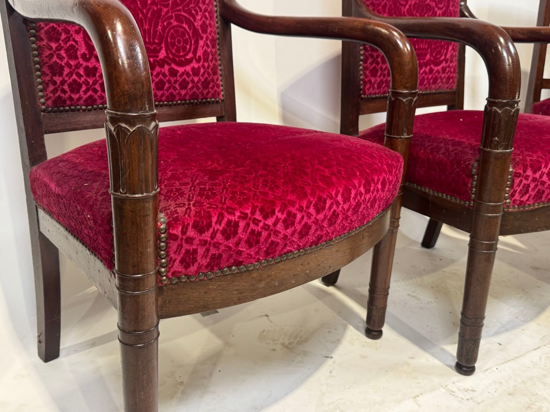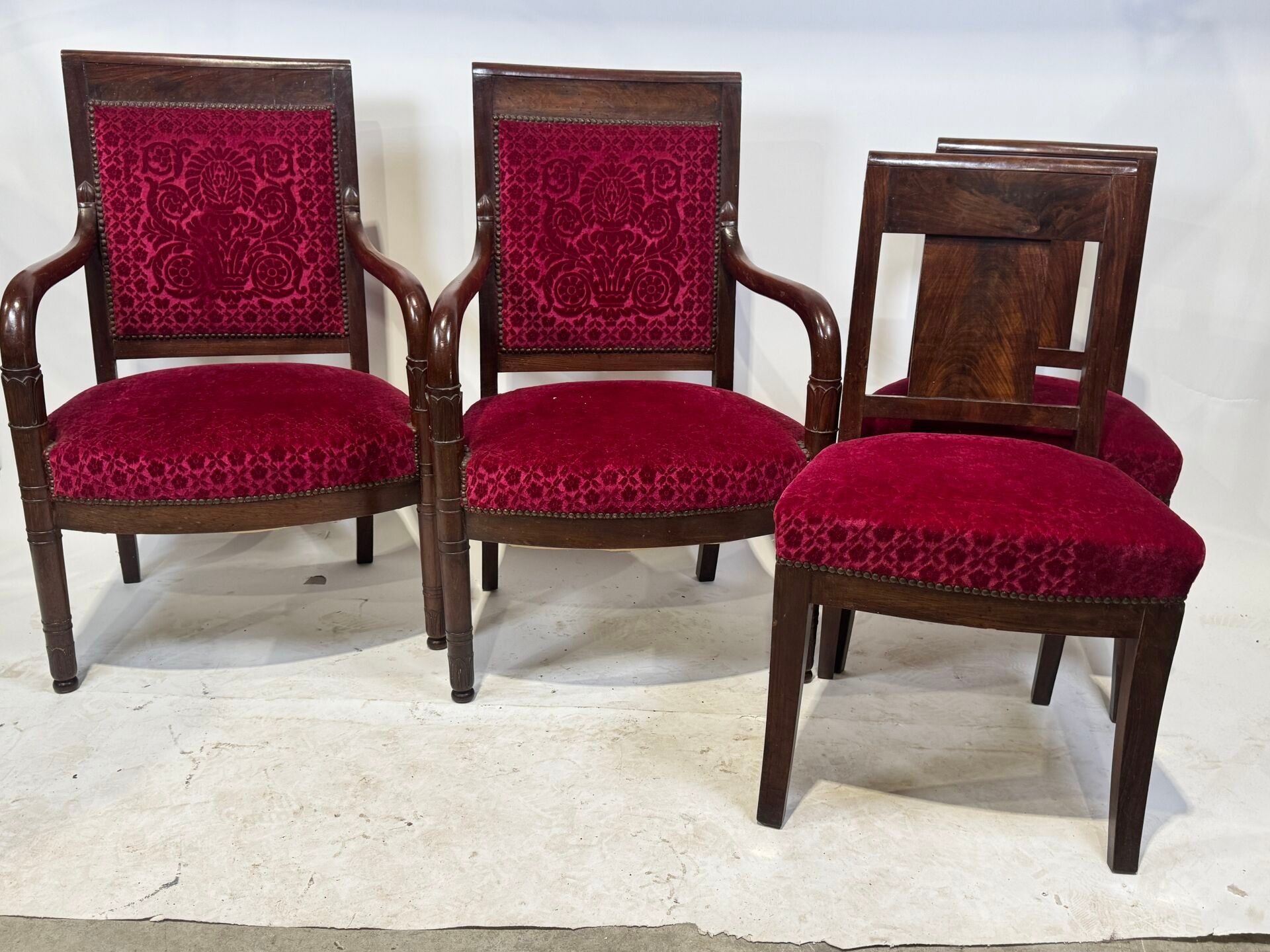 Moulded mahogany lounge set comprising a pair of armchairs and a pair of chairs. Etruscan legs. Velvet cover.