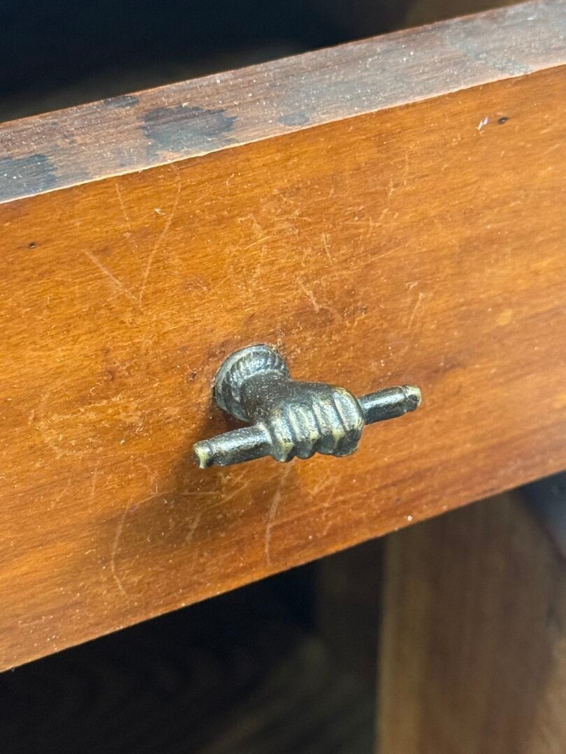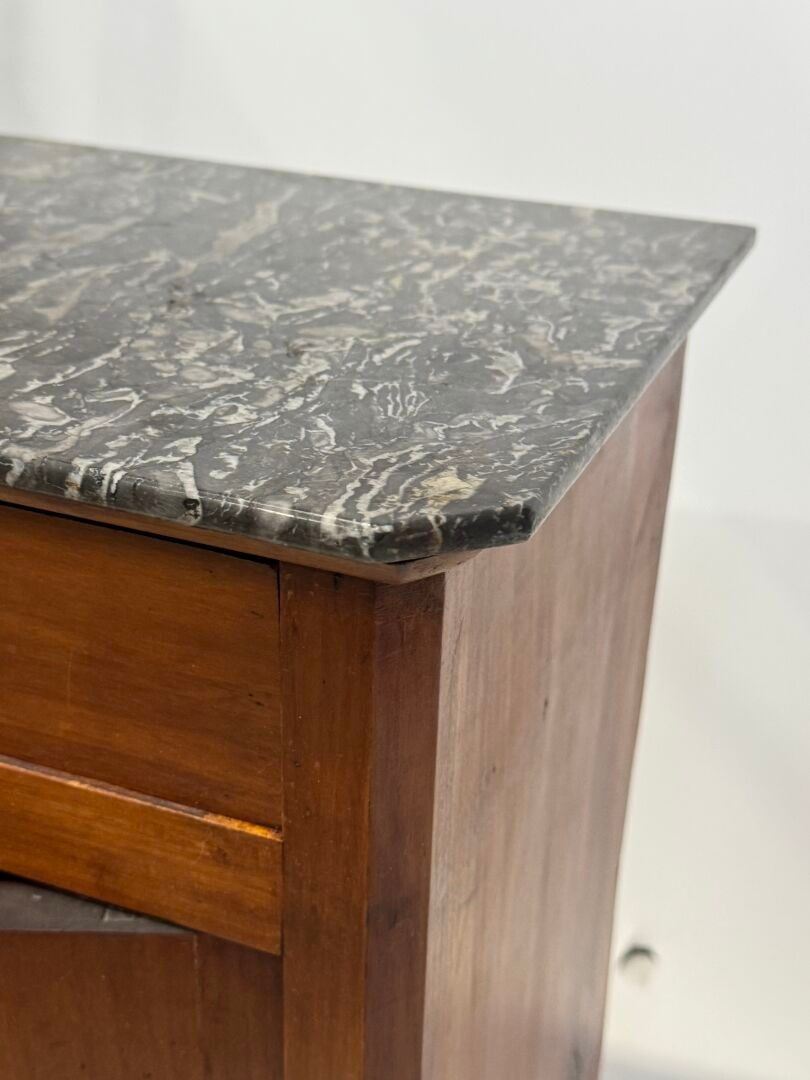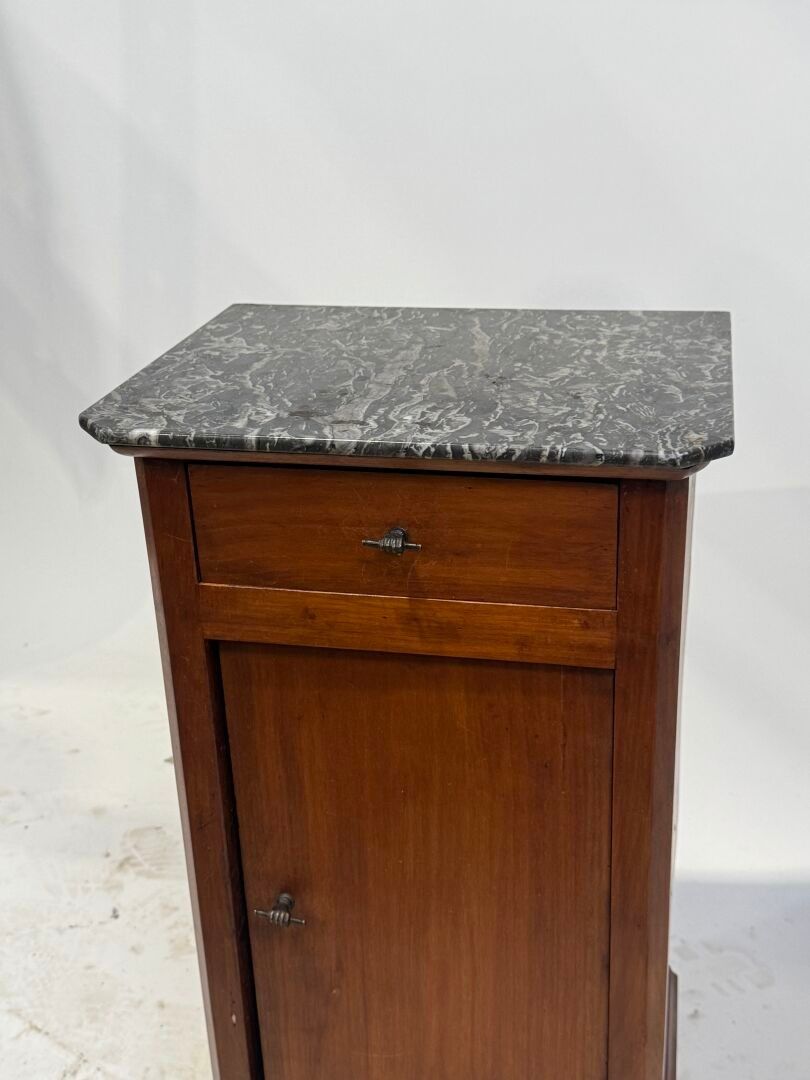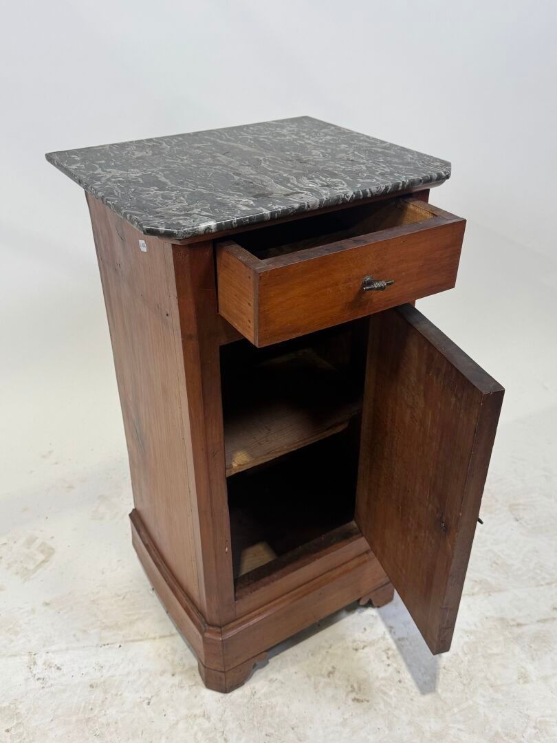 Moulded wood bedside cabinet opening with a drawer and a door, grey marble top, the pulls showing hands.