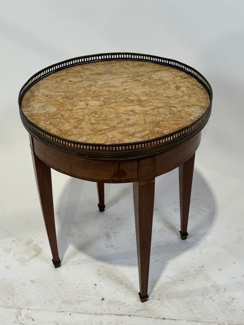 A small veneered "bouillotte" pedestal table with a yellow marble and openwork brass top. The legs are sheathed and terminate in hooves.