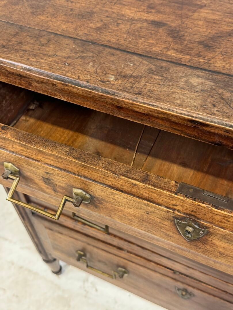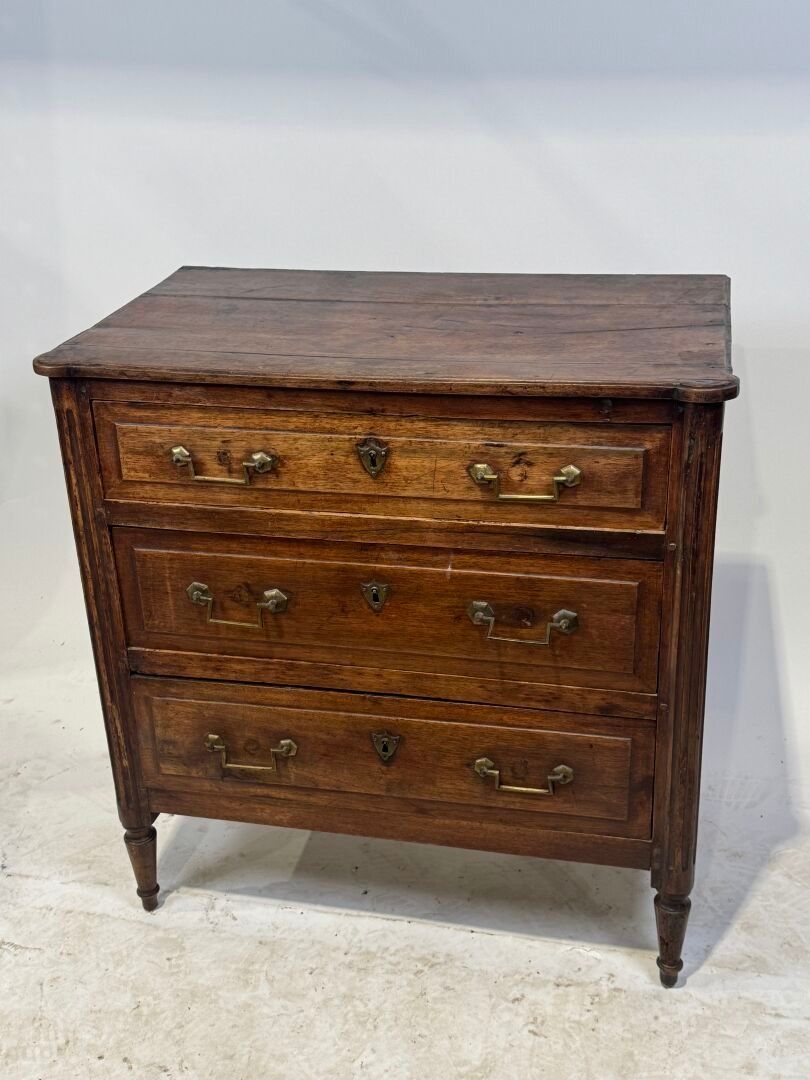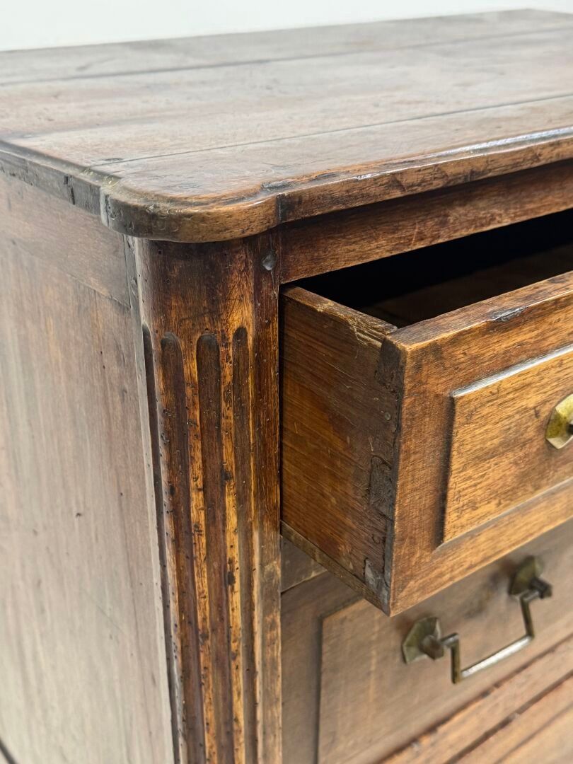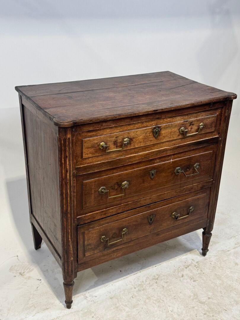 A moulded wooden chest of drawers with three drawers, fluted uprights and brass pull handles.
