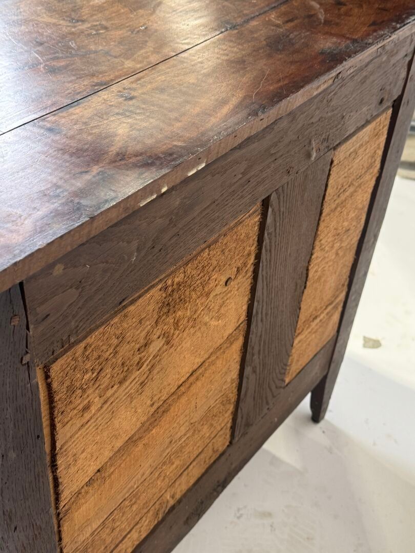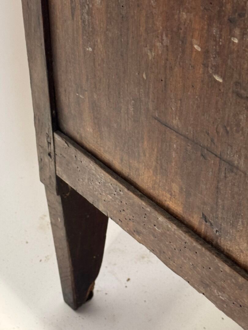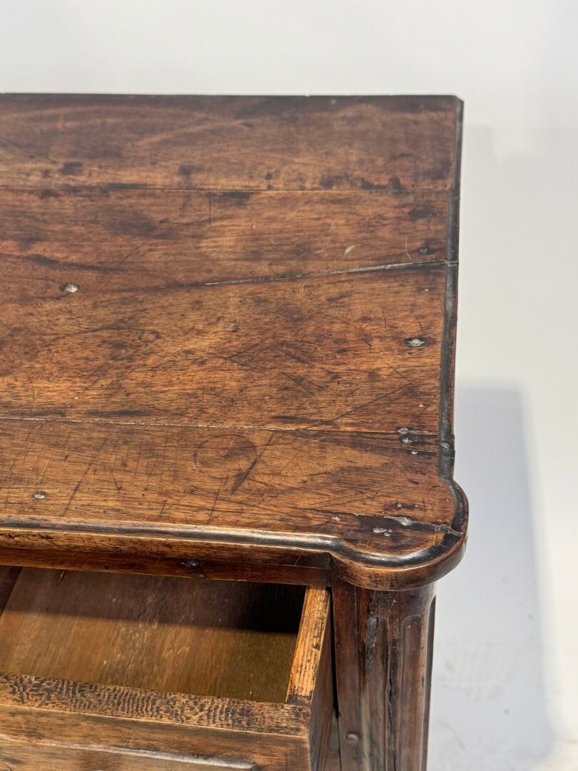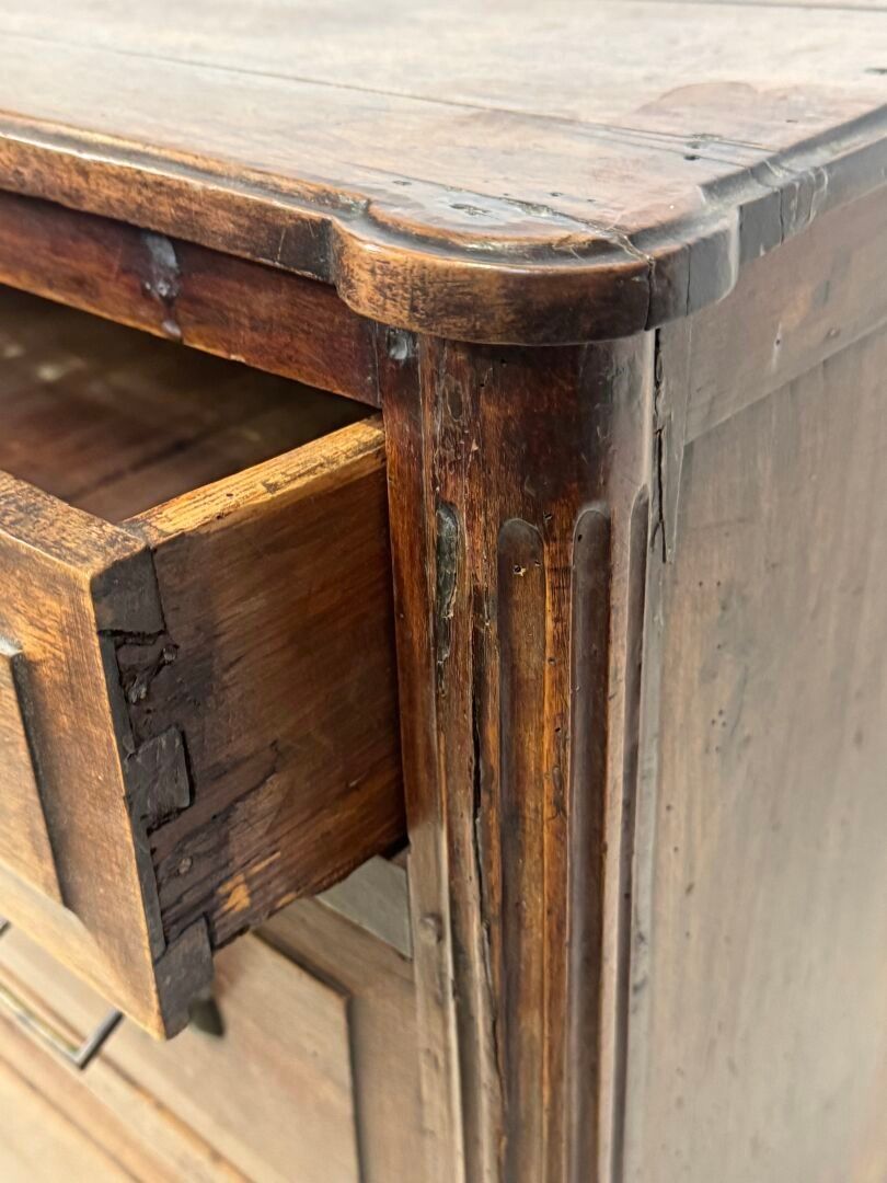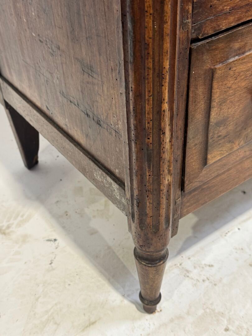 A moulded wooden chest of drawers with three drawers, fluted uprights and brass pull handles.