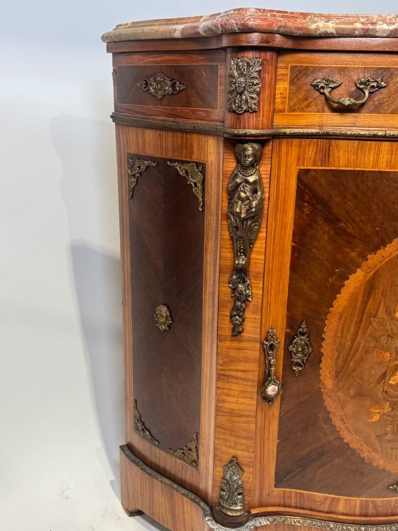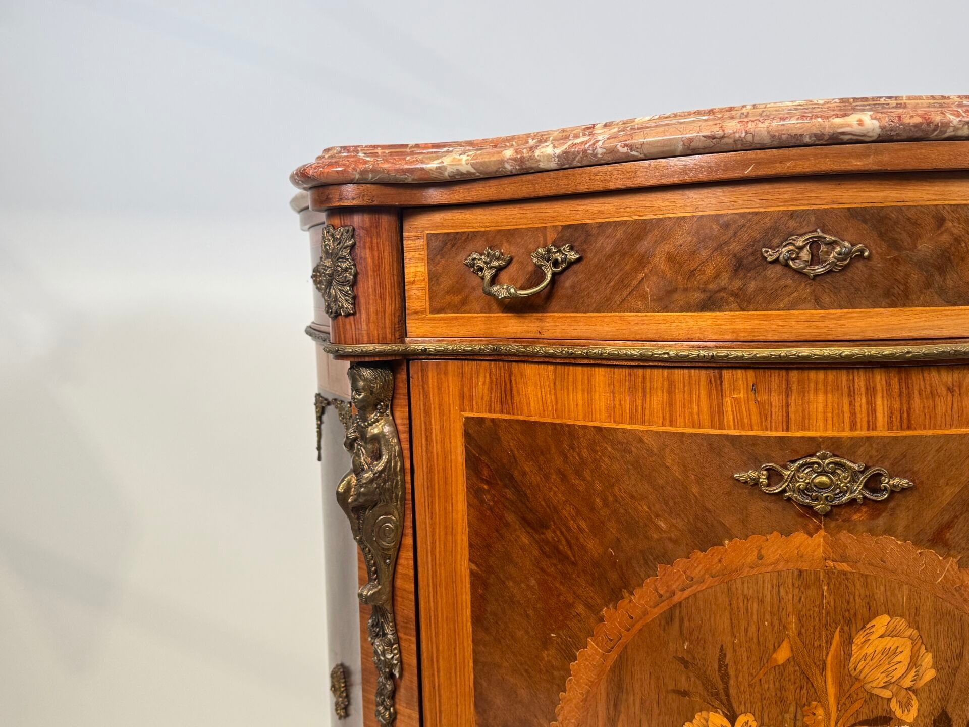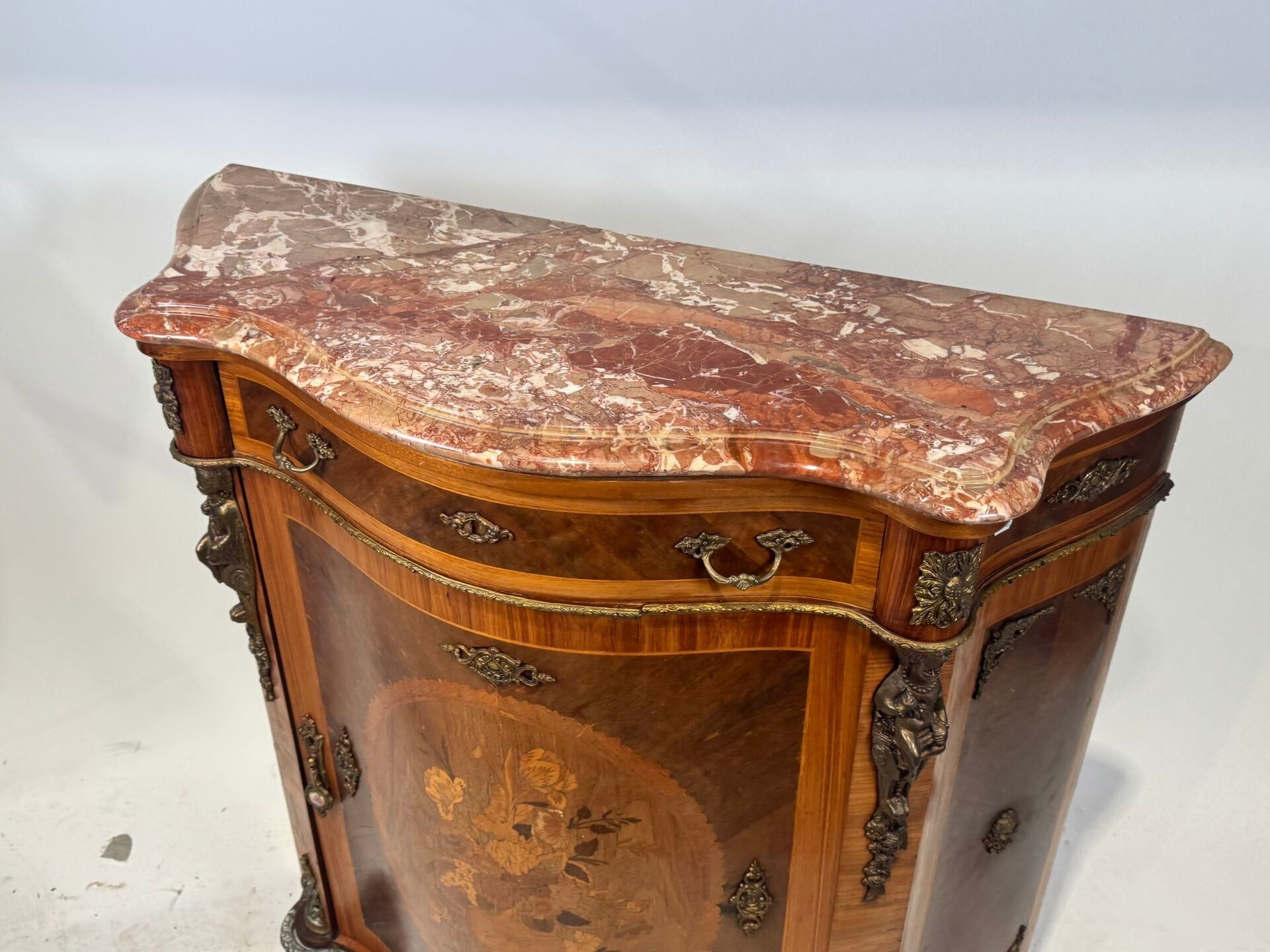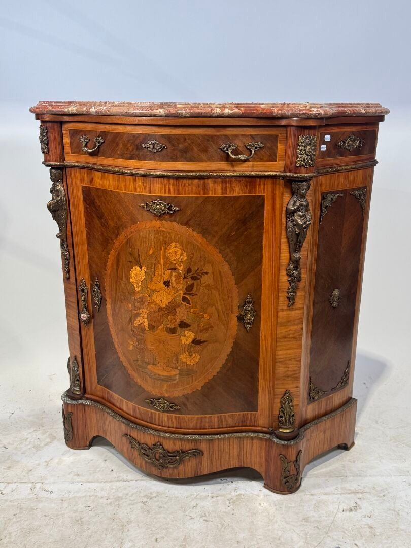 Wood and marquetry cabinet opening with a door and a drawer. The front is decorated with a floral basin, the uprights with stylised figures, marble top.