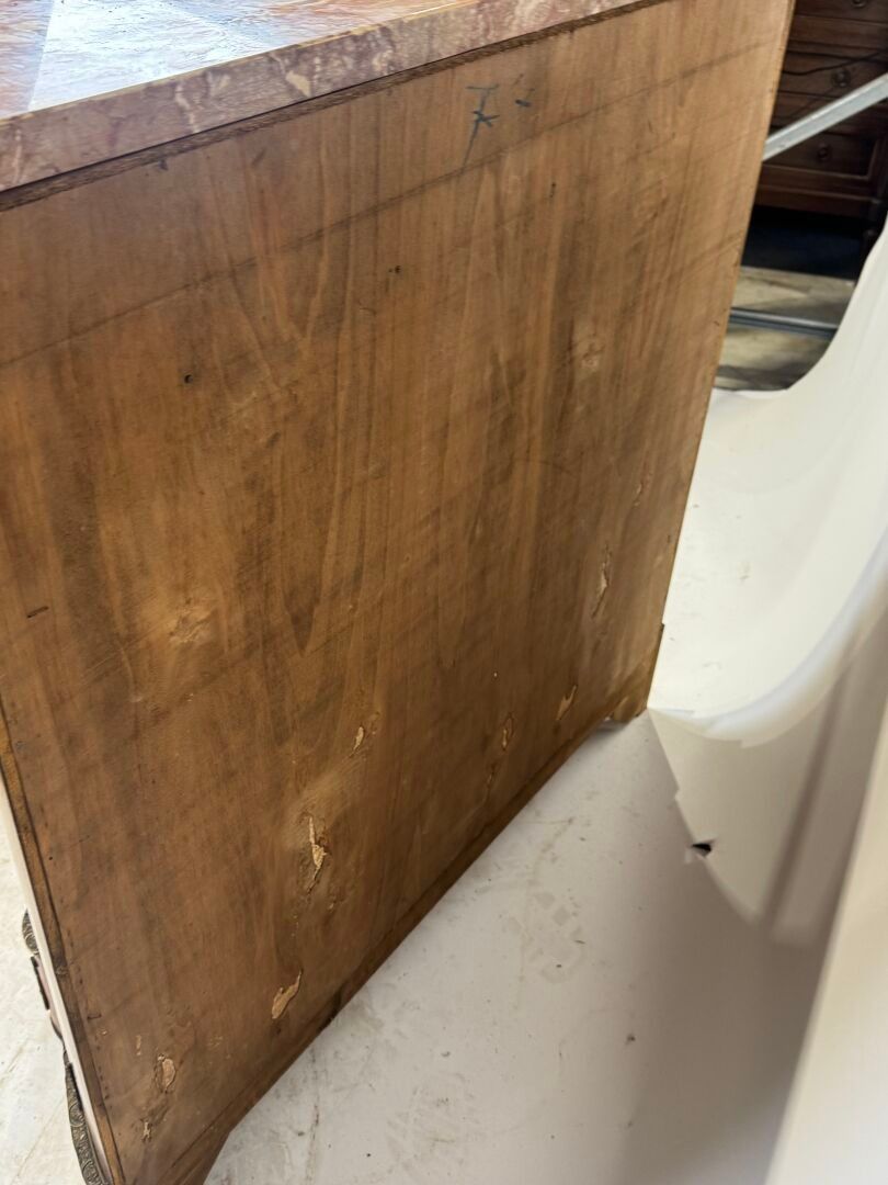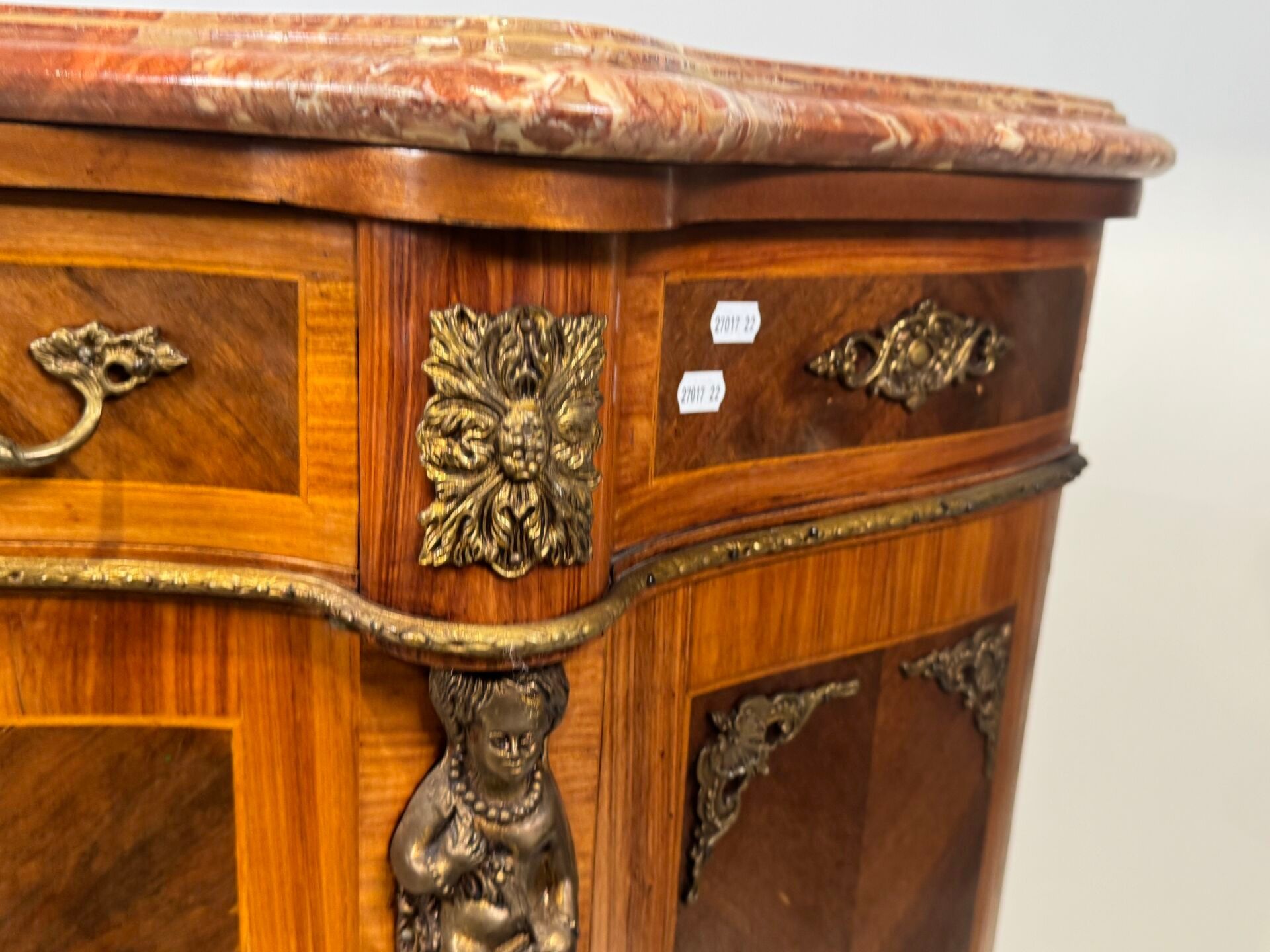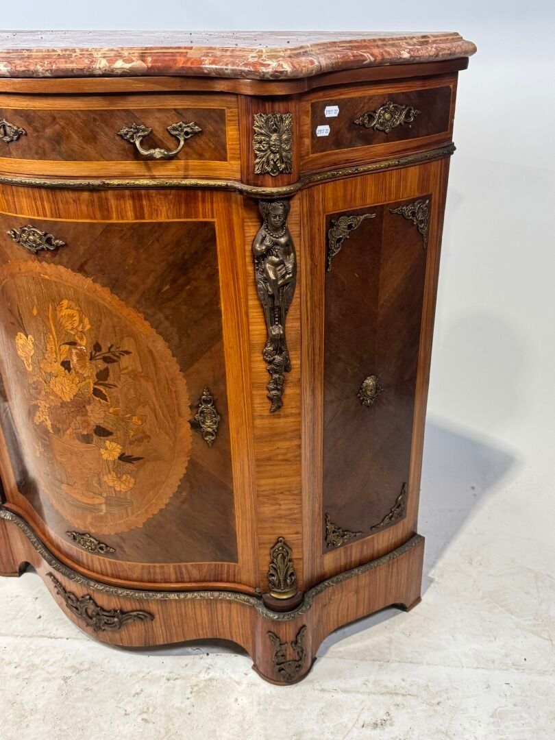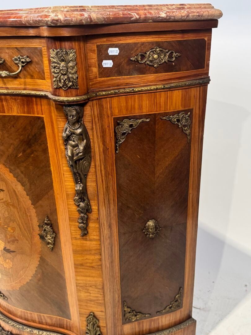 Wood and marquetry cabinet opening with a door and a drawer. The front is decorated with a floral basin, the uprights with stylised figures, marble top.