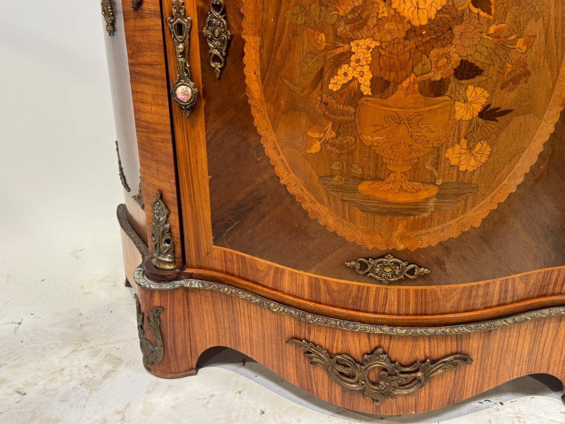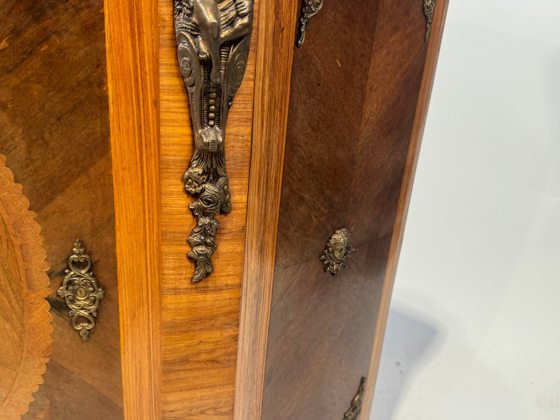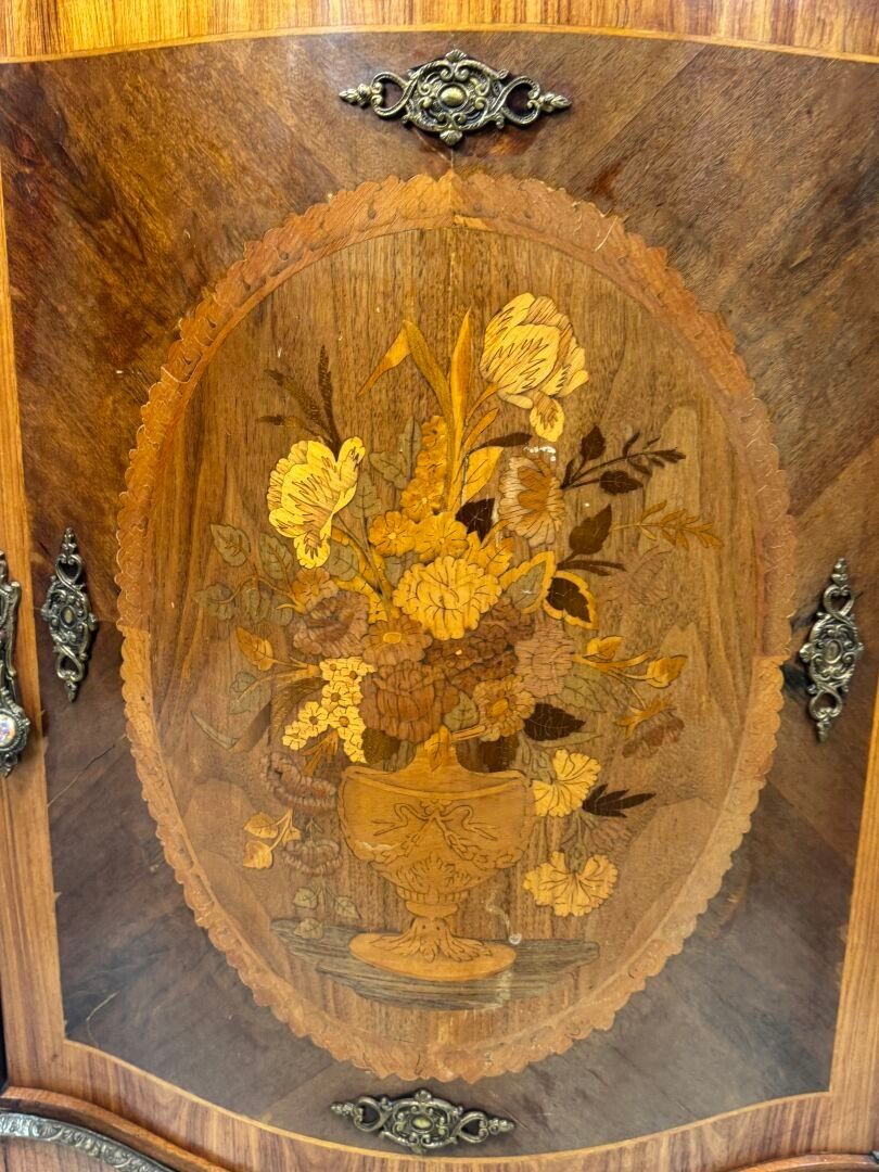 Wood and marquetry cabinet opening with a door and a drawer.…