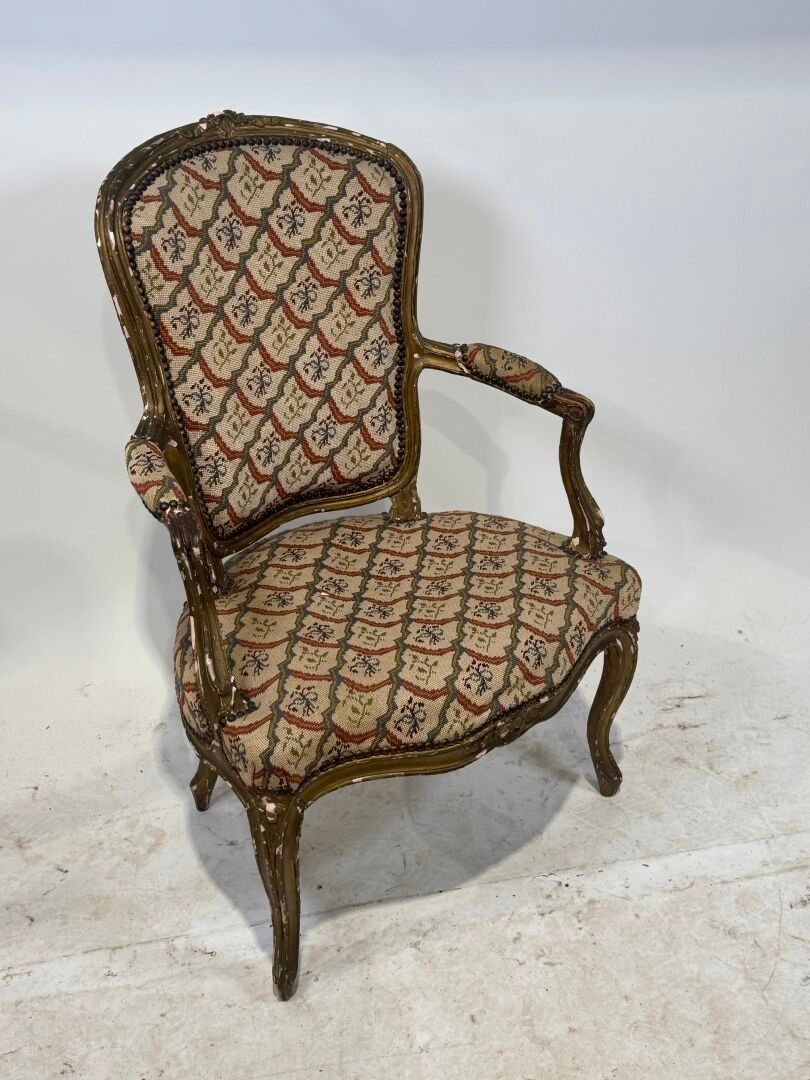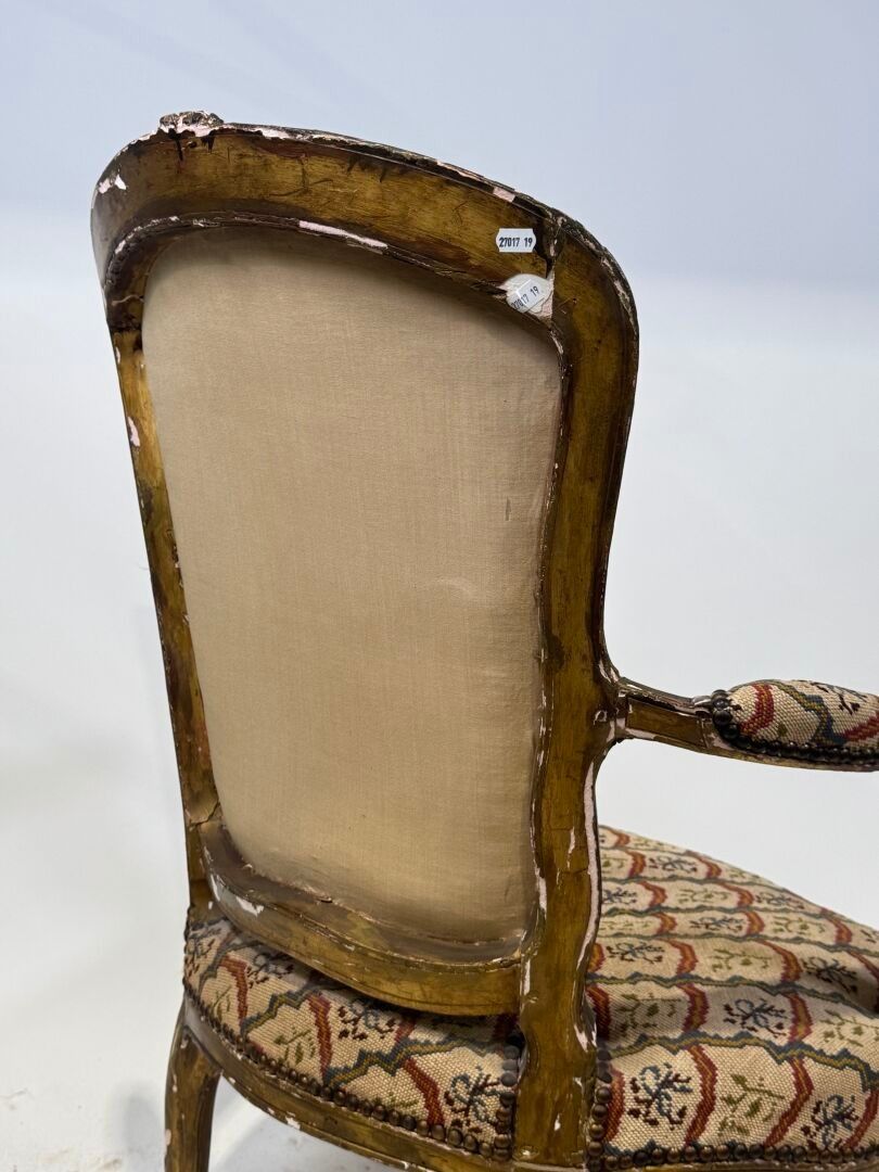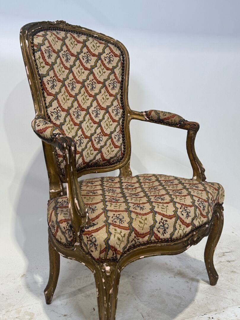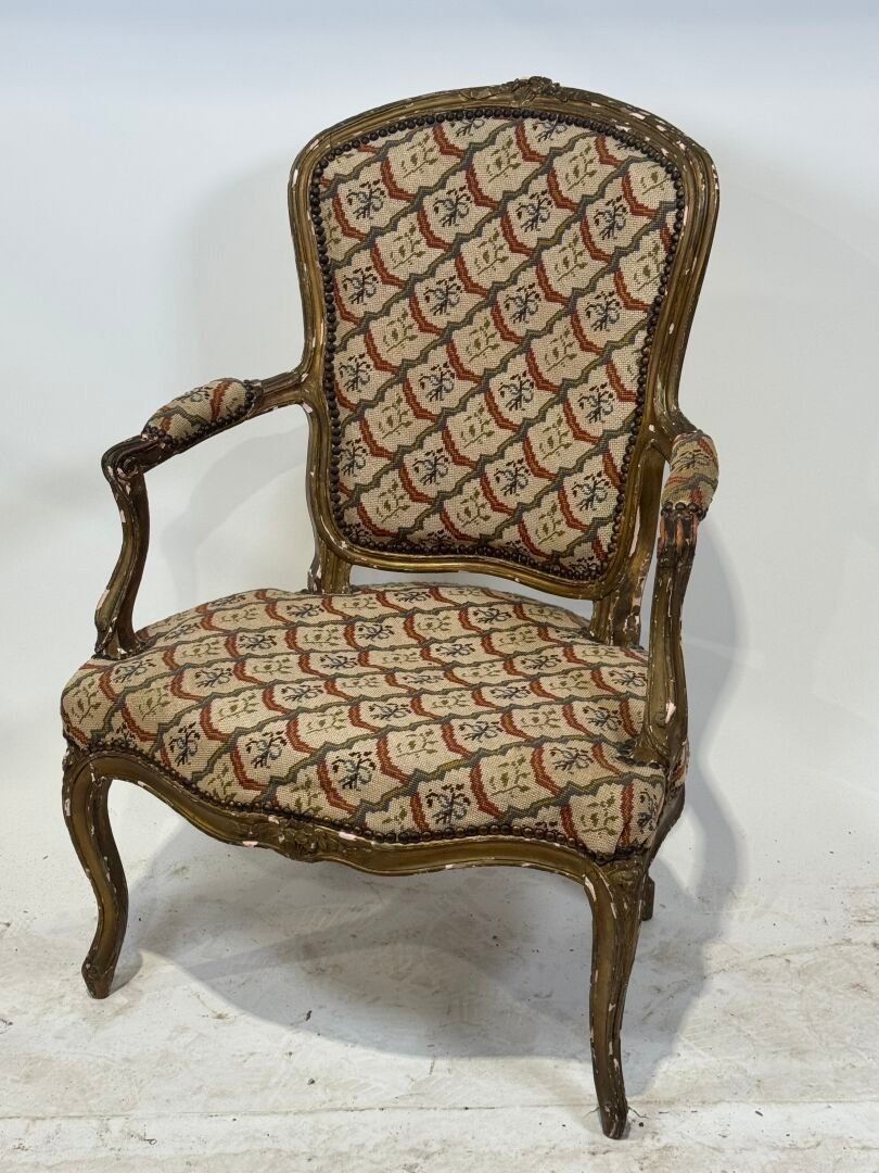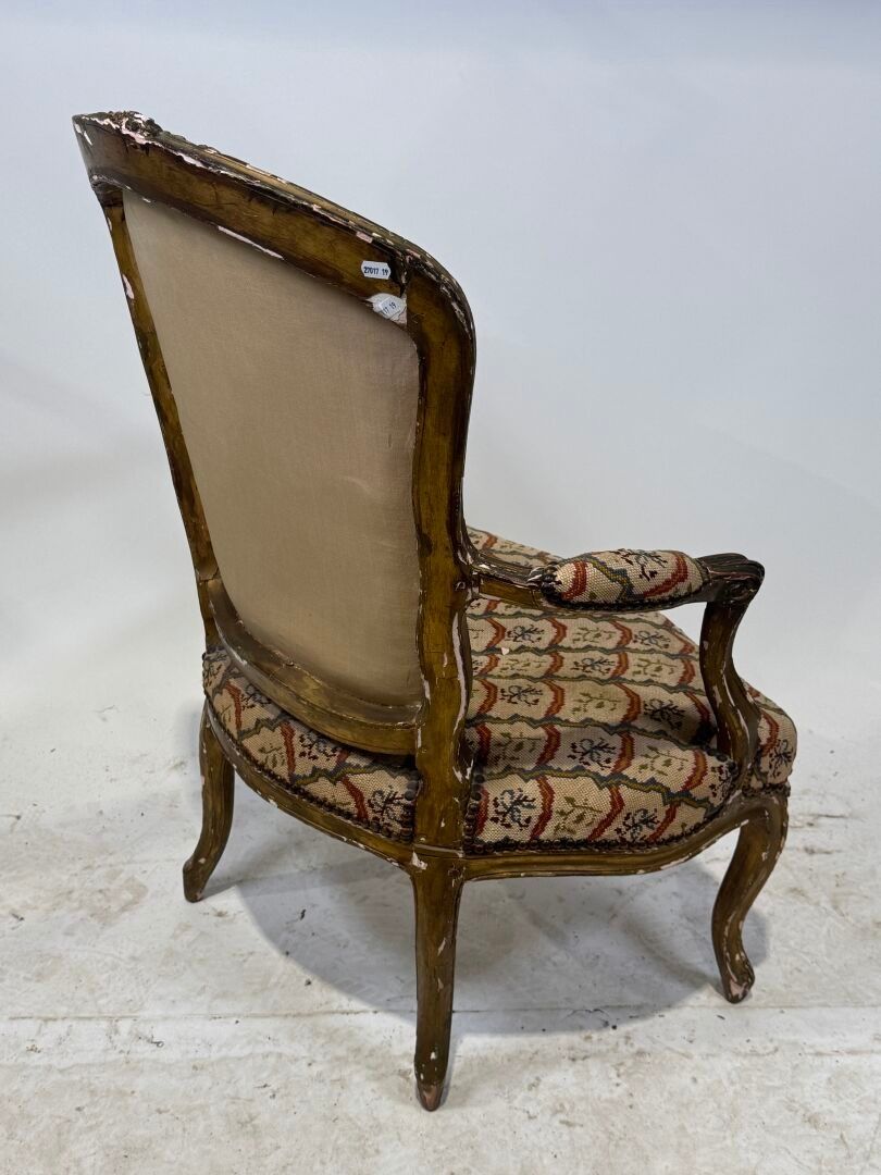 Armchair in moulded, carved and gilded wood, the back slightly cabriolet, the armrests with cuffs, the legs arched.