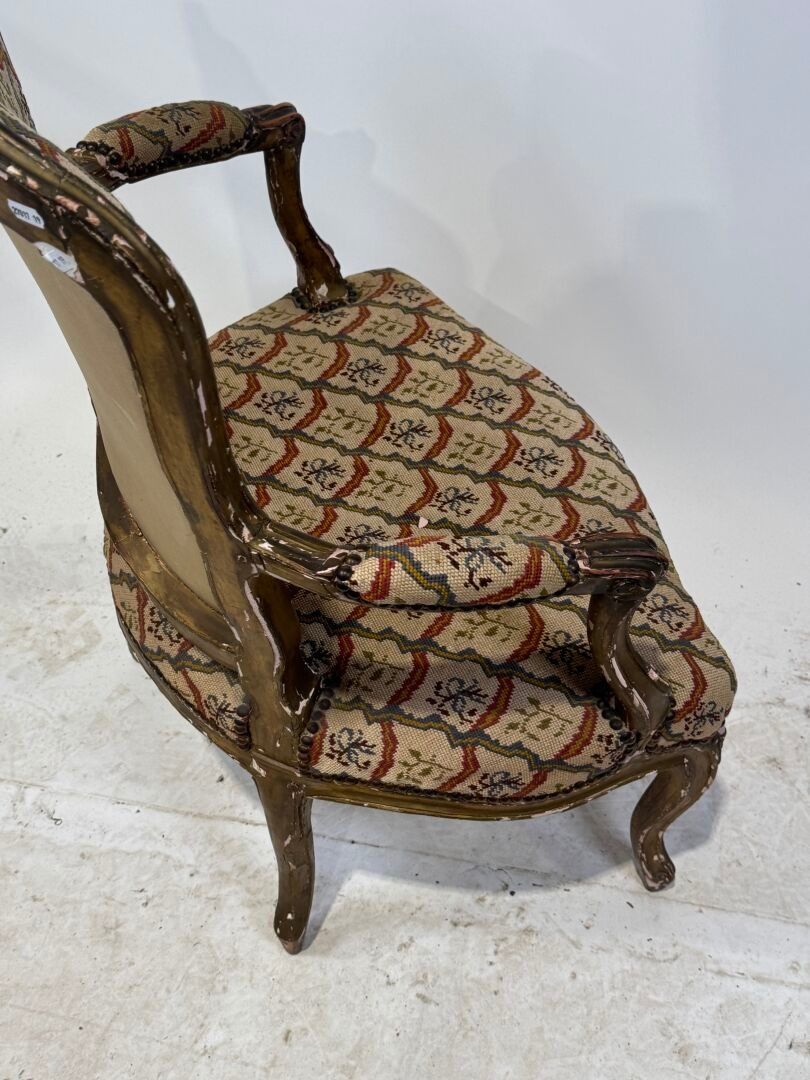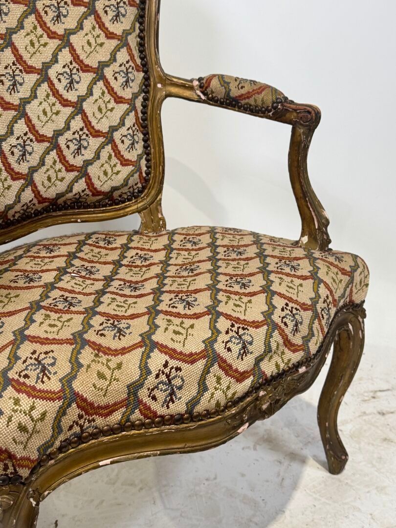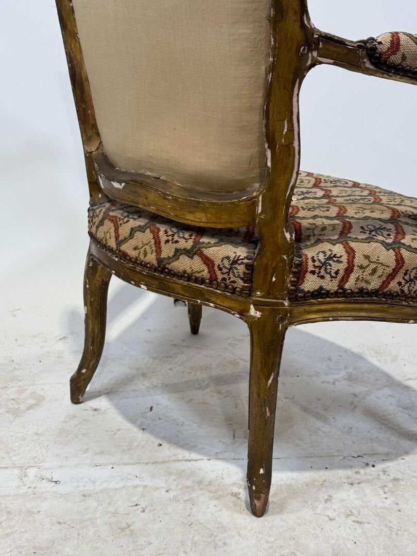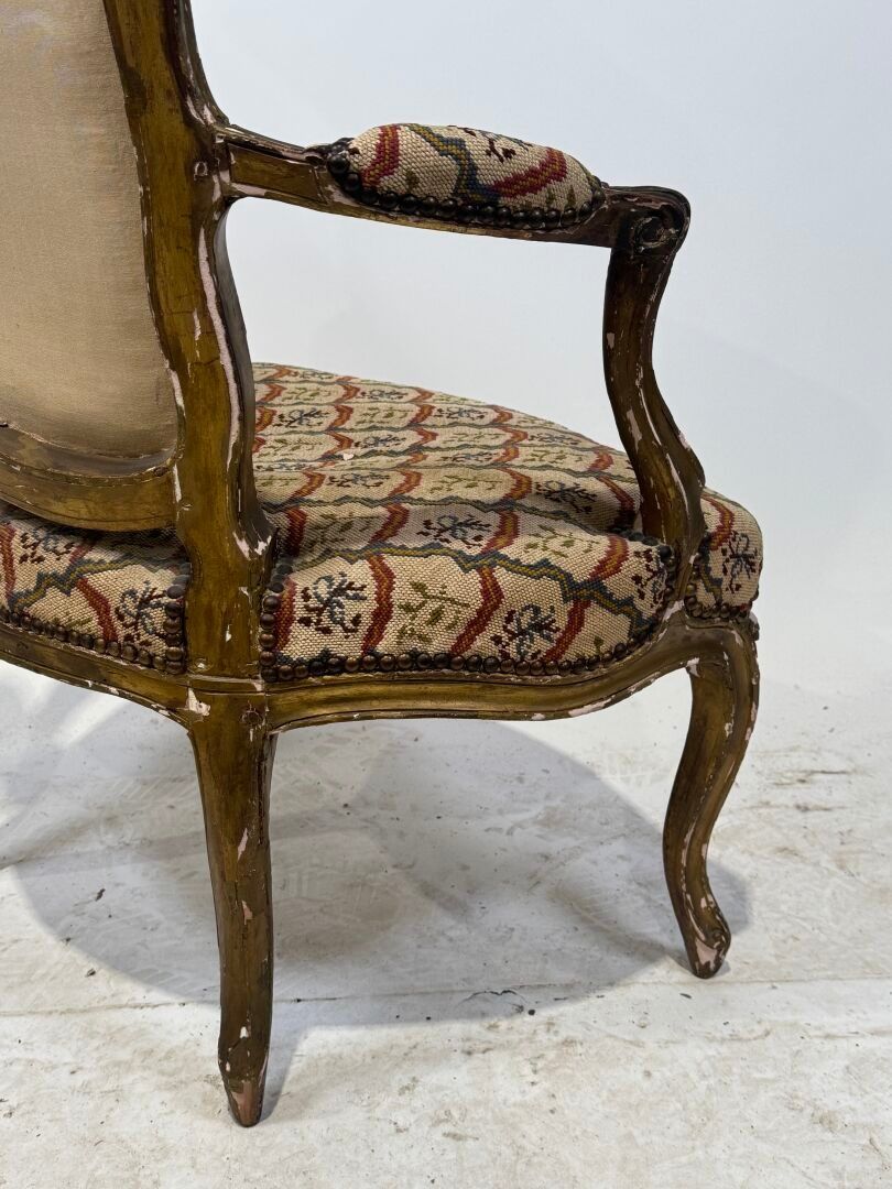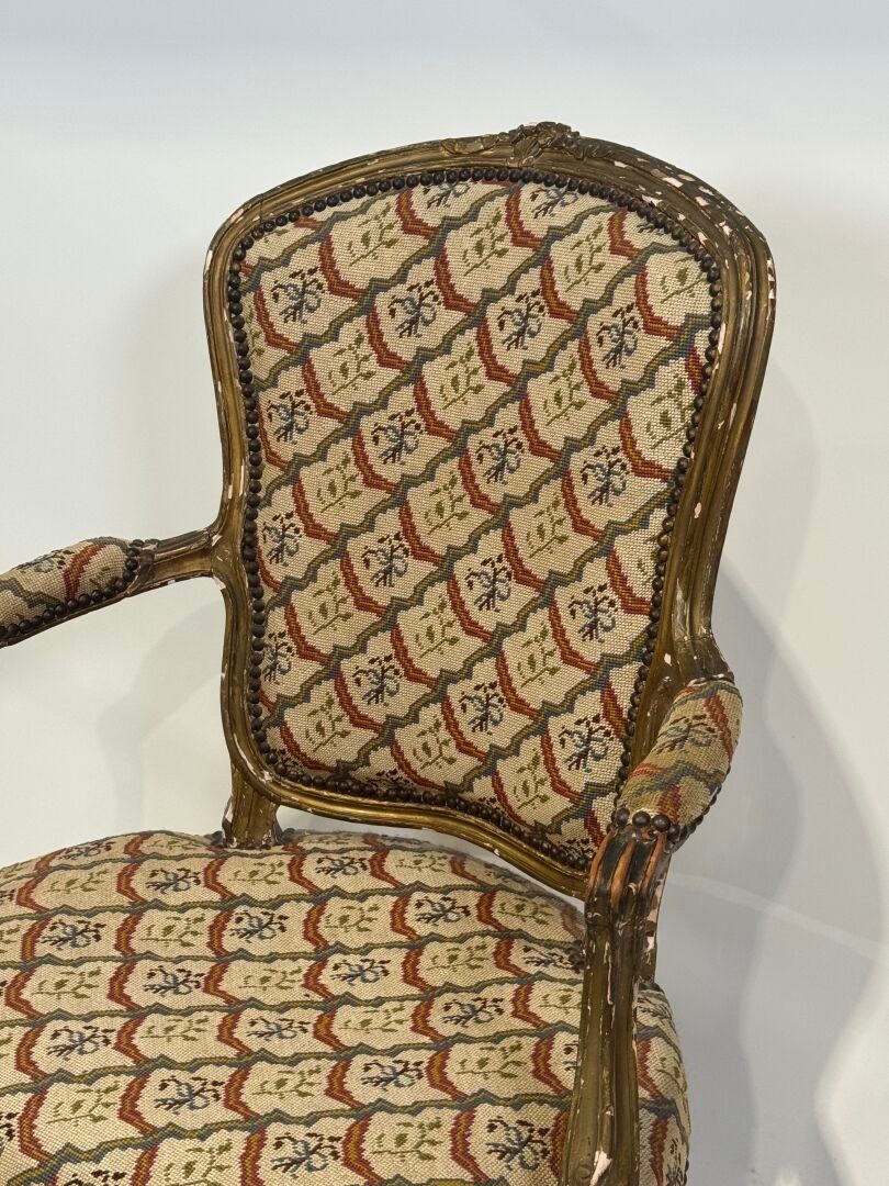Armchair in moulded, carved and gilded wood, the back slightly cabriolet, the armrests with cuffs, the legs arched.