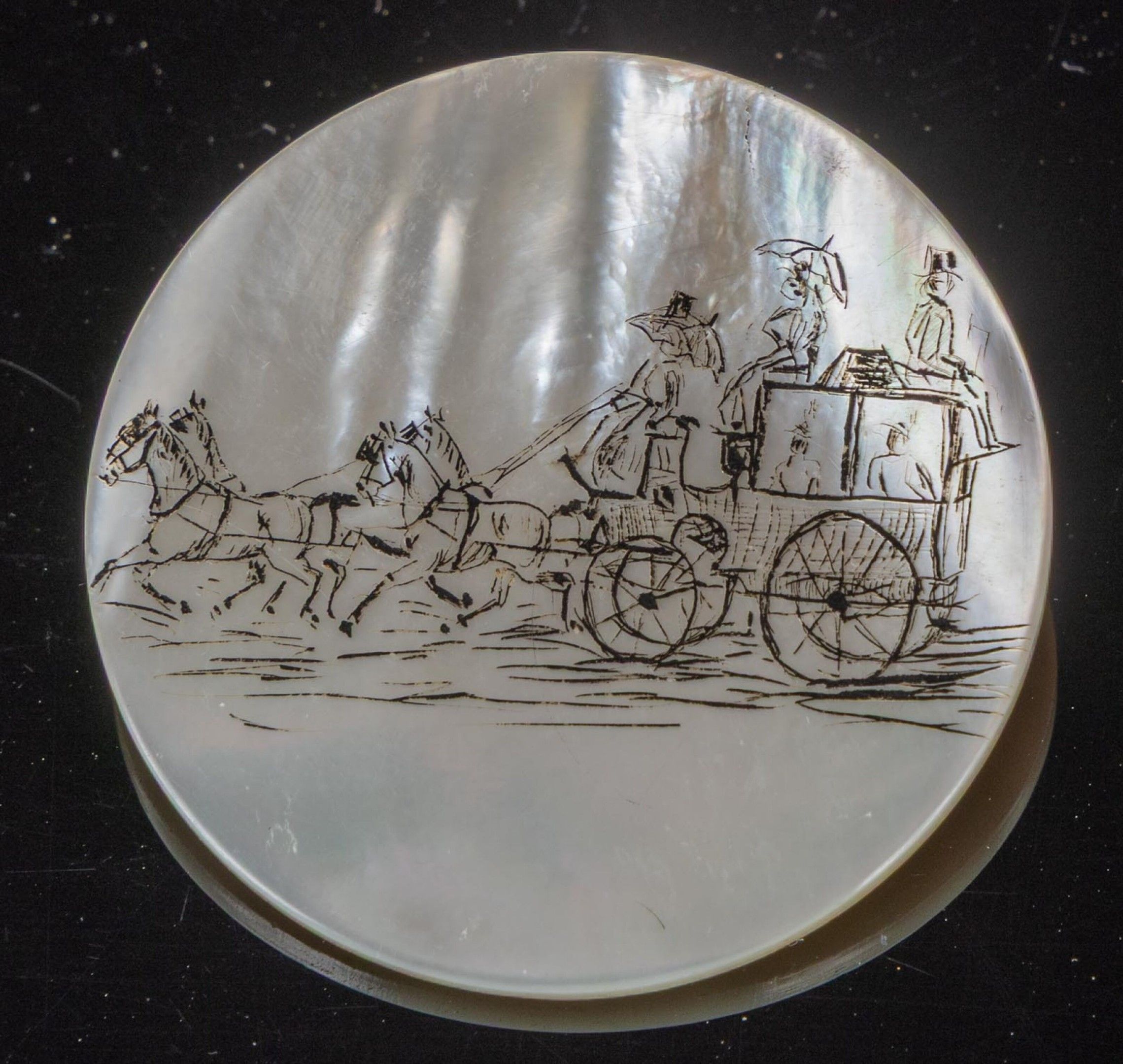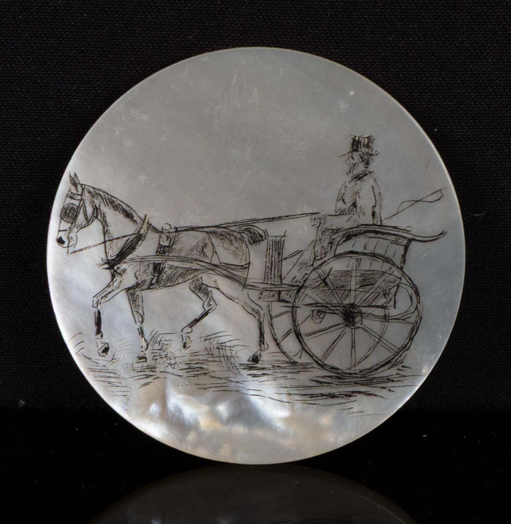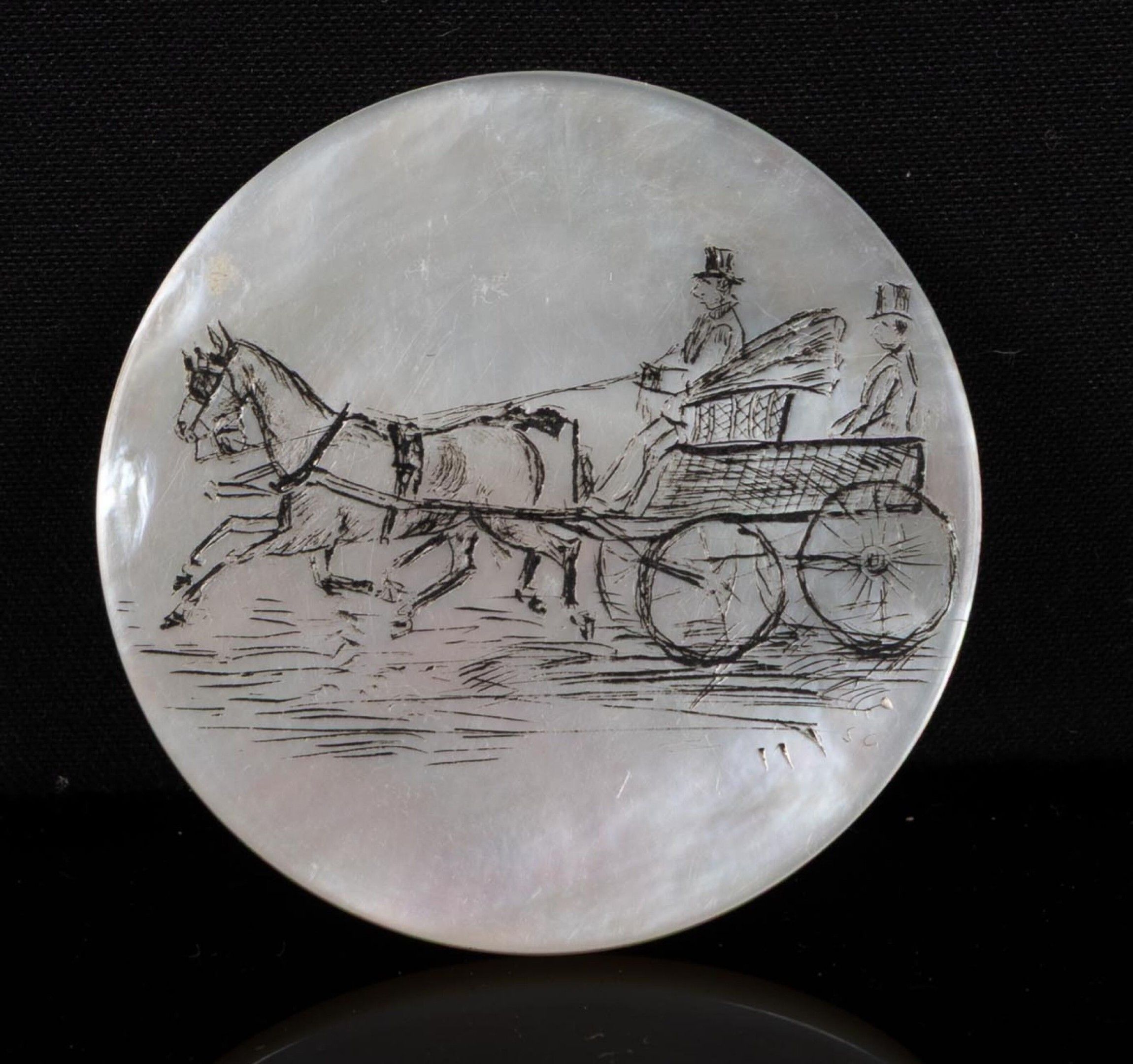 Six mother-of-pearl buttons engraved with horse-drawn vehicl…