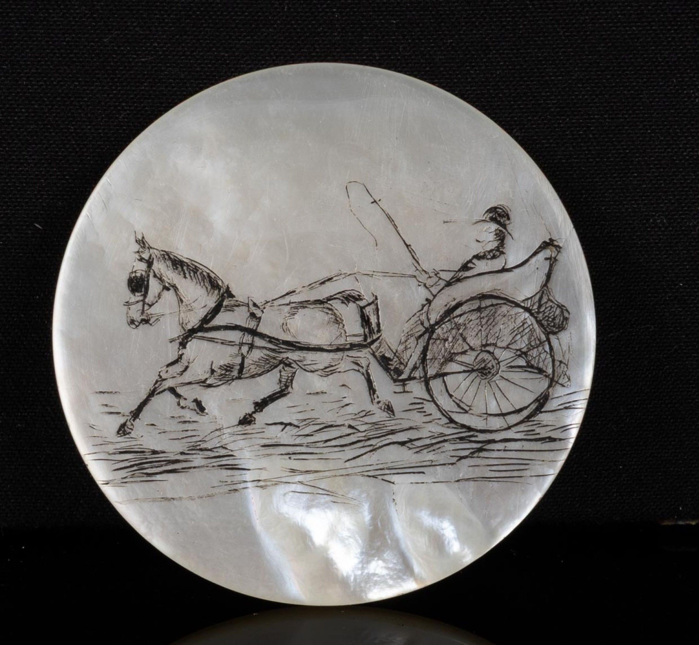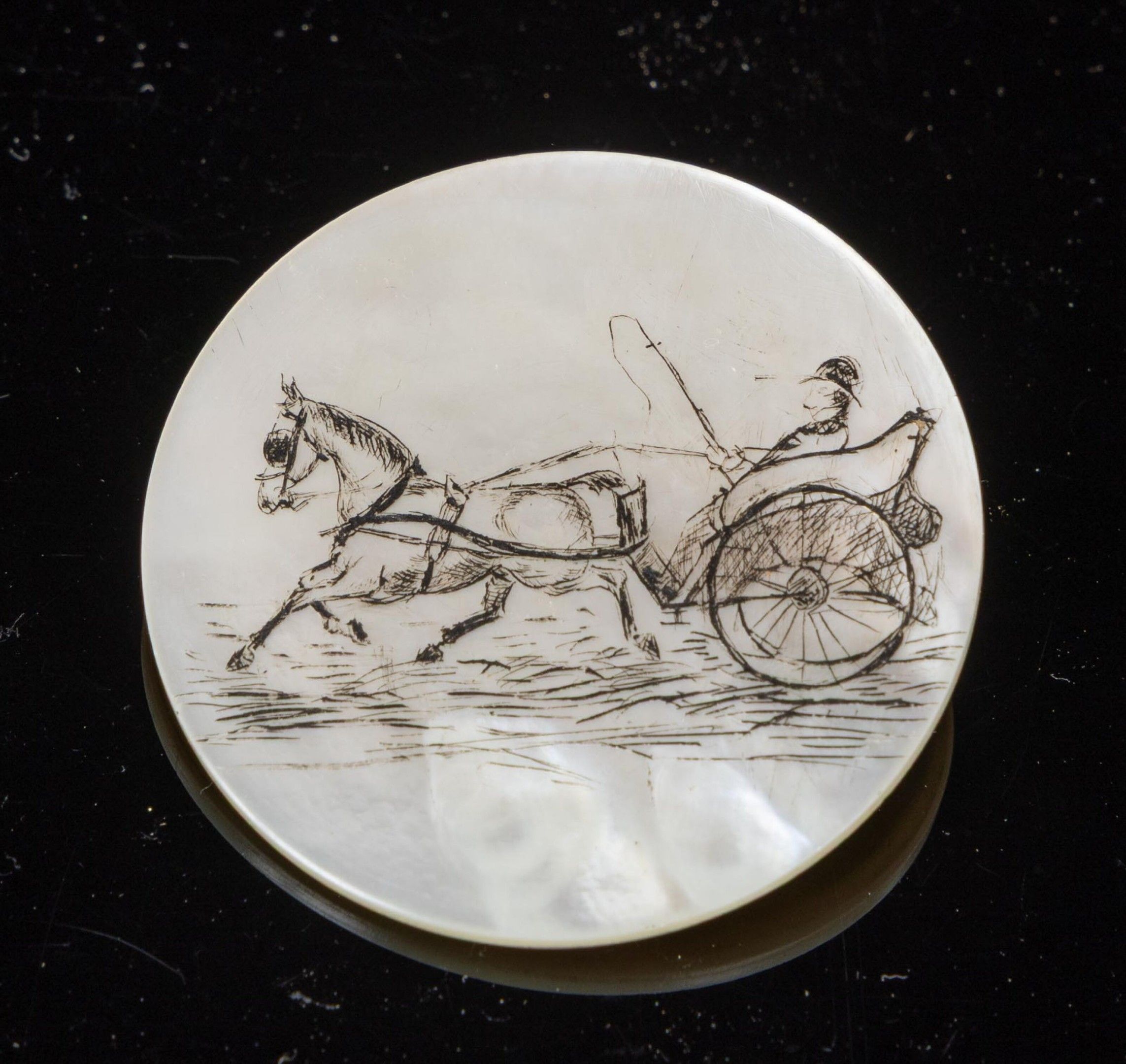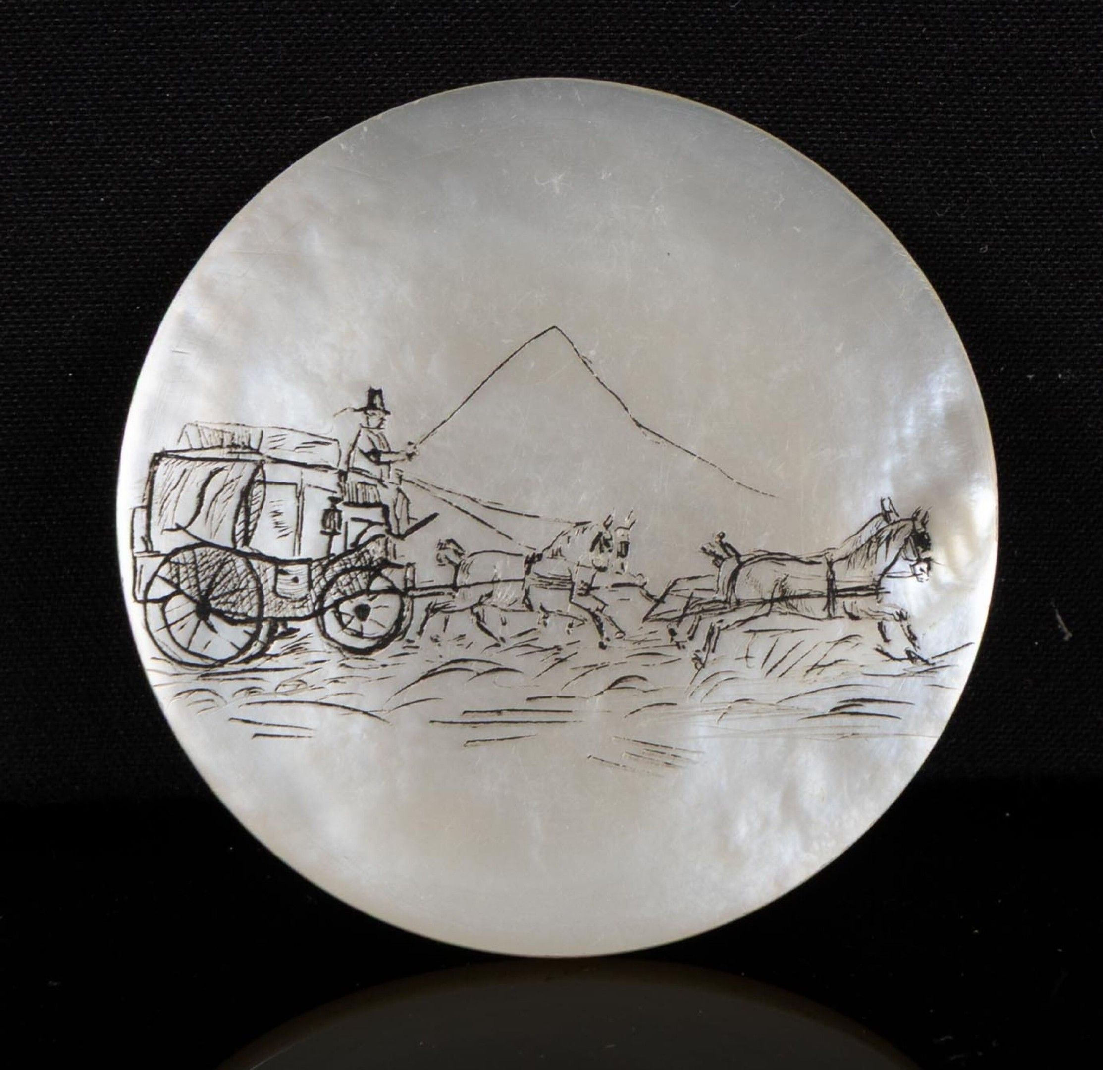 Six mother-of-pearl buttons engraved with horse-drawn vehicl…