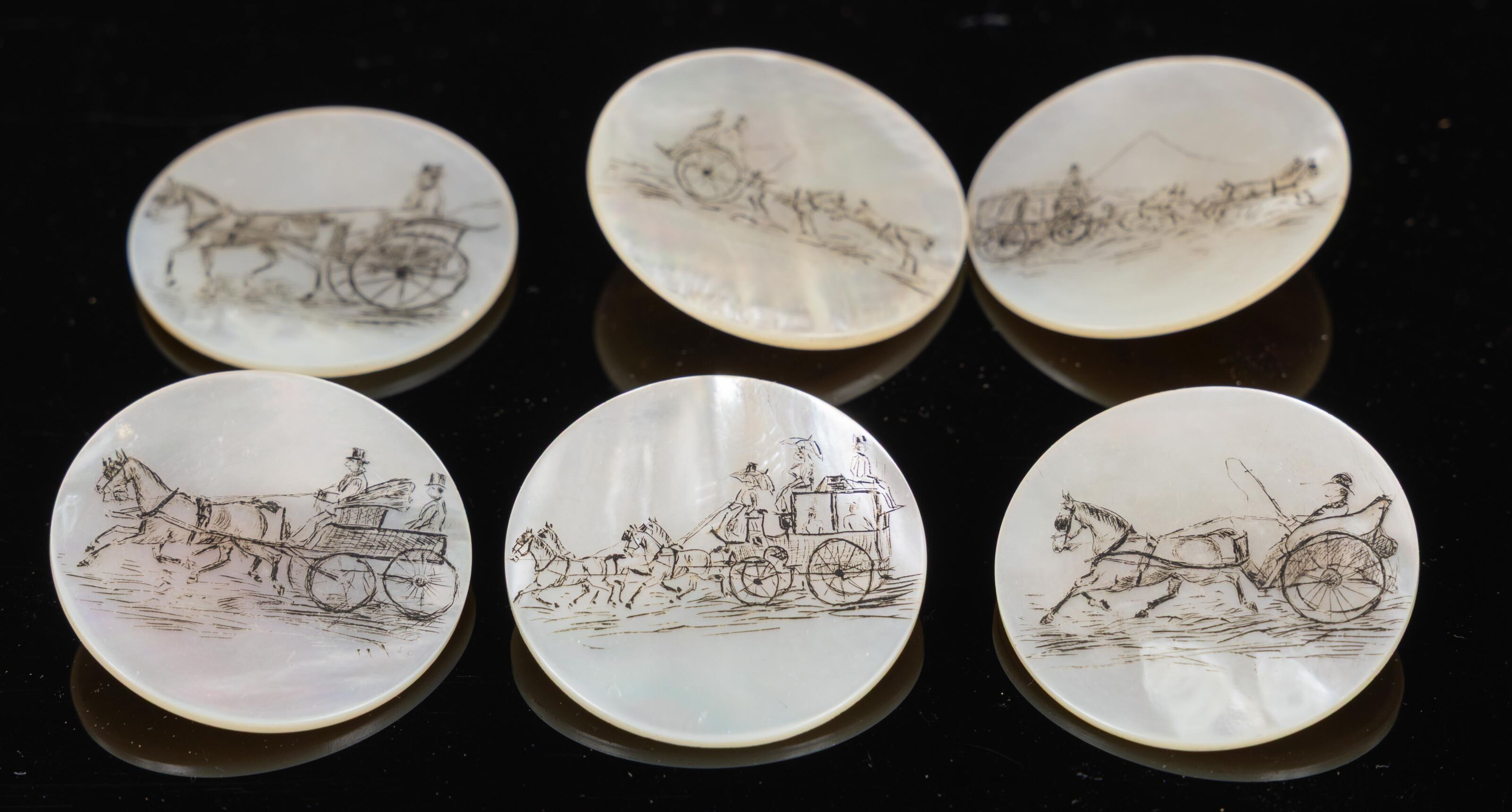 Six mother-of-pearl buttons engraved with horse-drawn vehicles.
