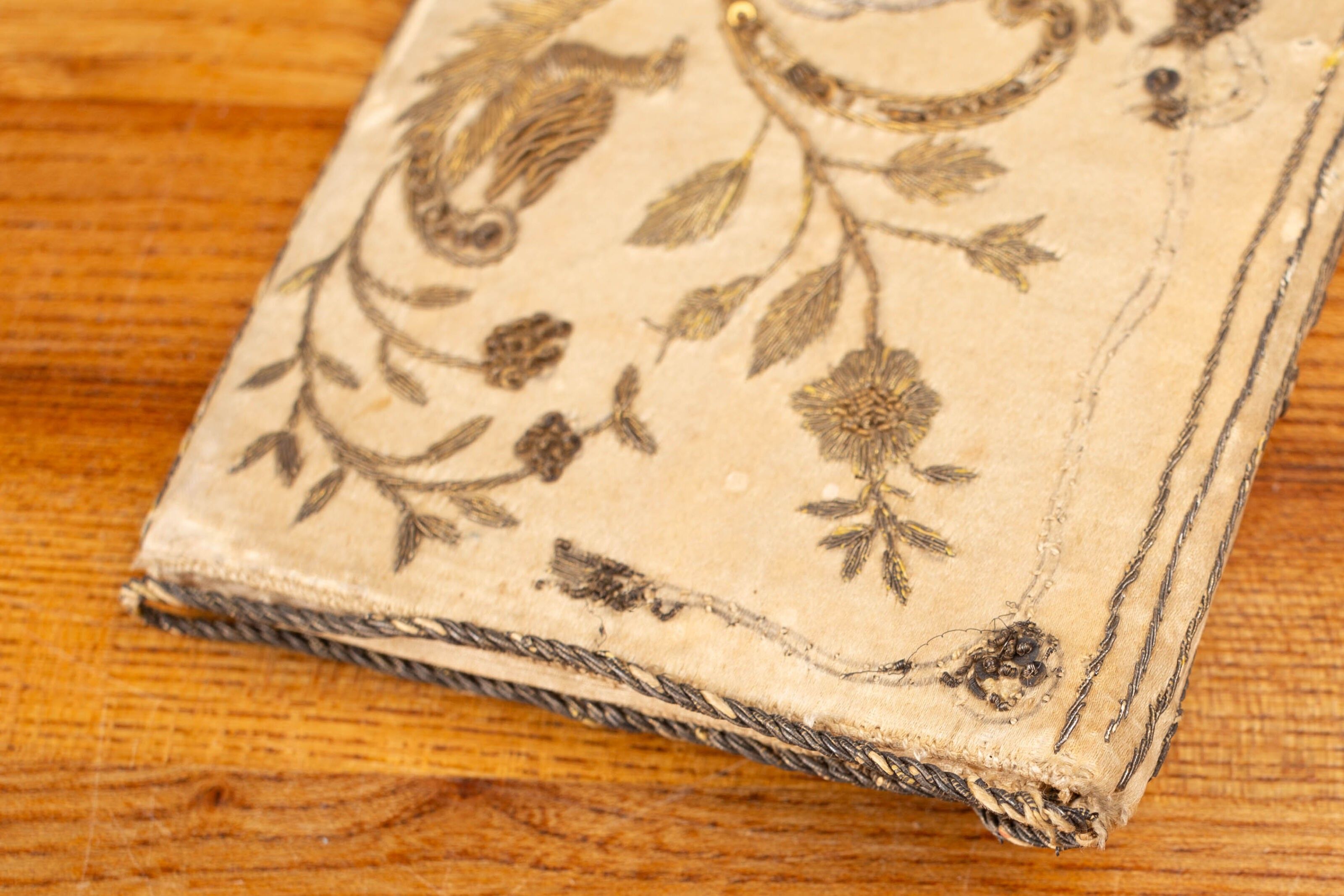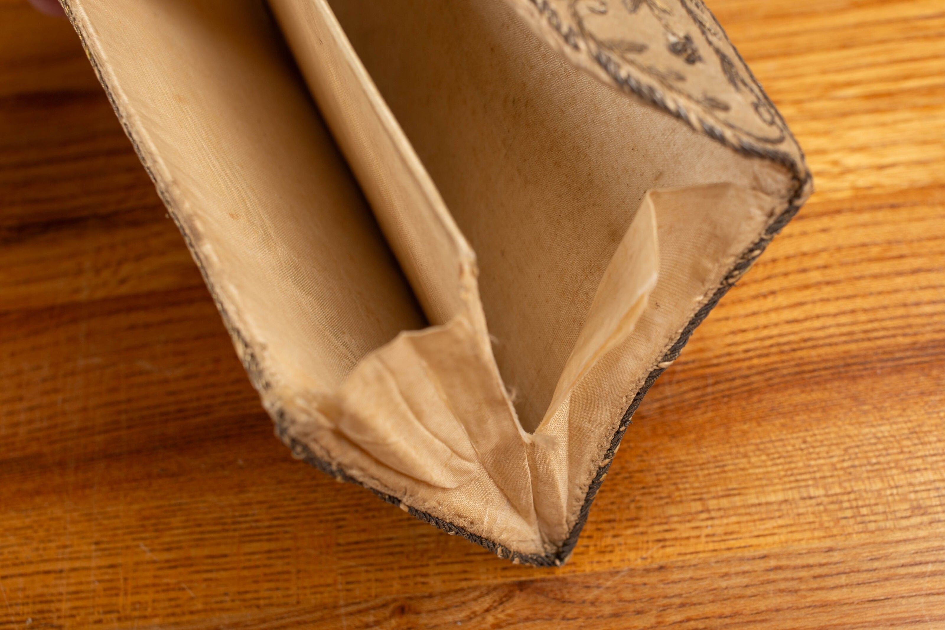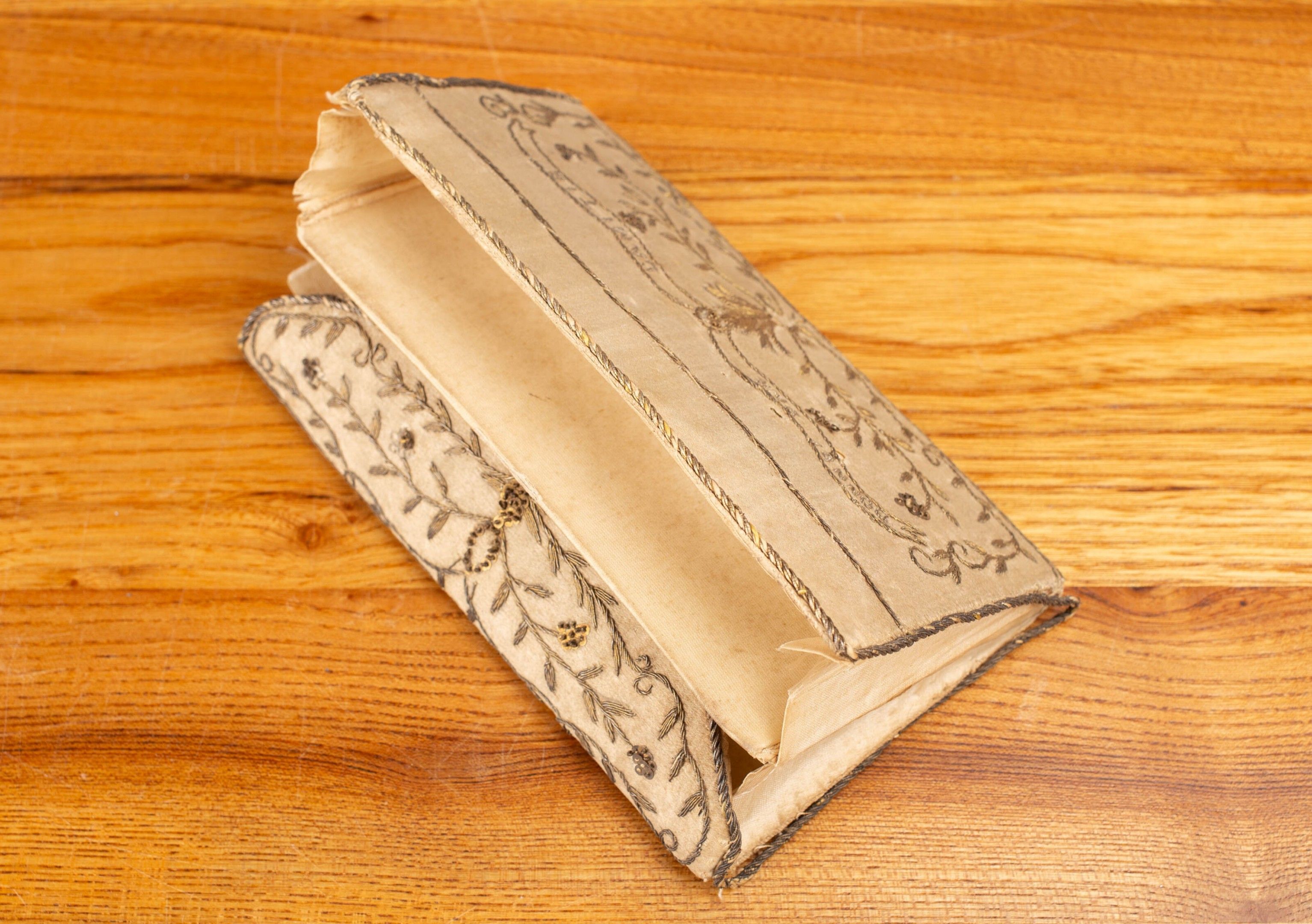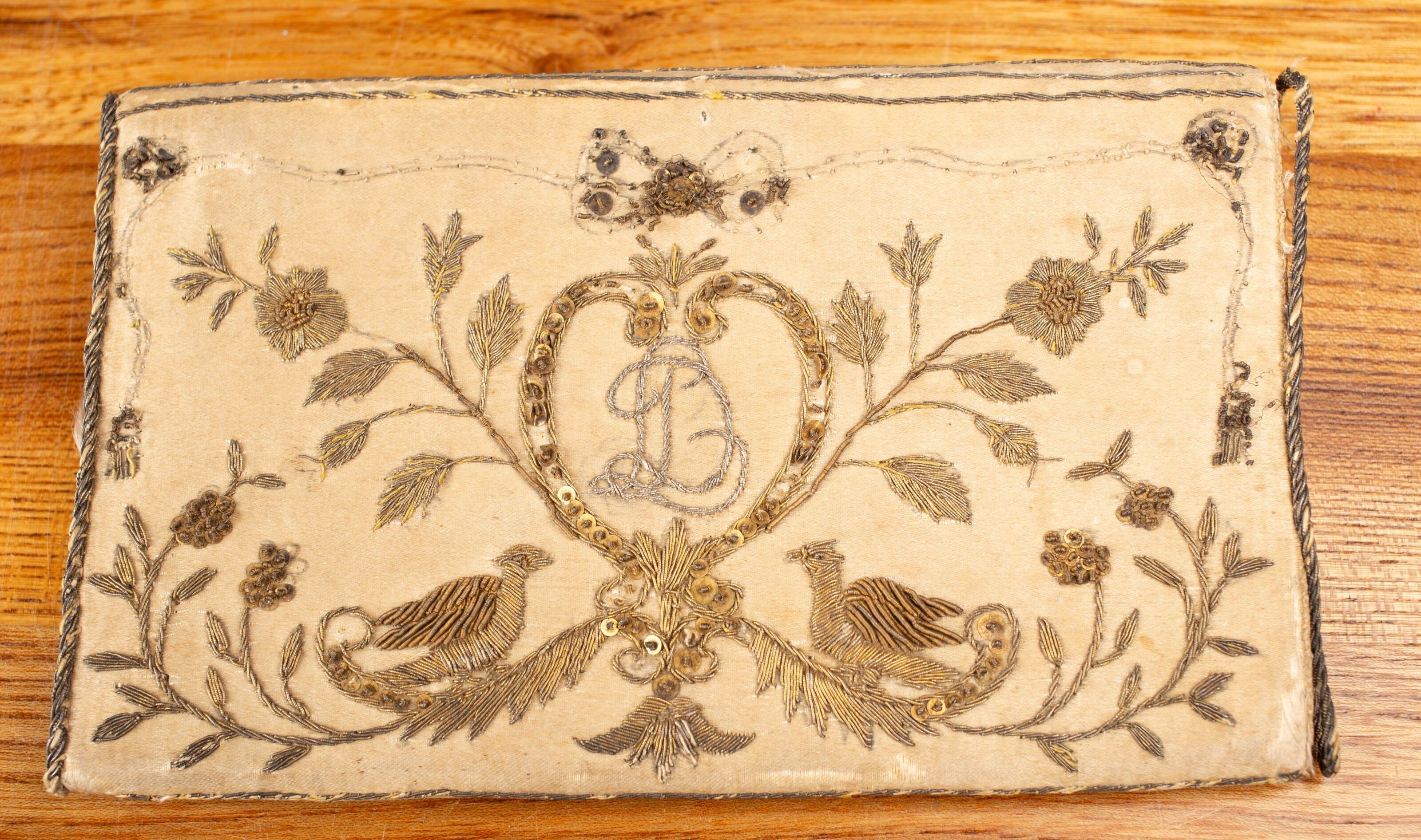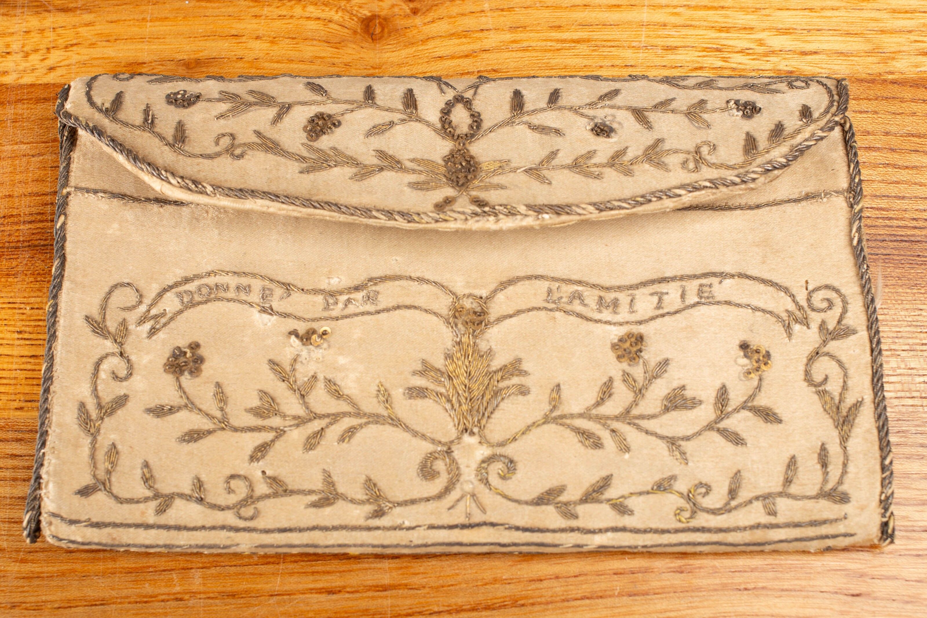 Wallet in fabric embroidered with metallic threads and sequins "given by friendship".