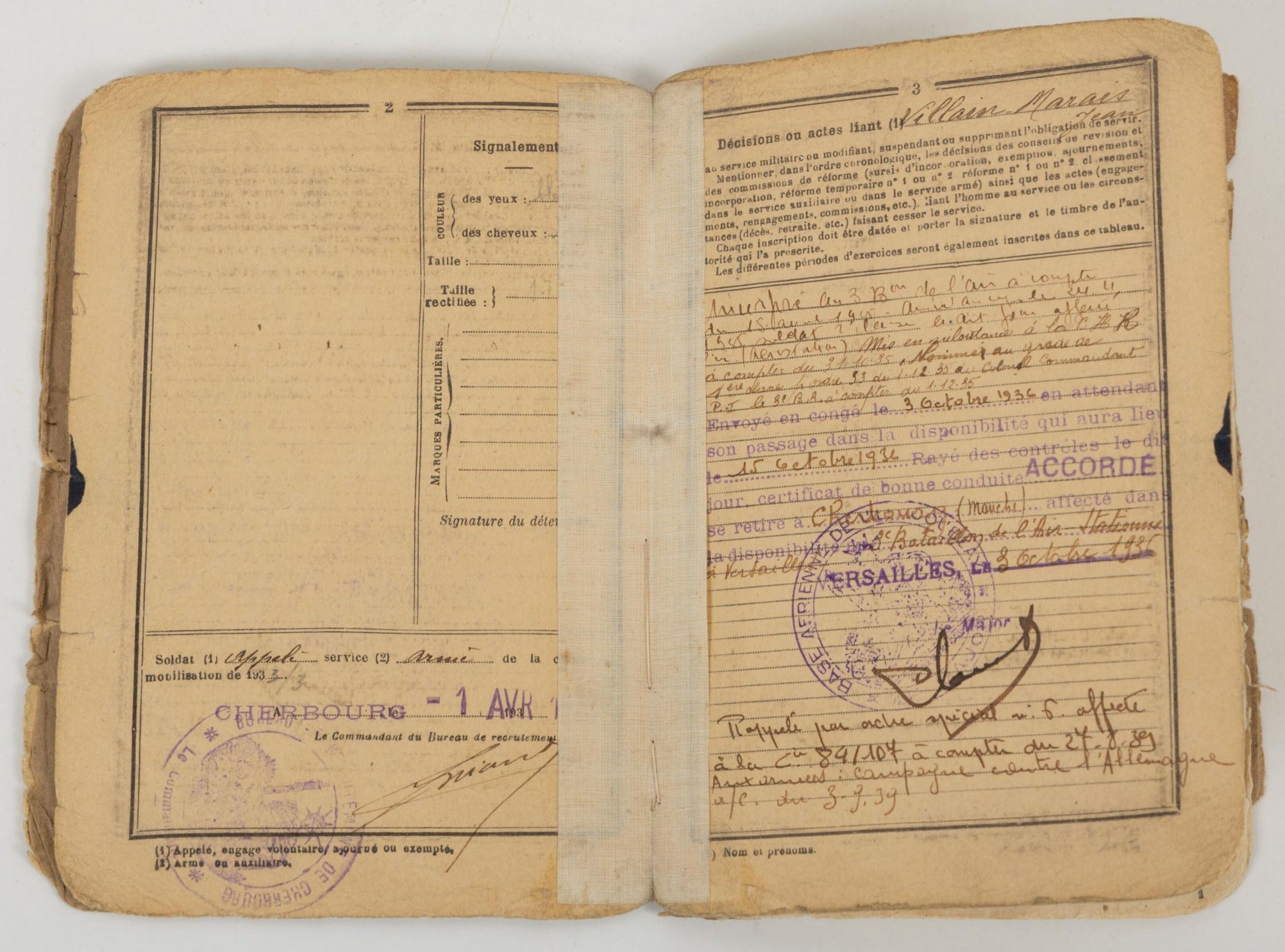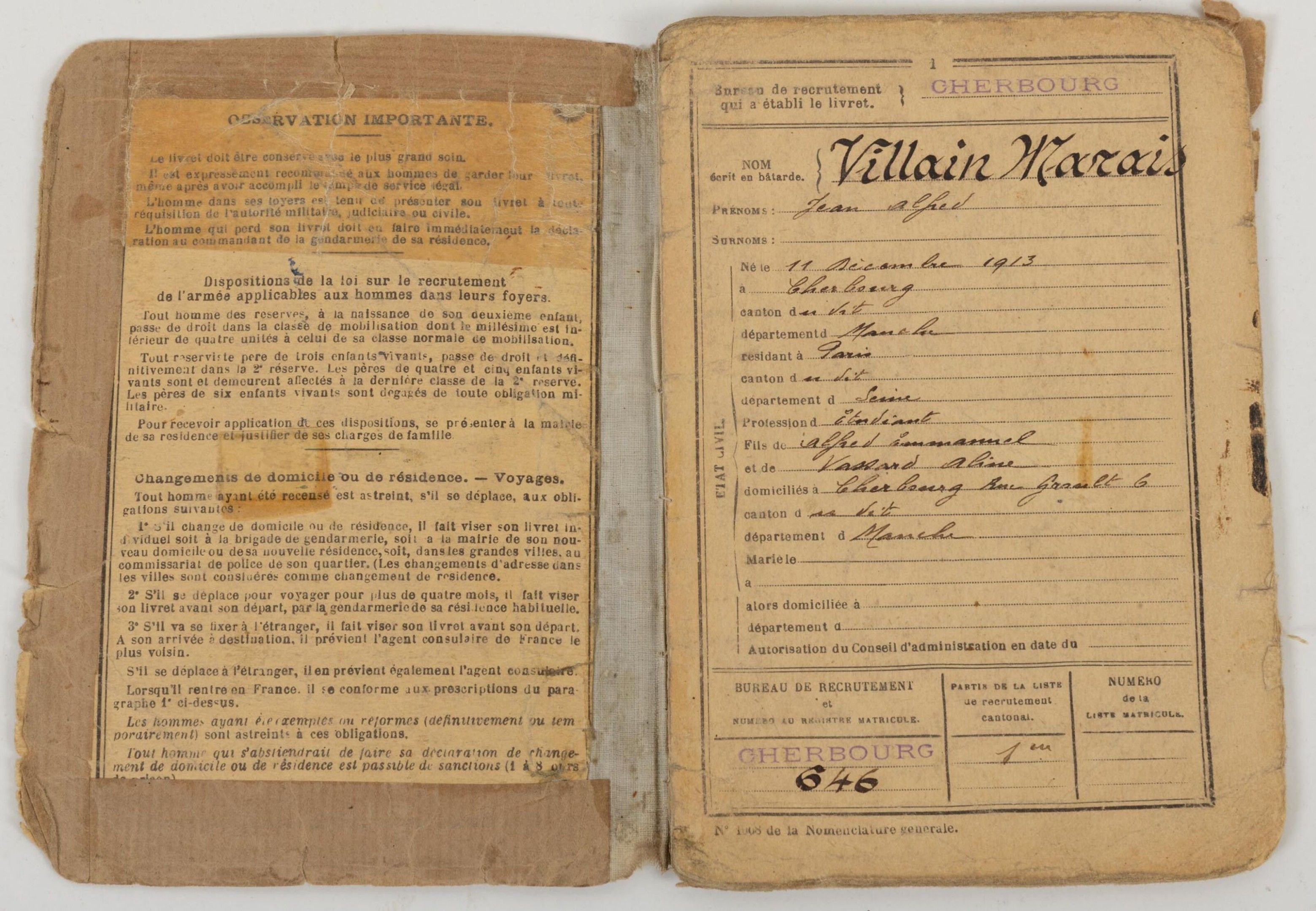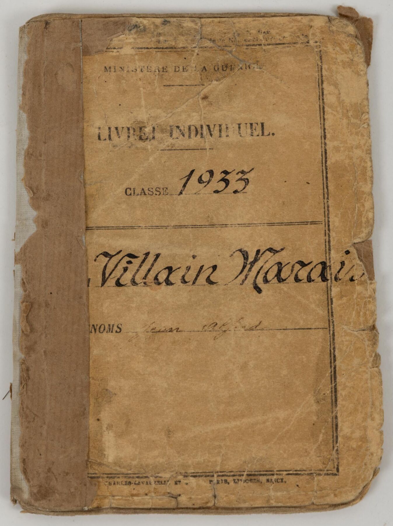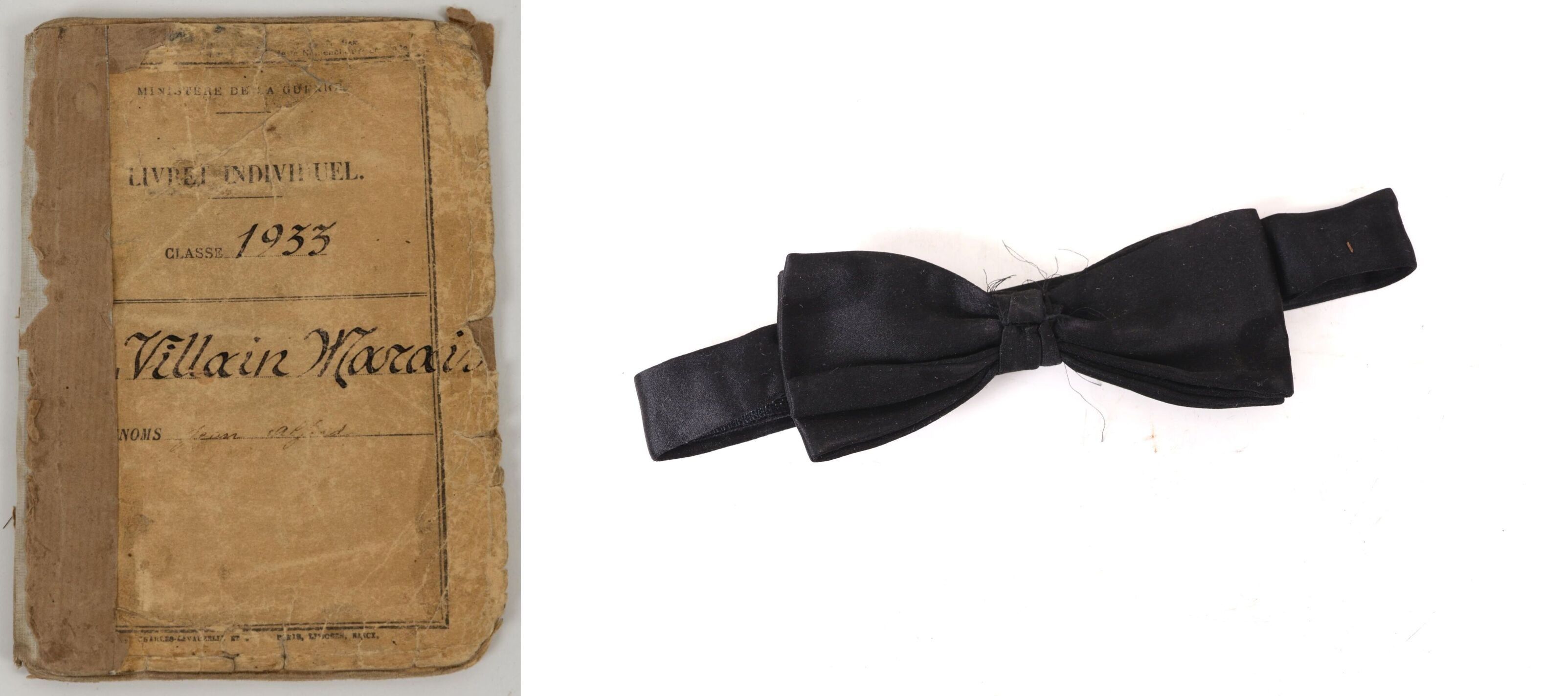 Individual military record book for Jean MARAIS. Class of 1933. Names: Villain Marai. Forenames: Jean Alfred. Numerous tears, repairs. Attached is a black silk Christian DIOR bow tie that was in the same envelope, probably from Jean Marais. L_12 cm, titled thread