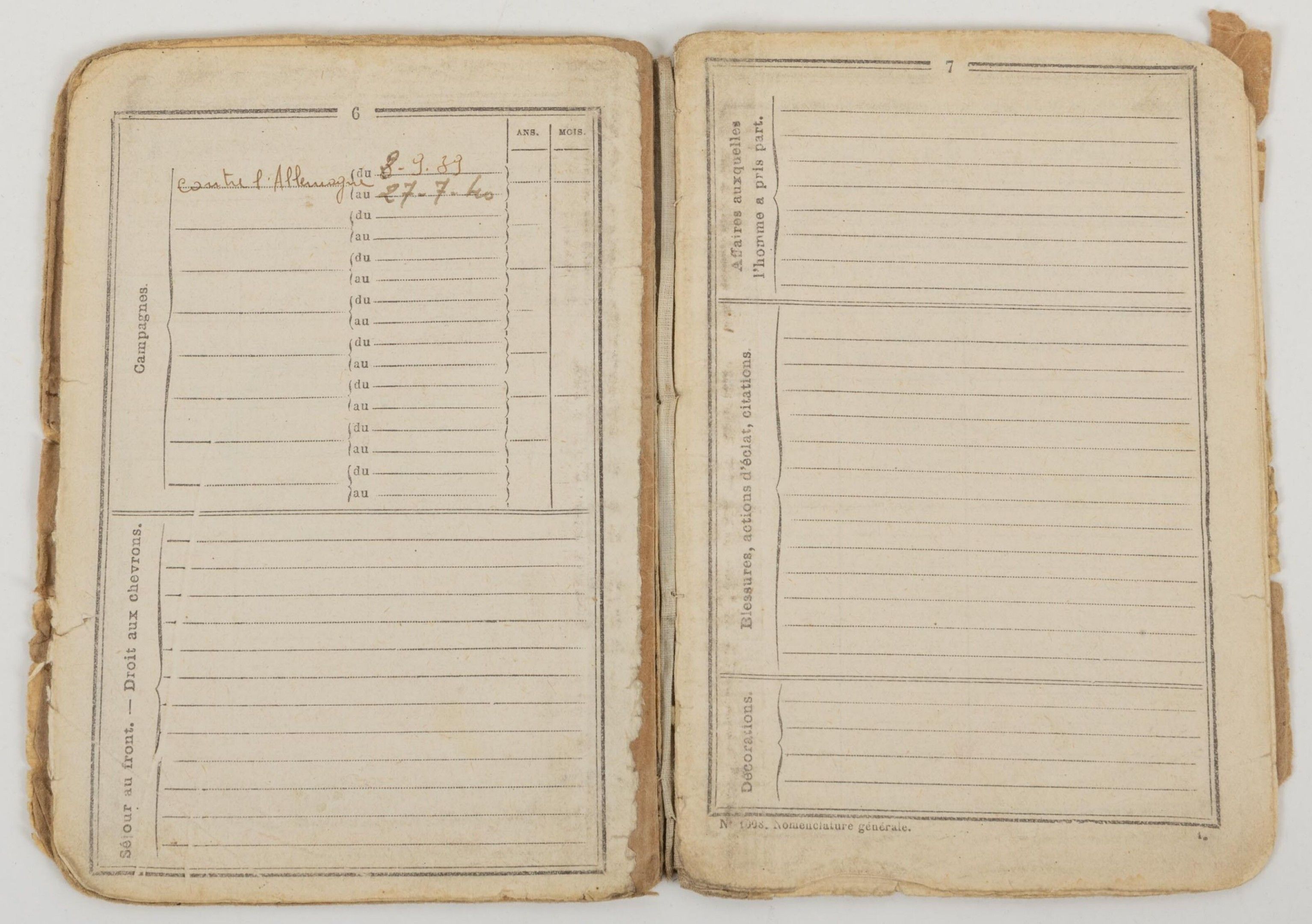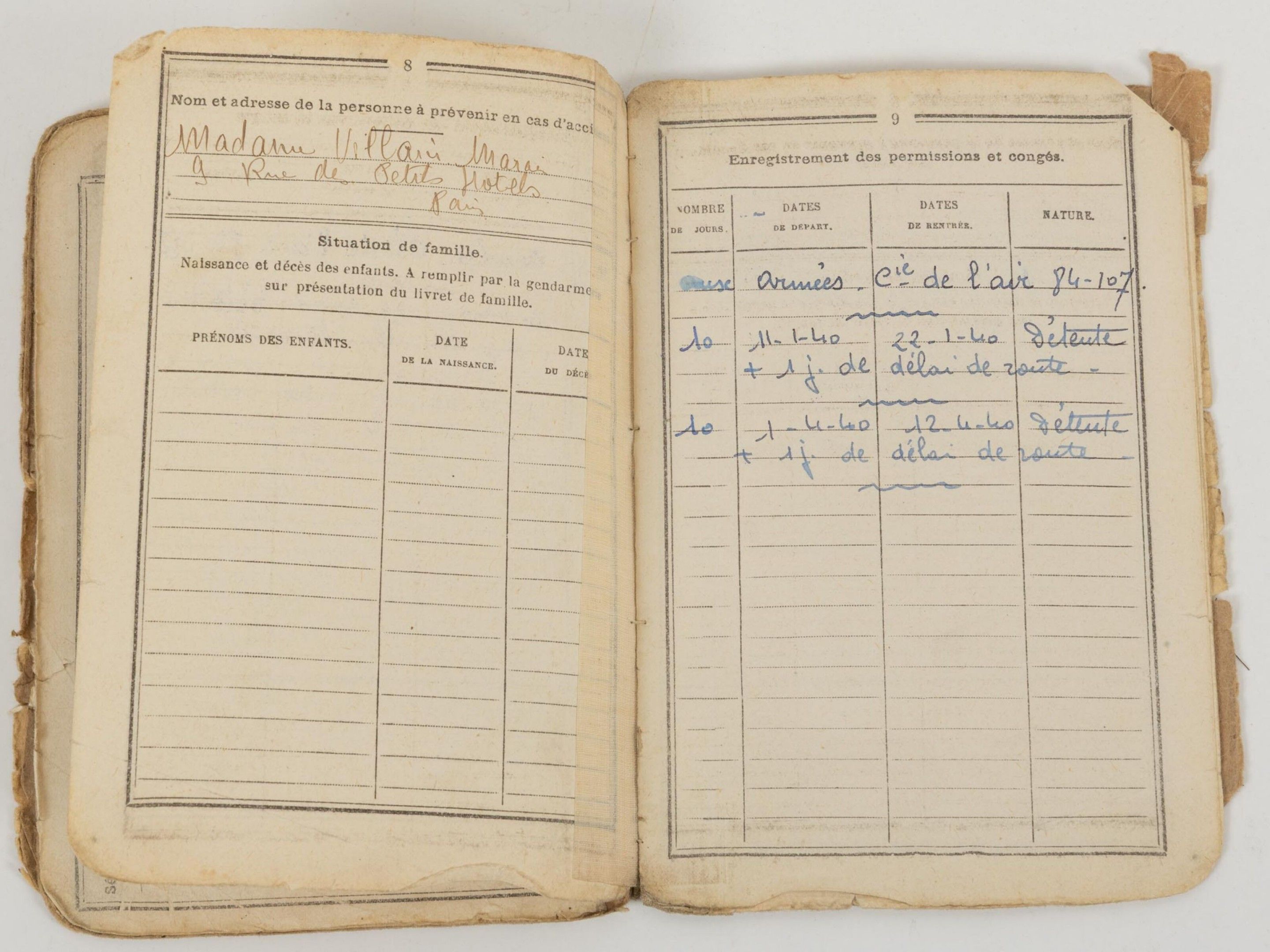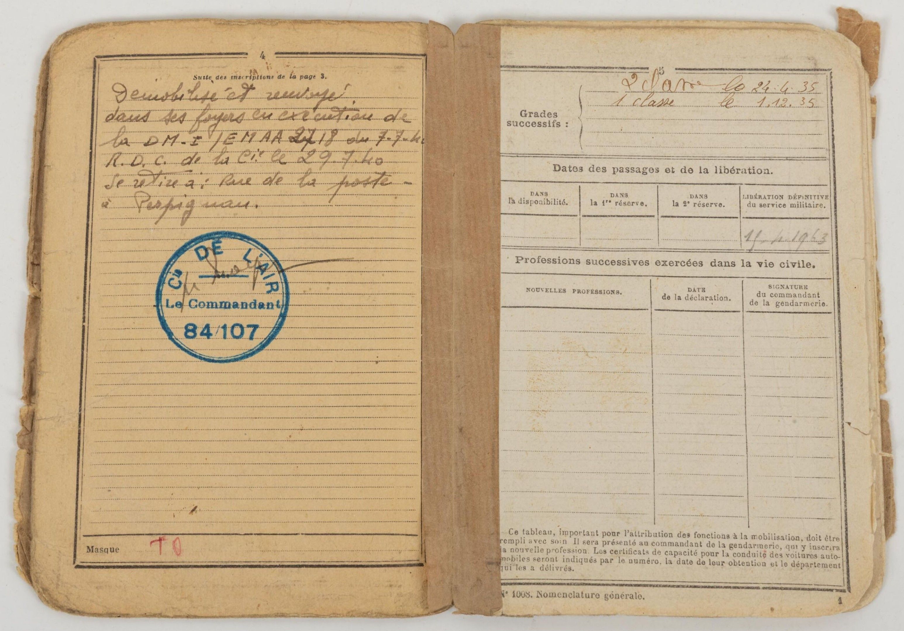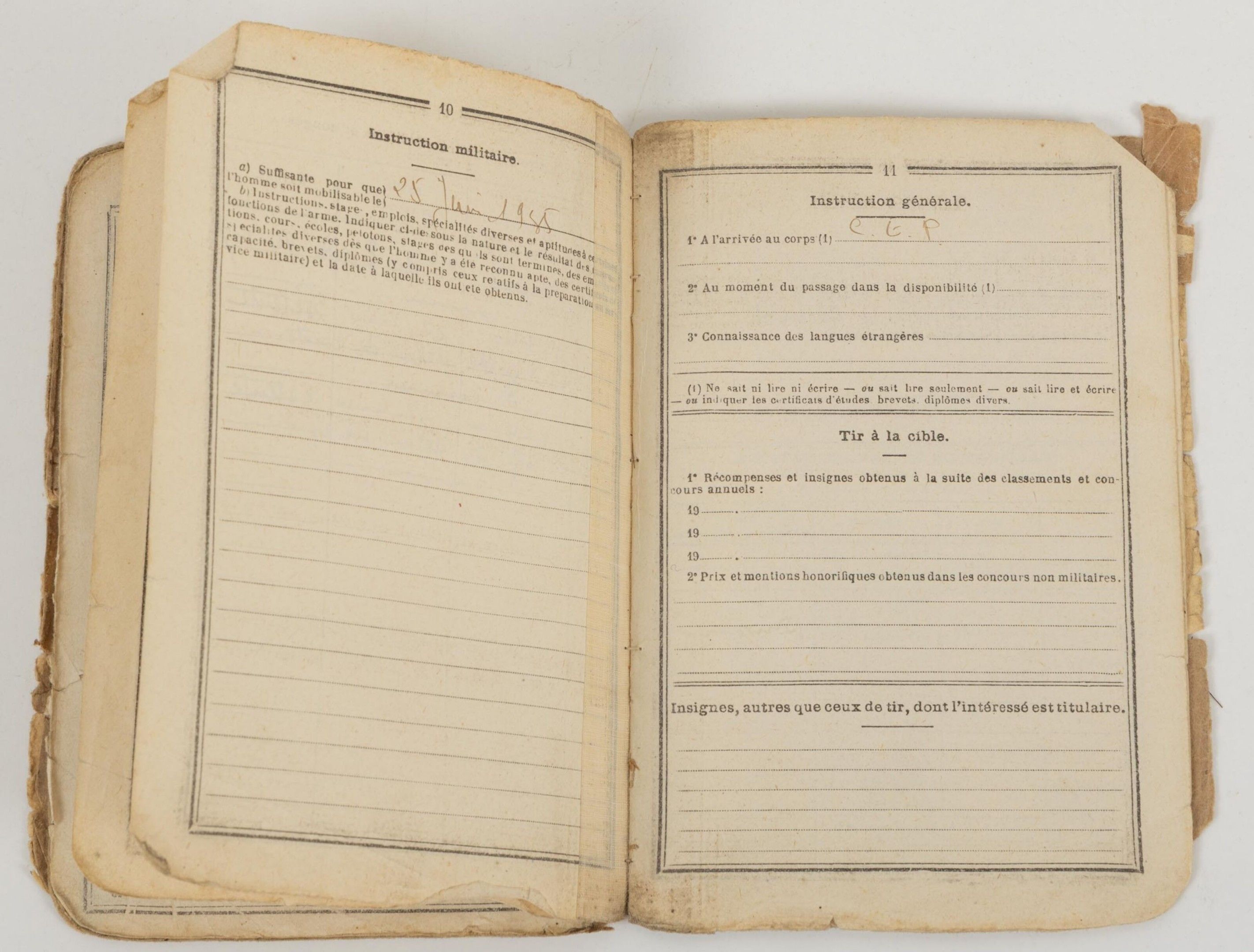 Individual military record book for Jean MARAIS. Class of 1933. Names: Villain Marai. Forenames: Jean Alfred. Numerous tears, repairs. Attached is a black silk Christian DIOR bow tie that was in the same envelope, probably from Jean Marais. L_12 cm, titled thread