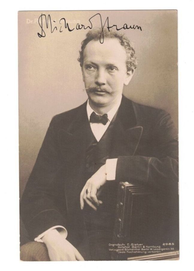 Richard STRAUSS. Signed photograph (postcard). Beautiful mid-body photograph by E. Bieber, signed at the top: "Dr Richard Strauss". Expert : Mr Thierry BODIN