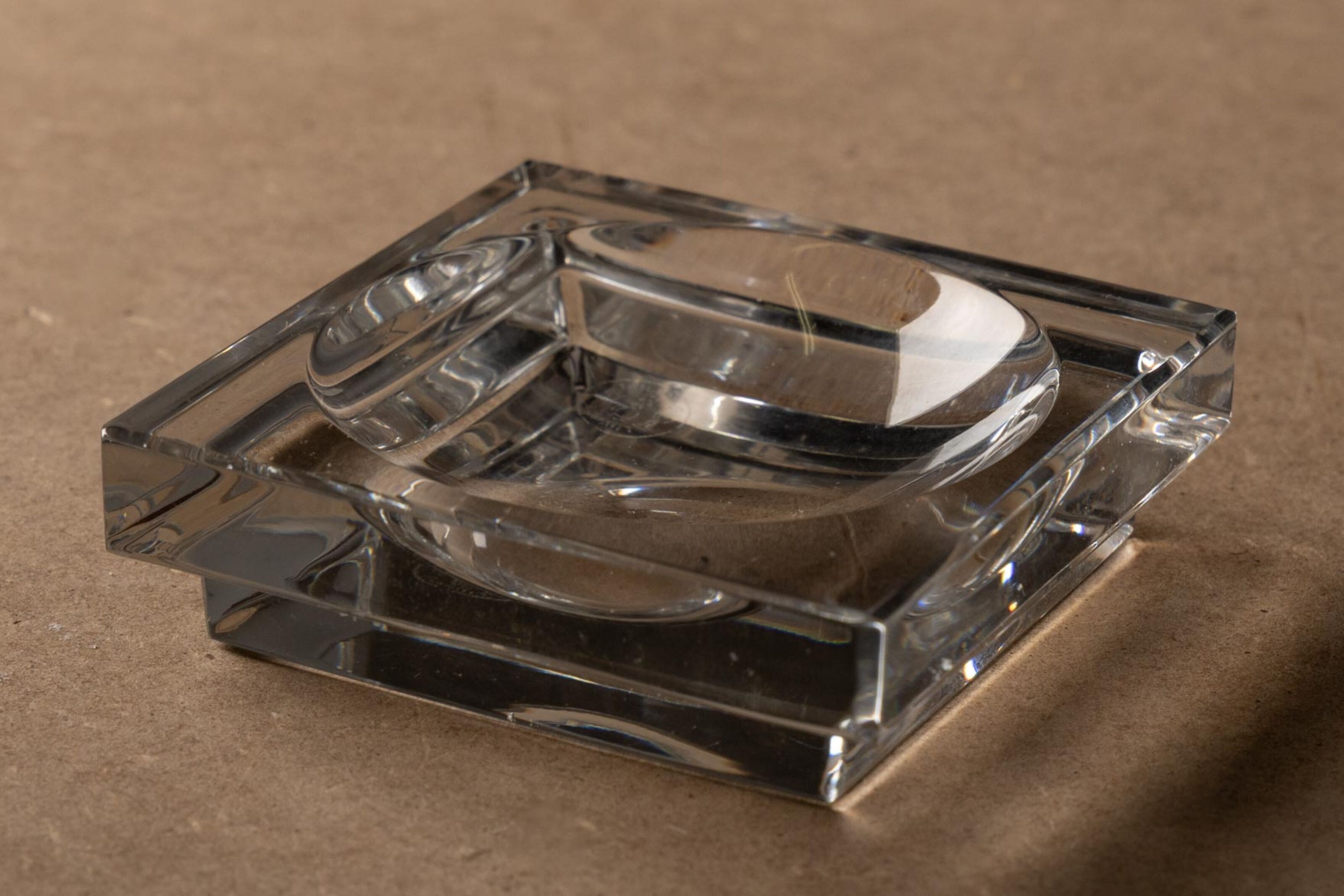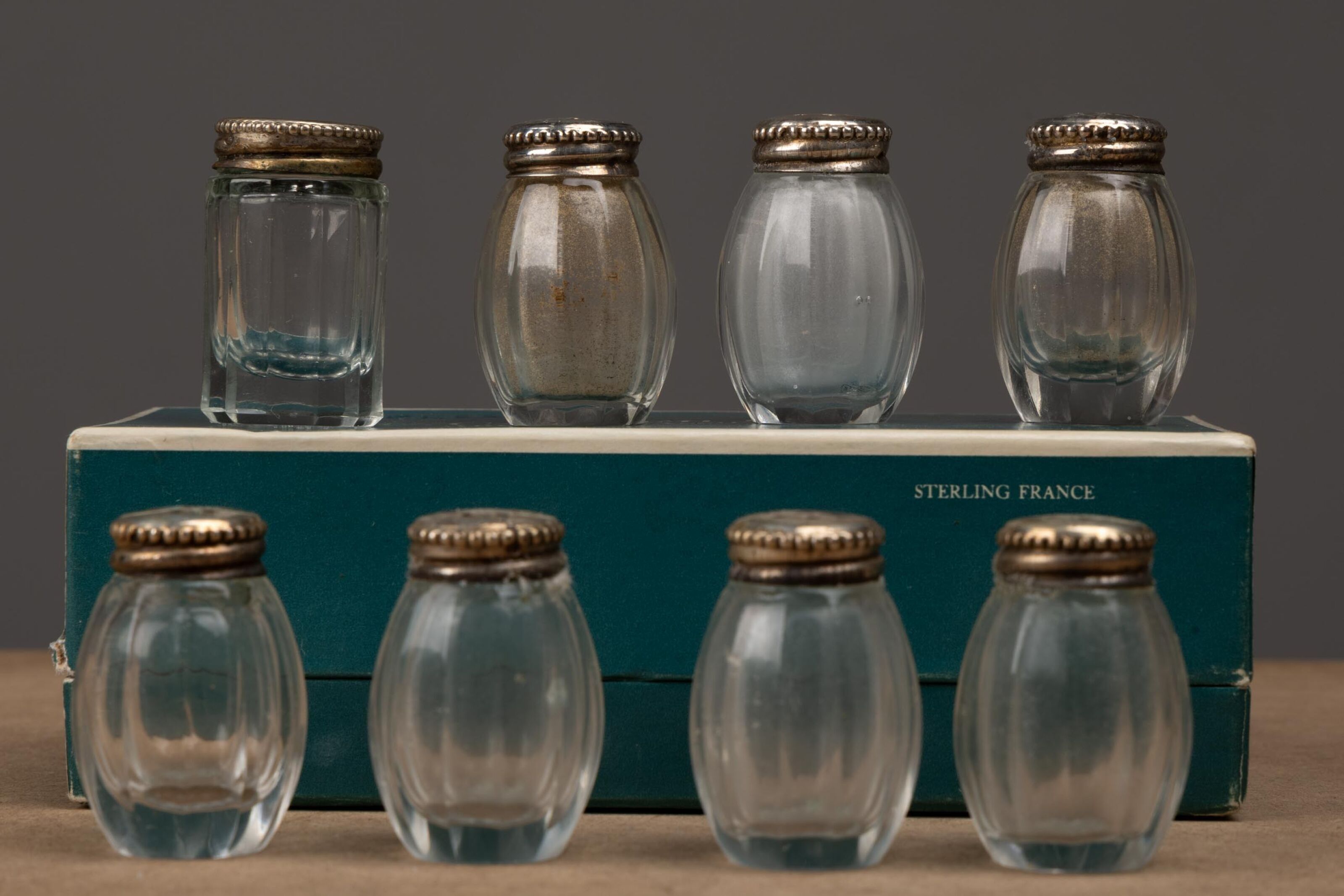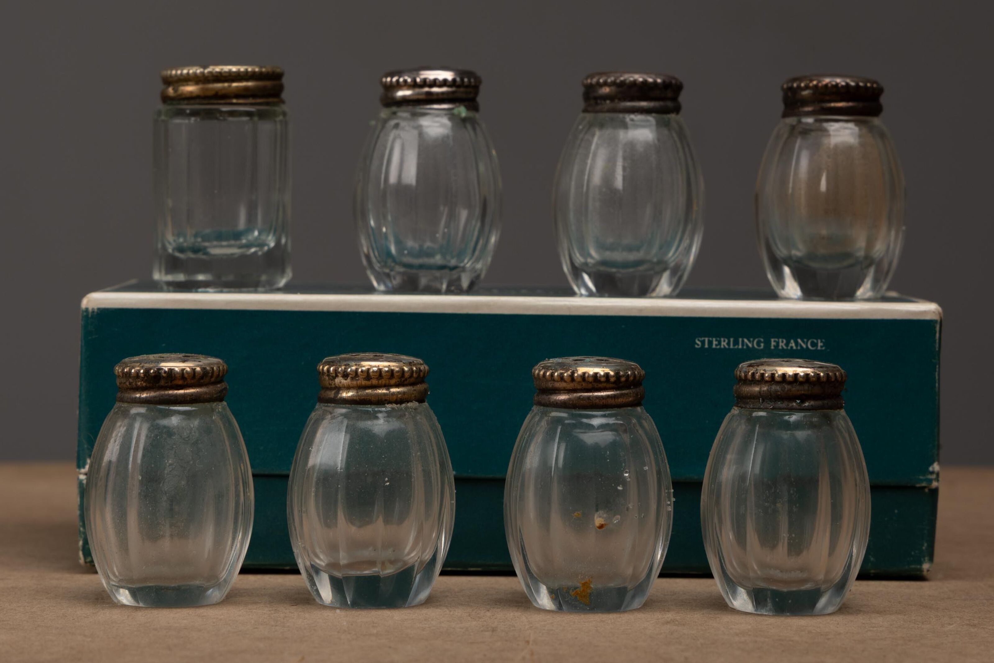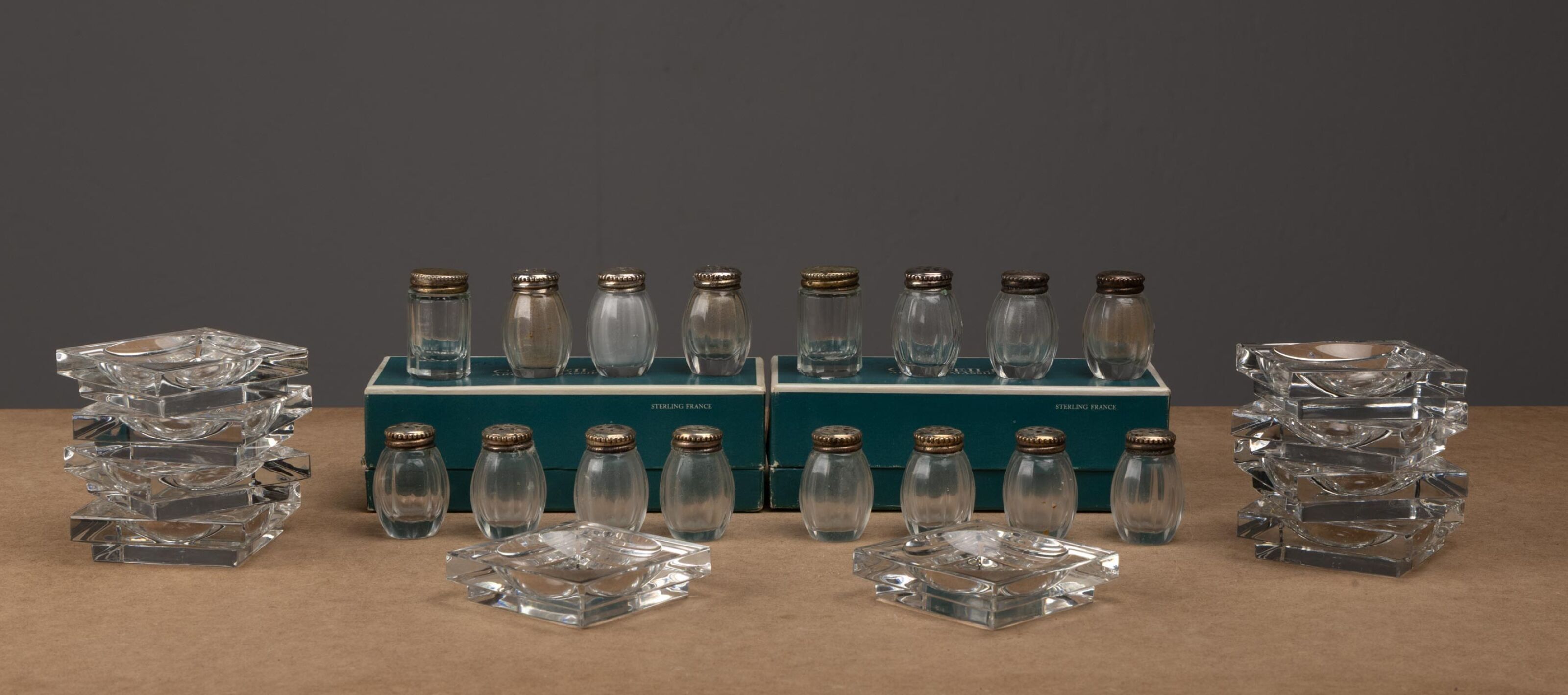 A table set comprising sixteen Cardeilhac salt cellars in their original boxes with silver lids and ten Baccarat butter dishes.