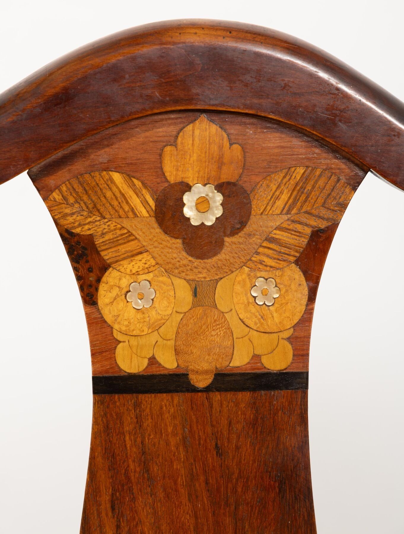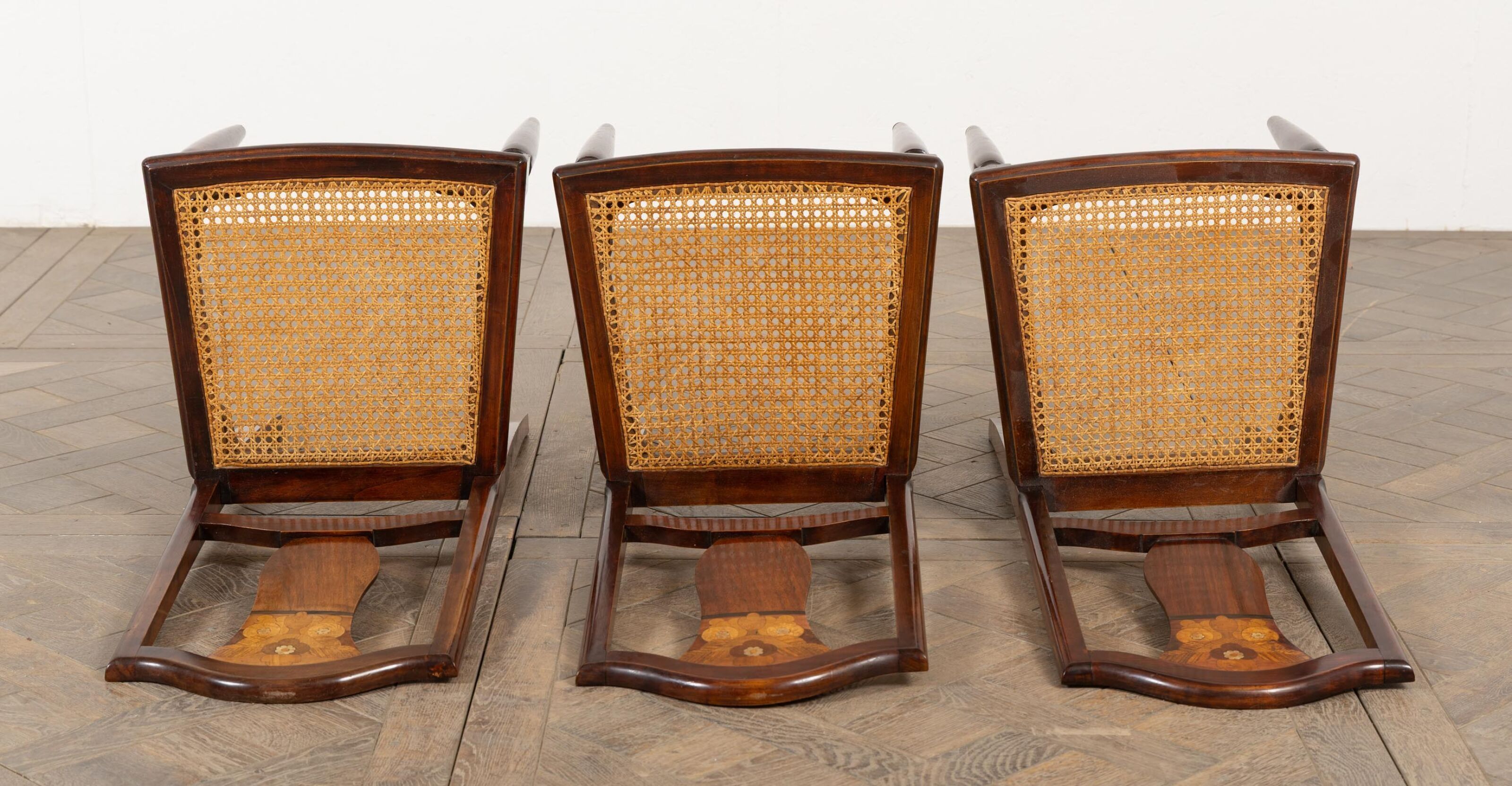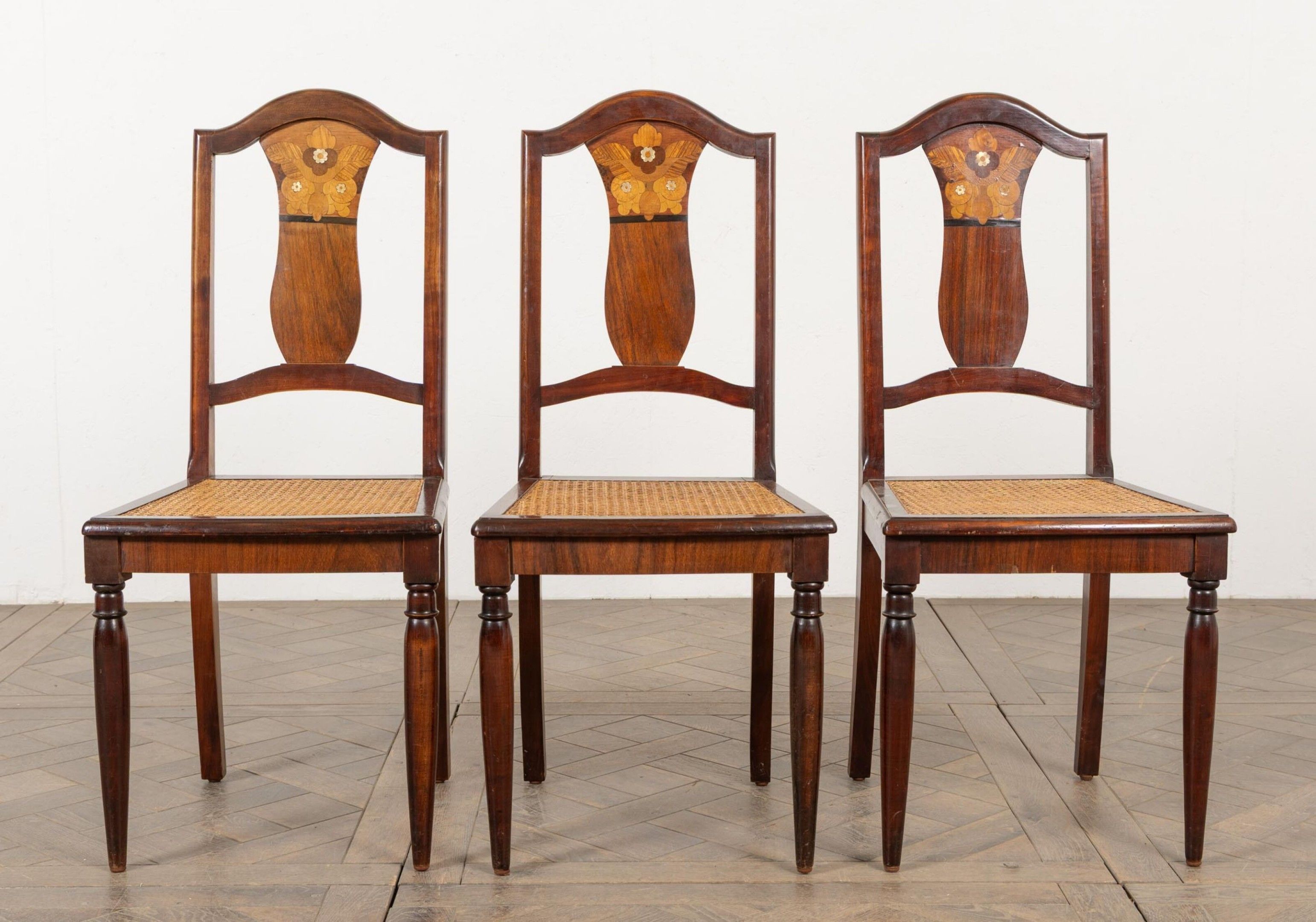 Suite of six chairs with inlaid wood and mother-of-pearl backs decorated with flowers, the seats caned.