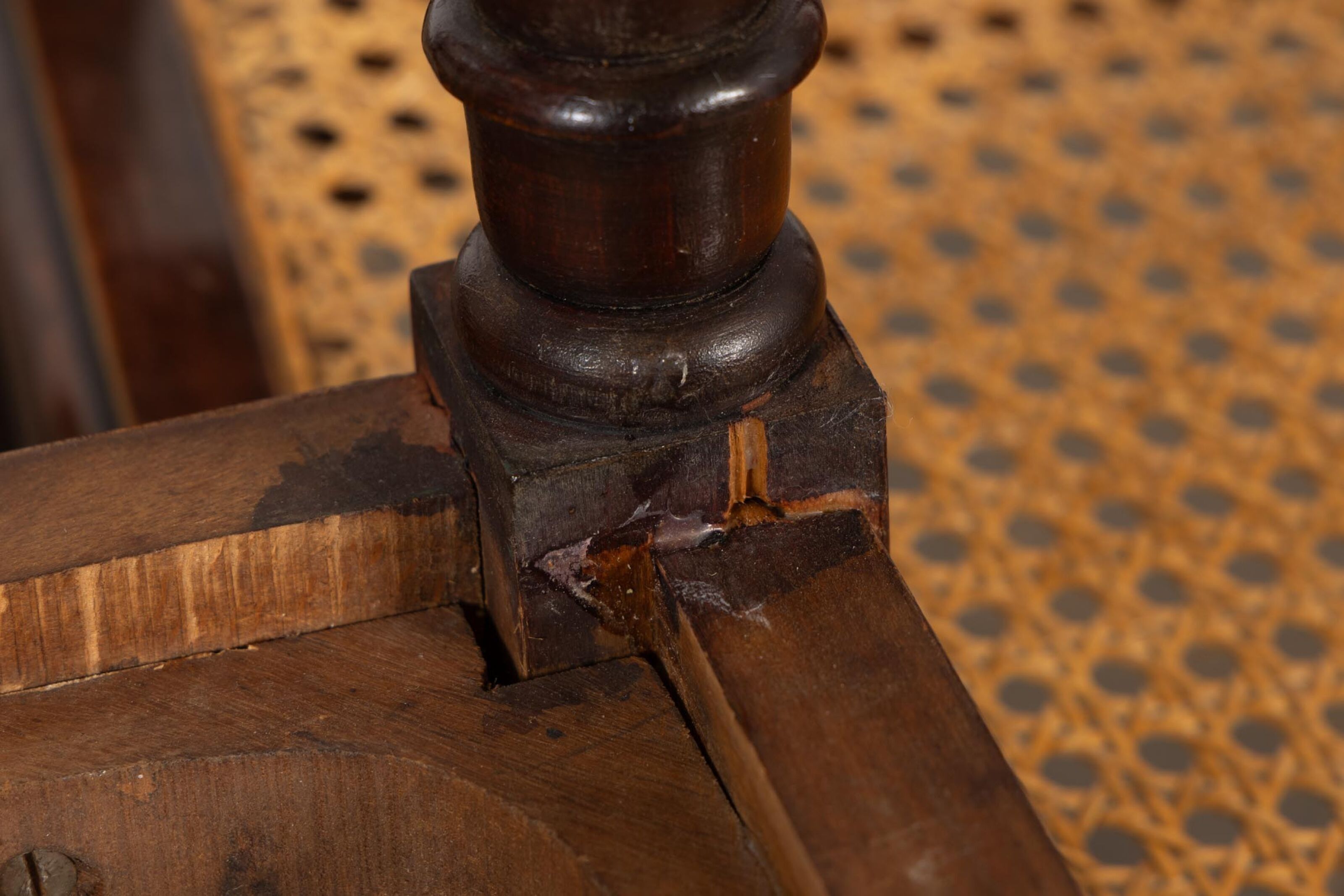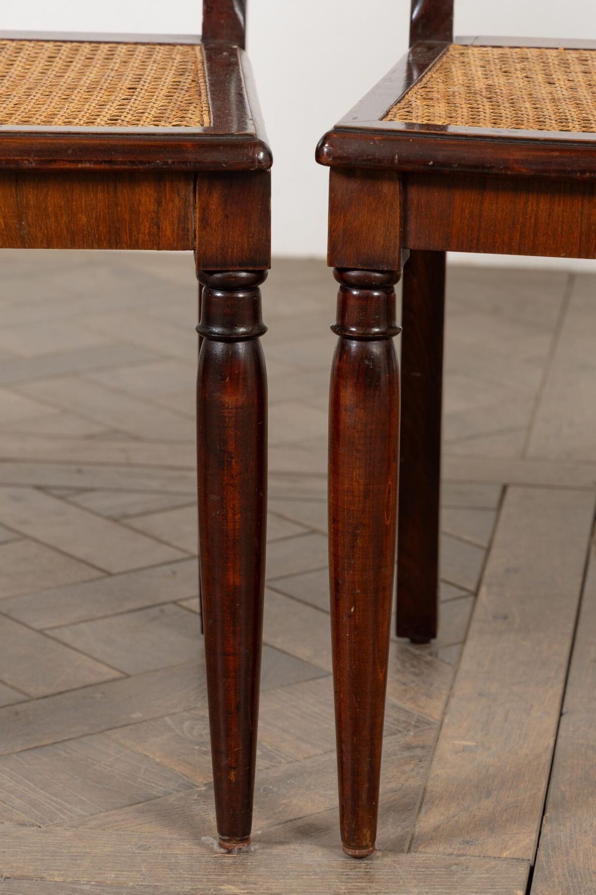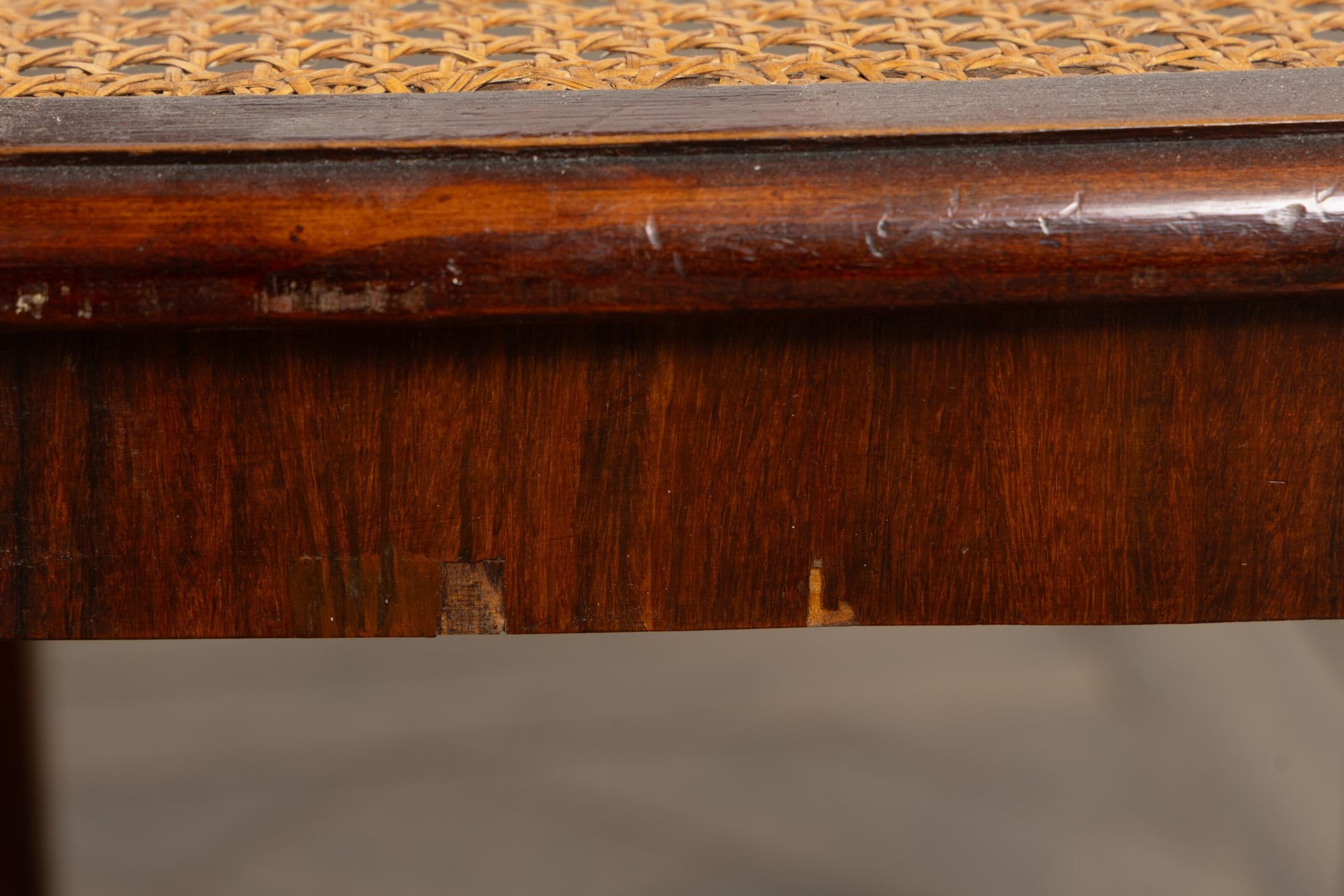Suite of six chairs with inlaid wood and mother-of-pearl backs decorated with flowers, the seats caned.