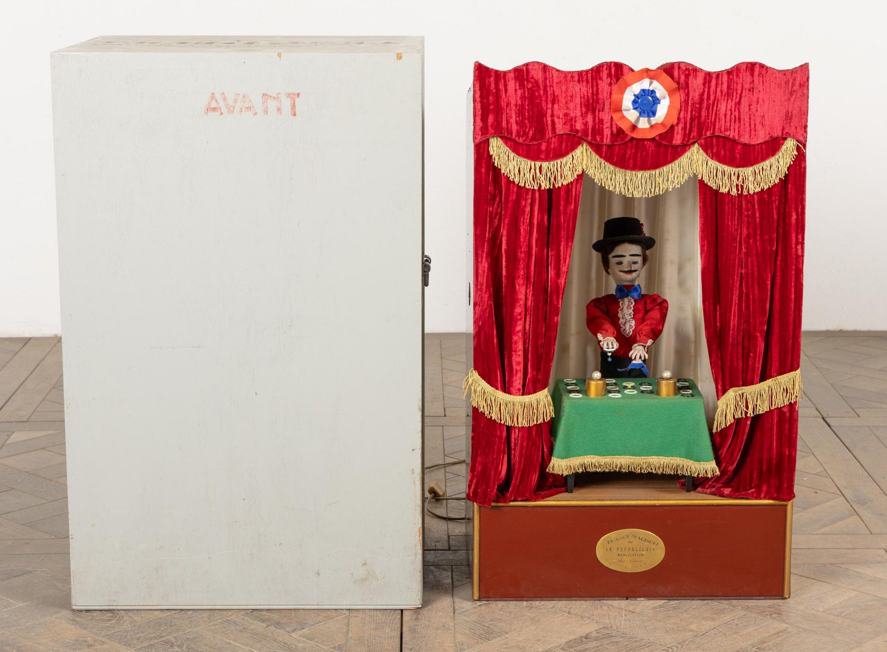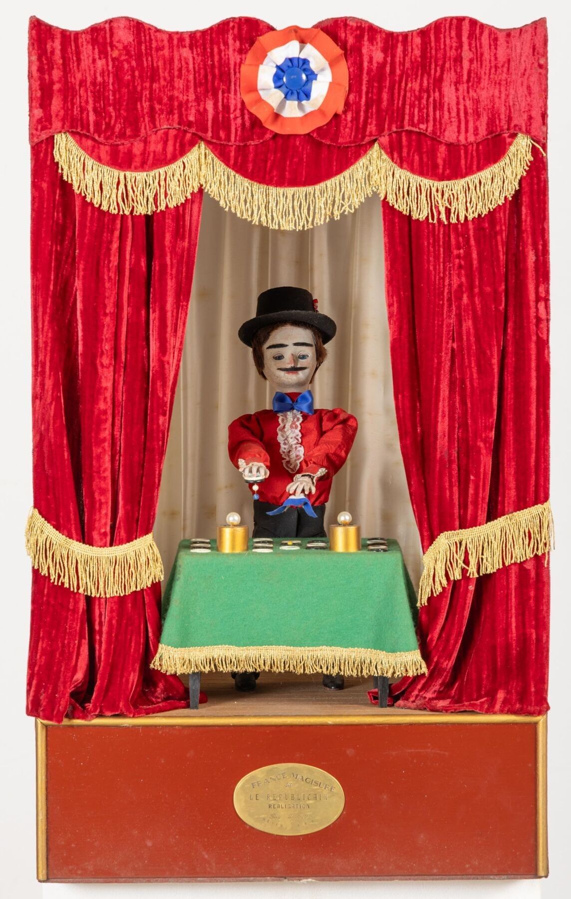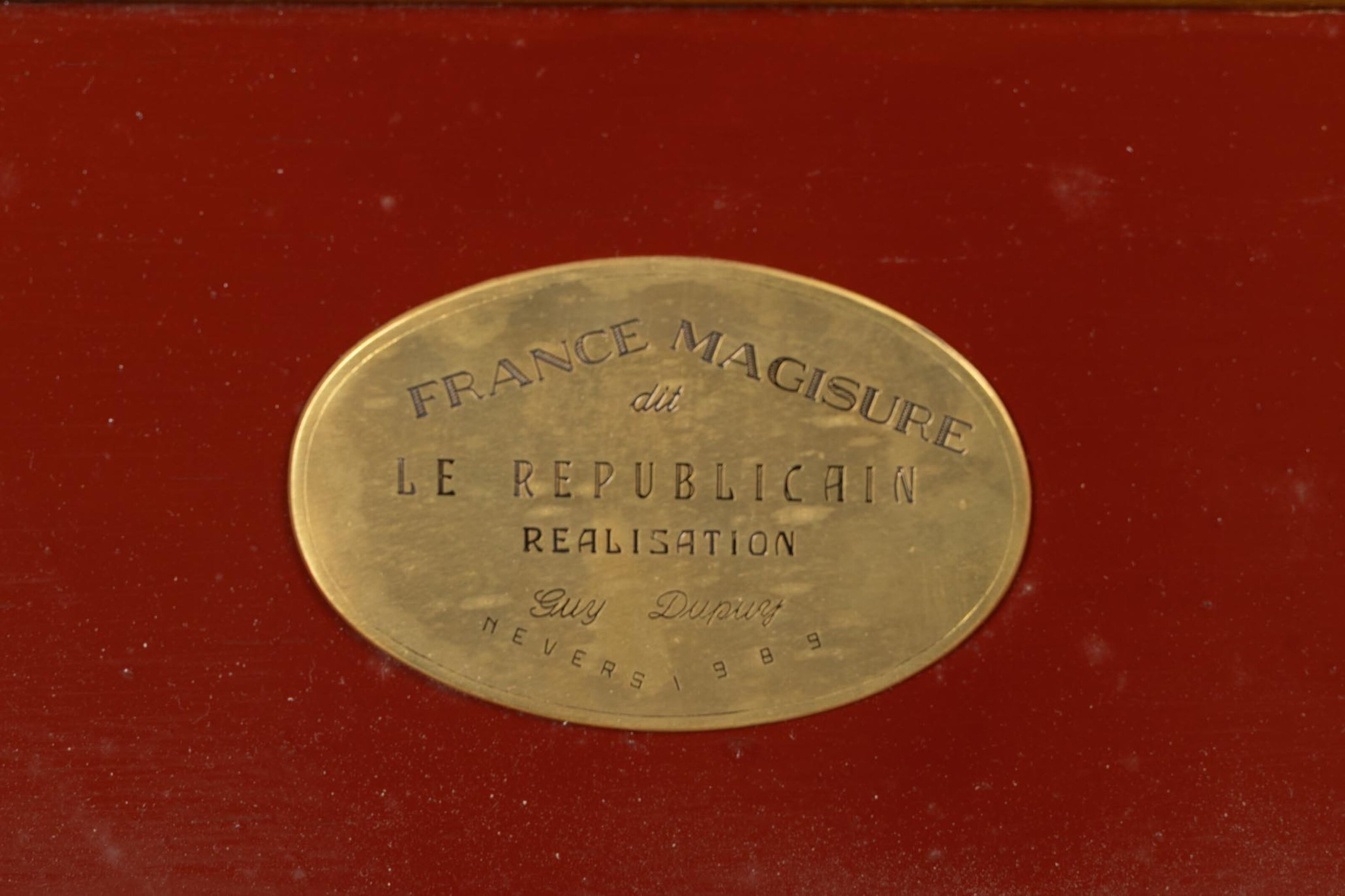 Guy DUPUY (1922-2017). France magisure dit le républicain, 1989. Automaton in composition and metal elements in a painted wood and cardboard structure, with titled and dated brass cartouche. To be revised, not functional in its current state. H_85 cm W_51 cm D_38 cm. Bibliography: the automata of Guy Dupuy, master clockmaker, automaton maker. Catalogue of the exhibition at the Fernand-Chalandre Gallery at the Palais Ducal in Nevers from 29 April to 21 May 2000.