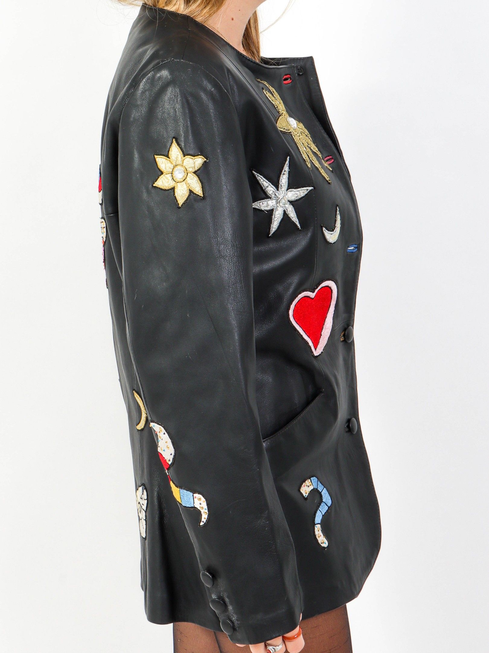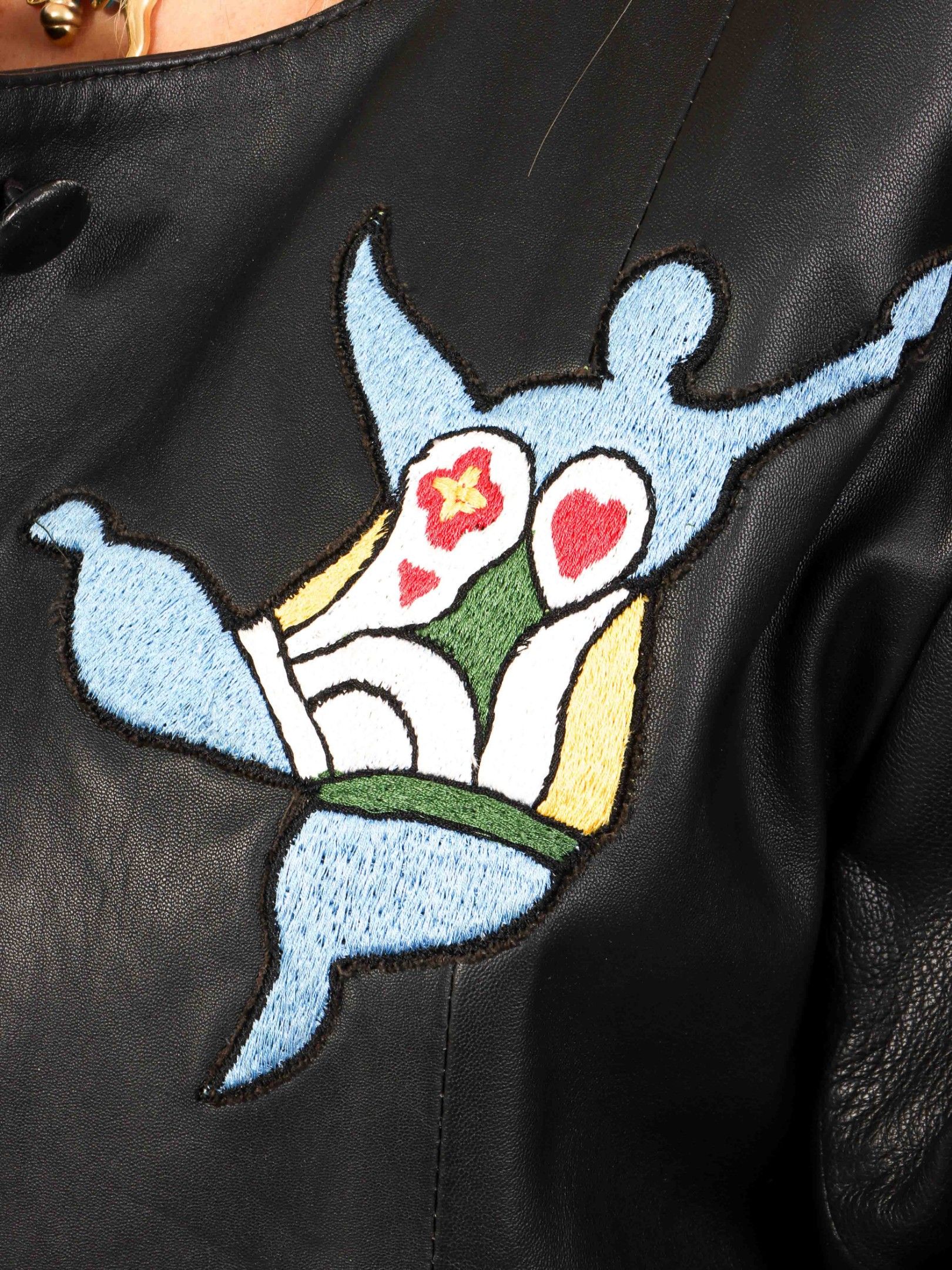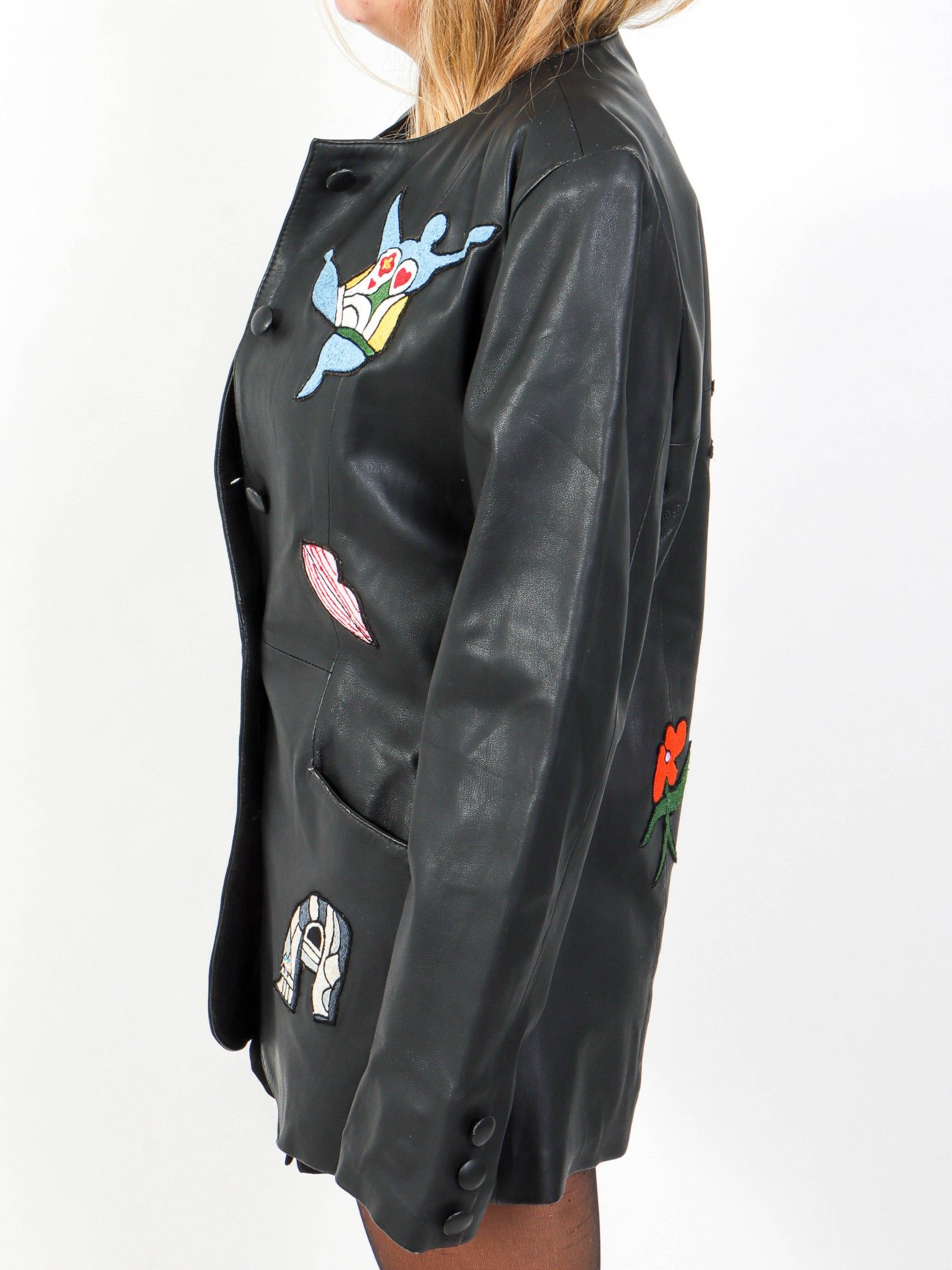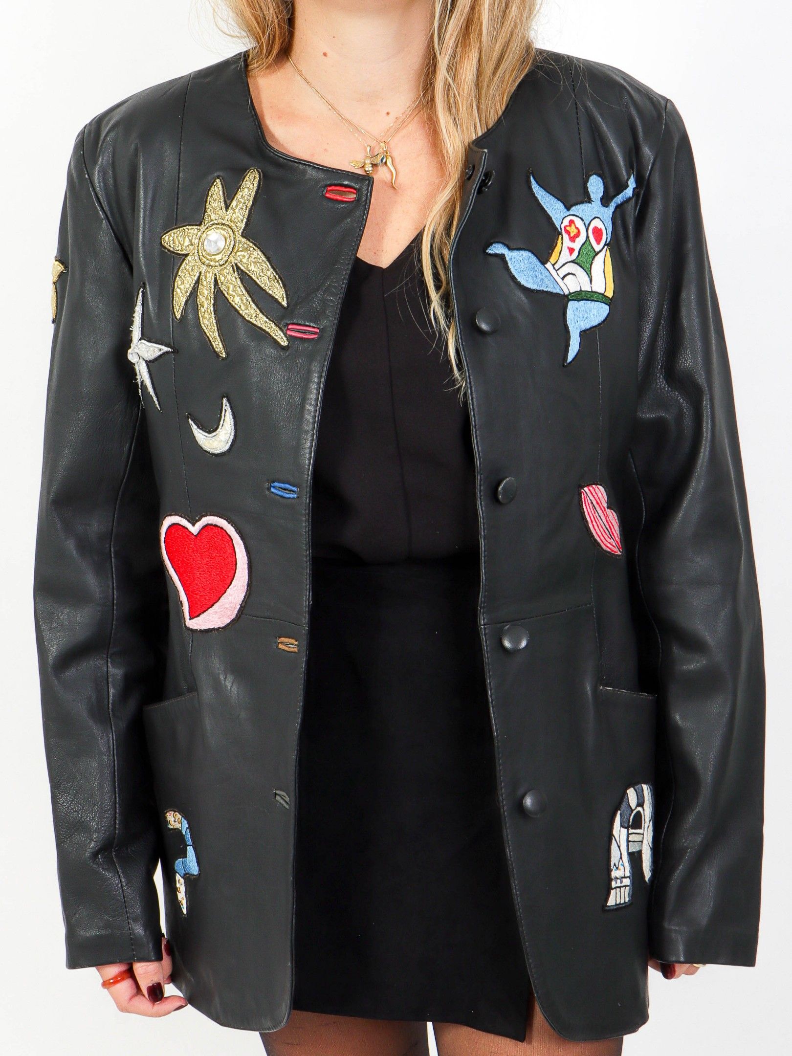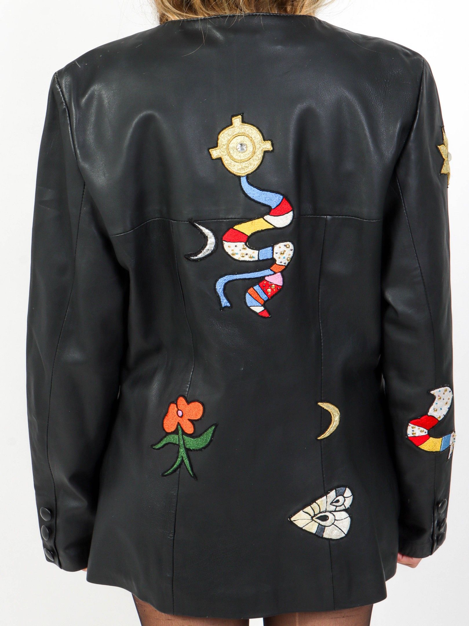 Black leather couture jacket with embroidery and rhinestone applications in the style of Niki de St Phalle. T 38