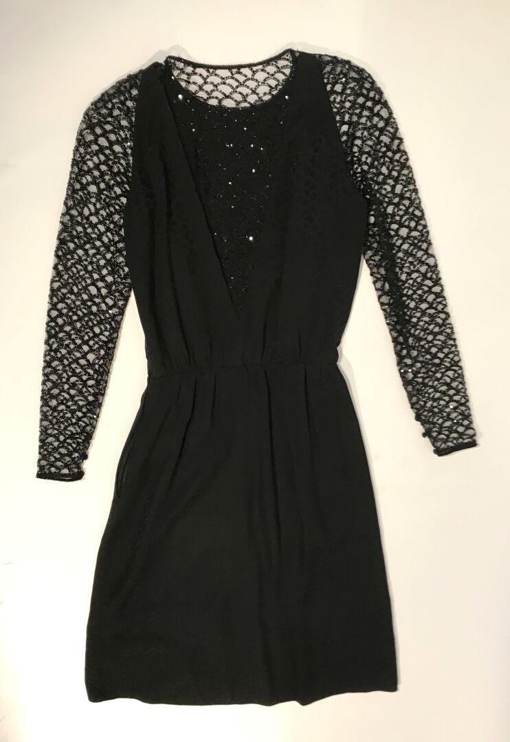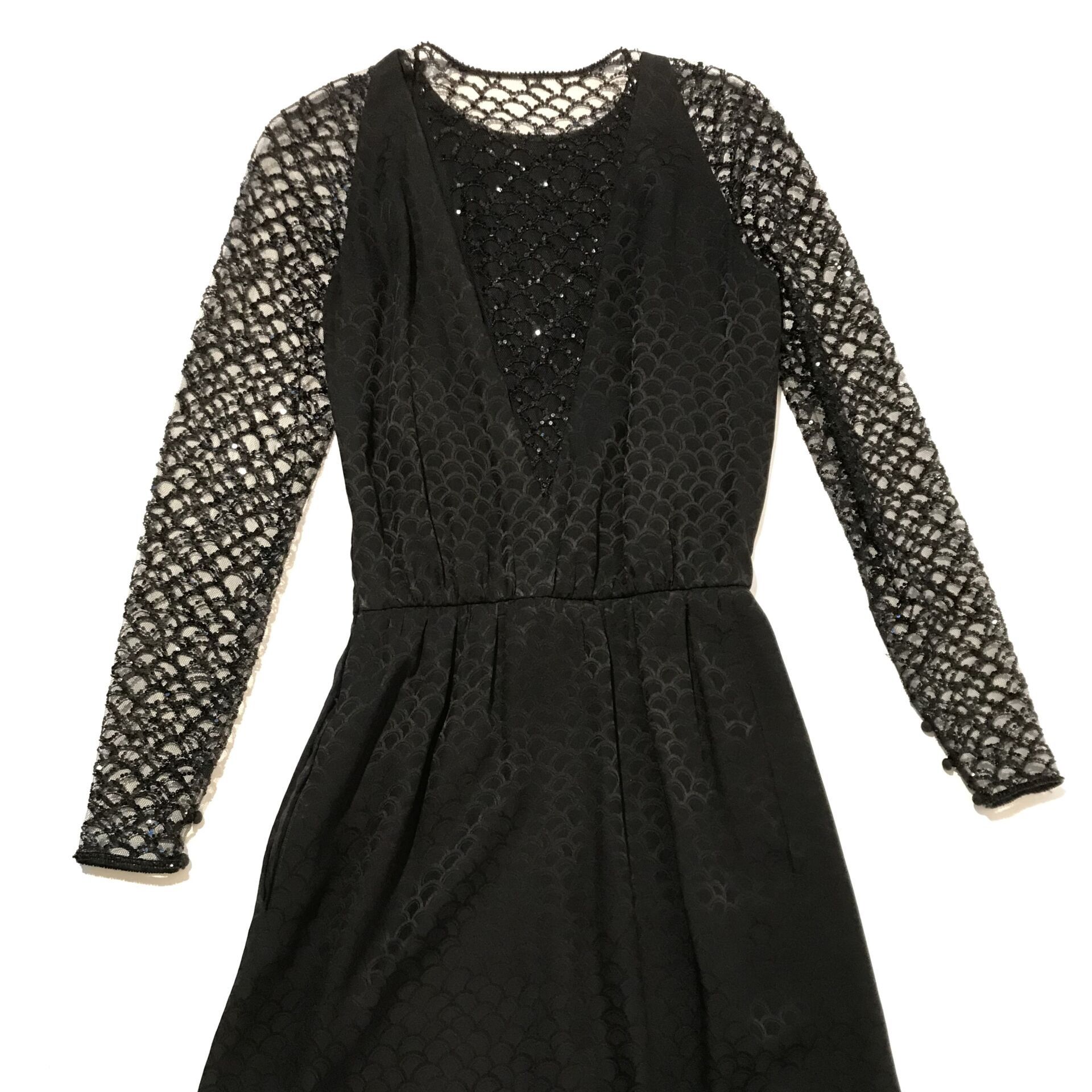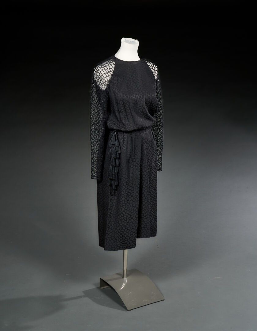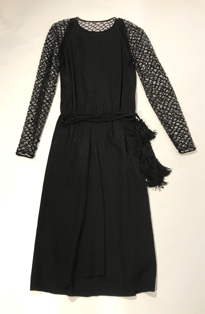 Black damask silk dress with black tulle sleeves and neckline embroidered with black sequins, scale decoration Size 36 approx.