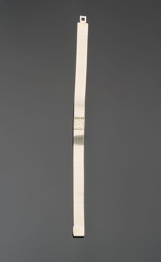Ladies' wristwatch in 18K 750‰ white gold, silvered square-shaped dial, straight hour markers and hands. Duoplan hand-wound mechanical movement, in as-is condition (appears to be working). Pressed and textured fabric mesh strap, clasp.