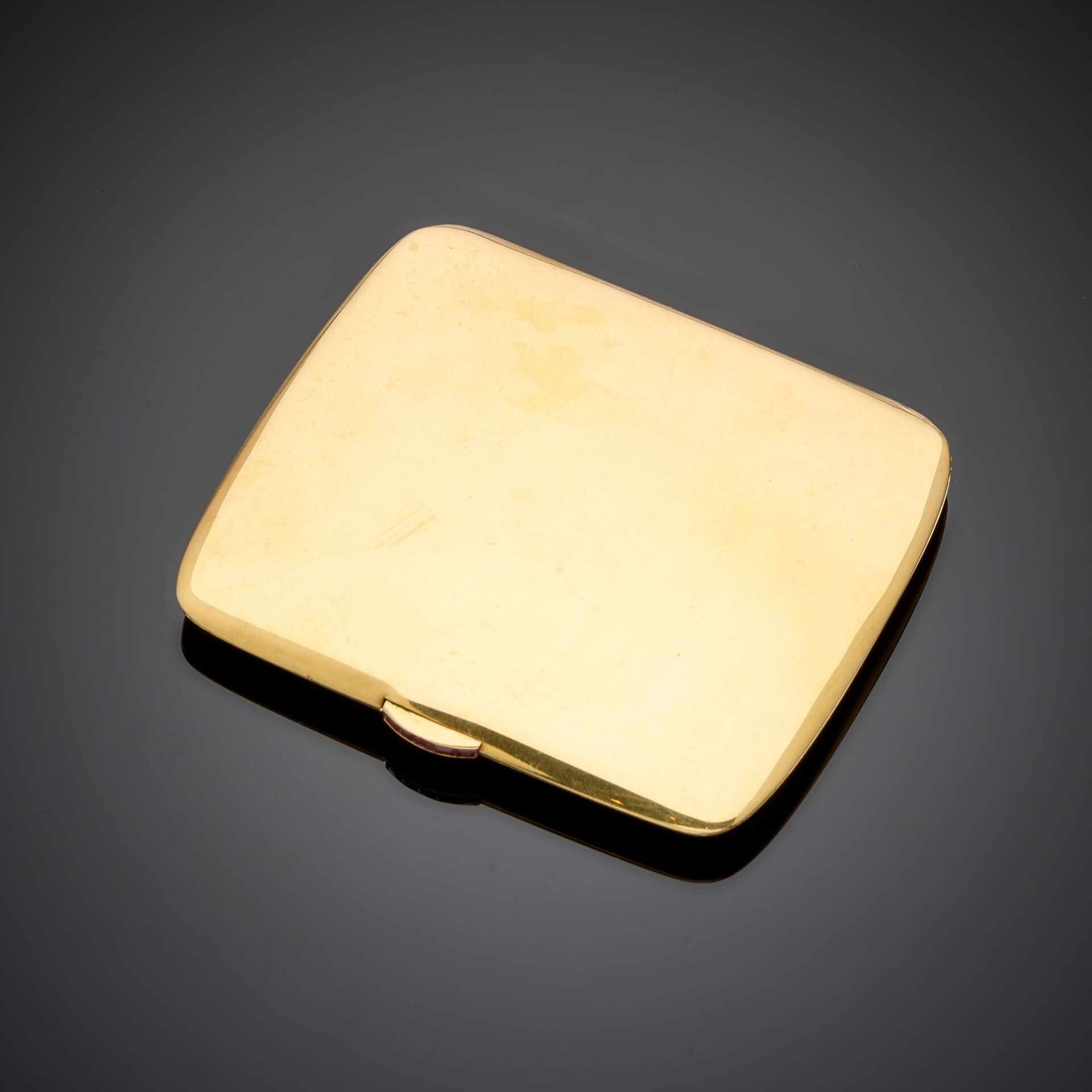 Cigarette case in 18K yellow gold 750‰, of rectangular cushion shape, the push-button set with calibrated rubies. Spring-loaded opening system. Fitted with a strap to hold the cigarettes.