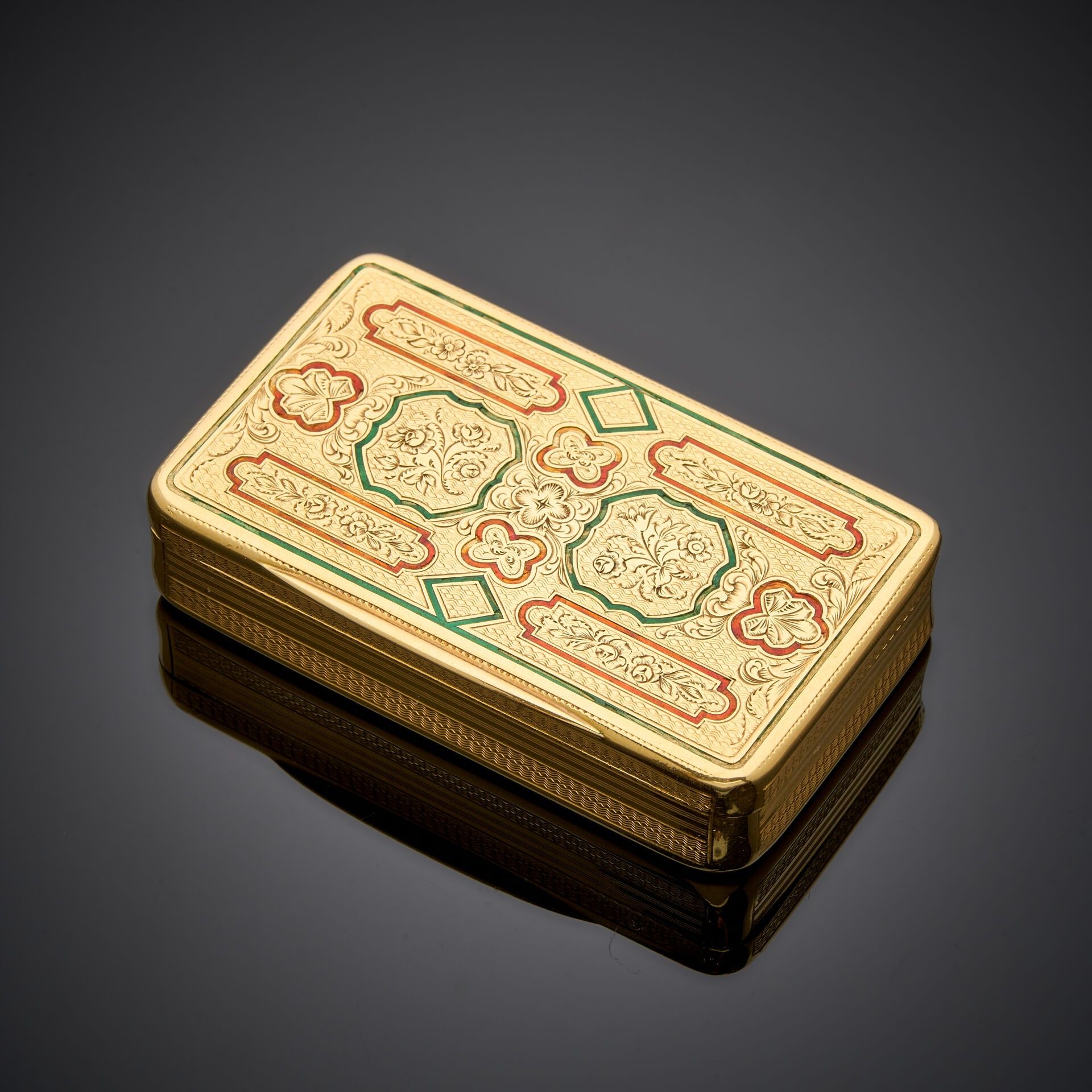 Rectangular-shaped 18K yellow gold 750‰ box, guilloché and engraved on the lid with plant motifs partially enamelled in green and orange