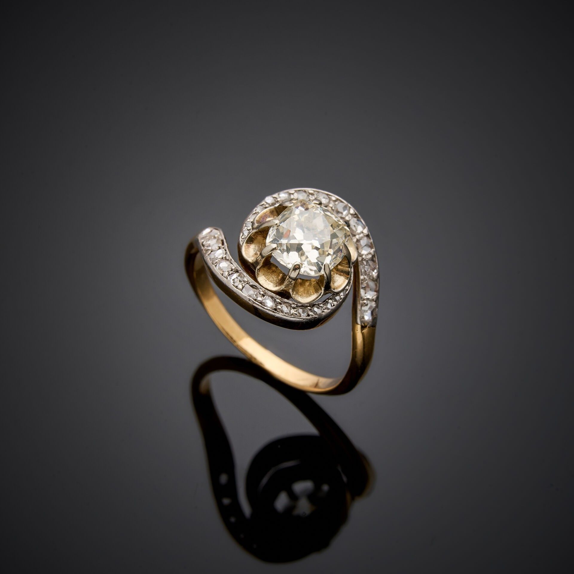 Two-tone 18K gold 750‰ tourbillon-shaped ring set with a cushion-shaped old-cut diamond in a surround of scrolls set with rose-cut diamonds