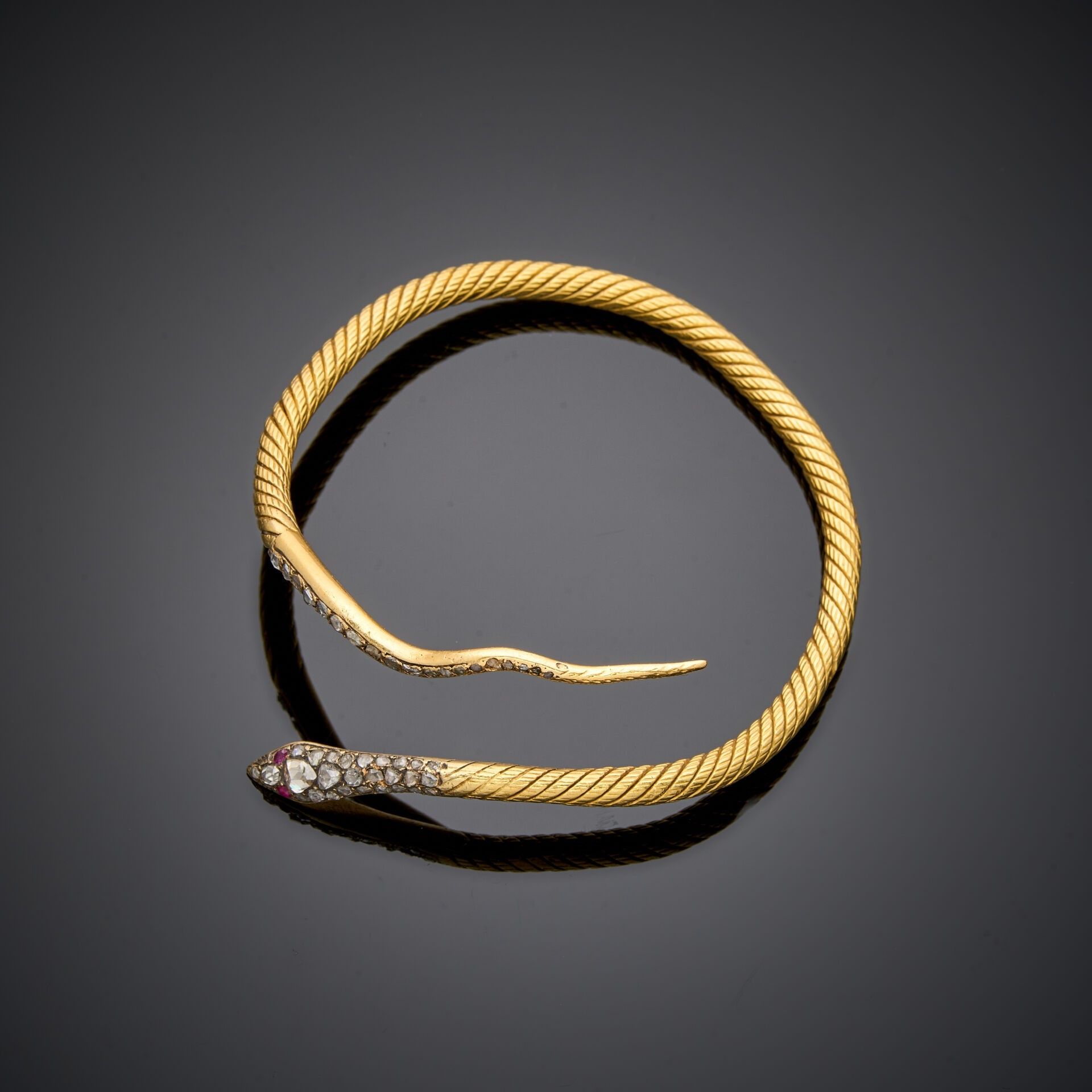 Bracelet in 18K yellow gold 750‰, snake, the body coiled and striated, the head set with a pavement of rose-cut diamonds and two red stones (synthetic) for eyes. The end of the tail set with a line of rose-cut diamonds.