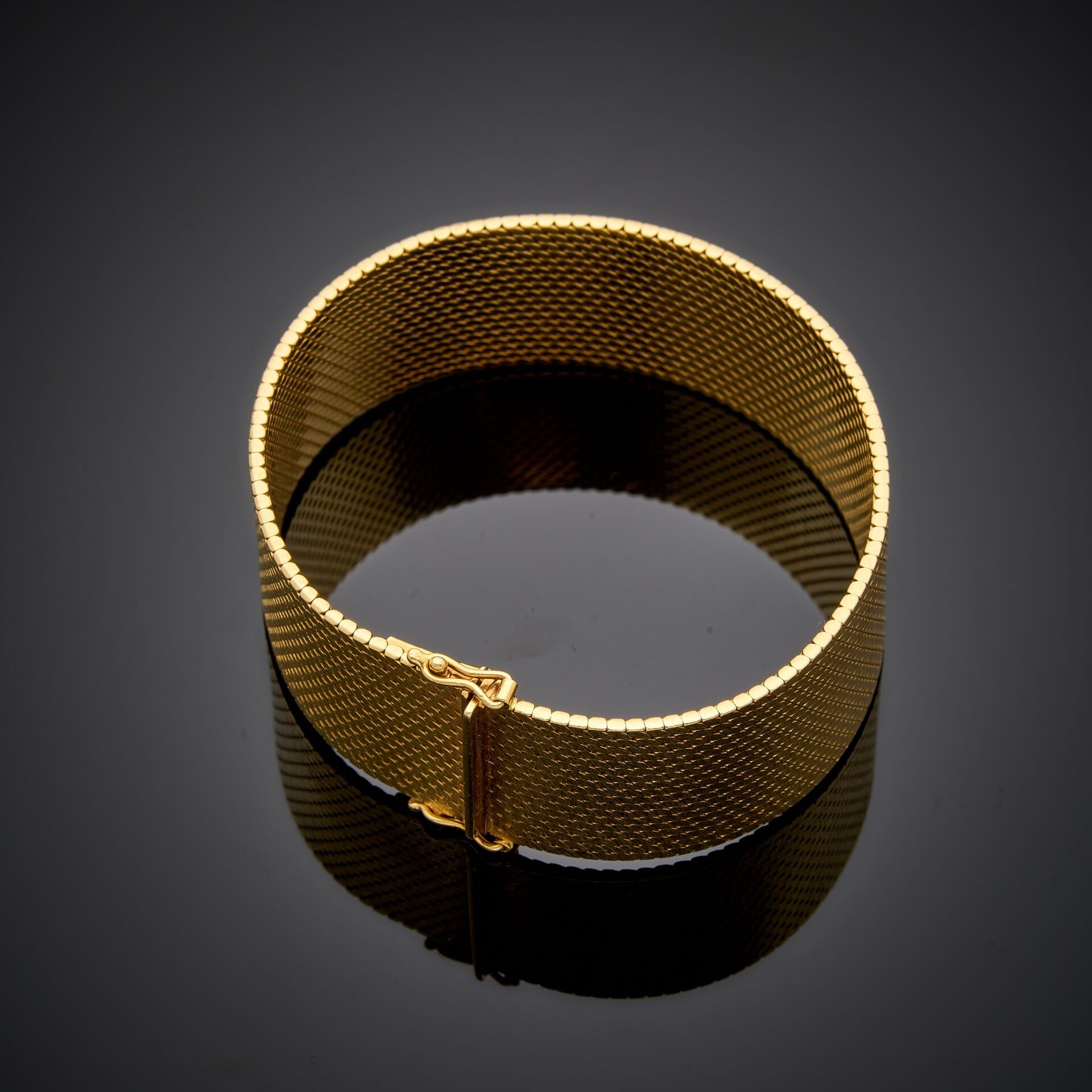 Bracelet in 18K yellow gold 750‰, woven and pressed mesh, ratchet clasp with two safety eights. Marked by the Wolfers workshop