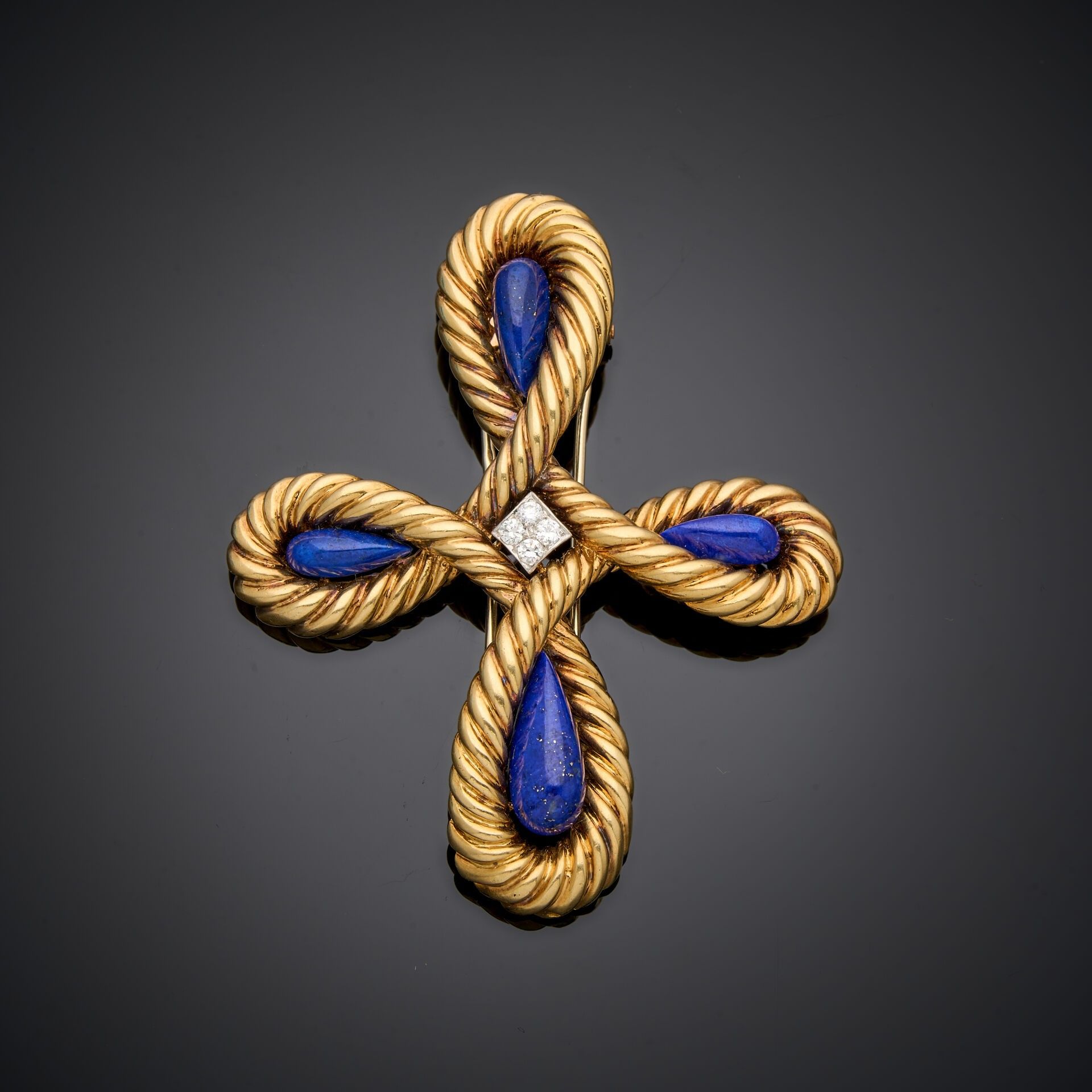 Clip in two-tone 18K gold 750‰, in the form of a cross decorated with a twisted rush adorned with piriform cabochons of lapis lazuli, in the centre four brilliant-cut diamonds. Removable clip, opening hoop, pump system.