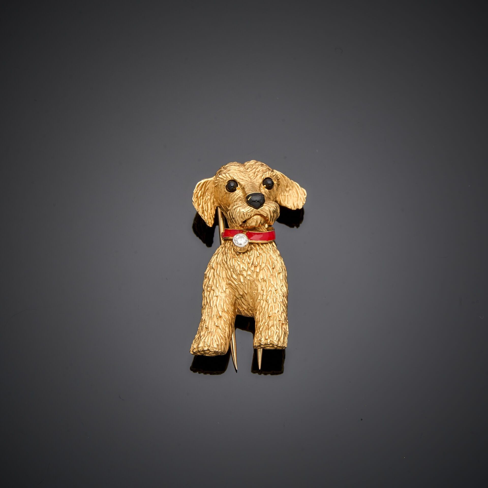 Two-tone 18K 750 gold clip representing an Airedale Terrier puppy, front view, eyes set with onyx beads, black enamelled nose, red enamelled collar adorned with a medal set with a brilliant-cut diamond.