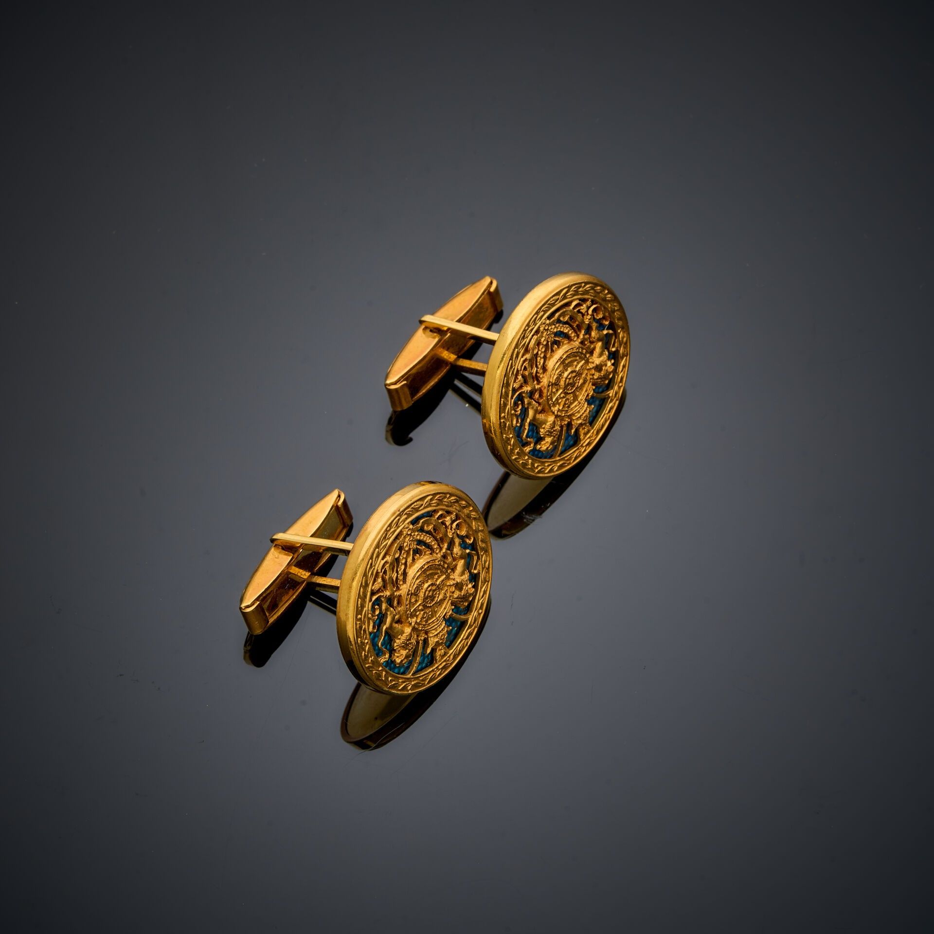 A pair of 18K yellow gold 750‰ round cufflinks, the back enamelled blue, adorned with the arms of the Pahlavi dynasty. The toggle system decorated with a sabre and laurels. In a blue morocco case studded with a metal medal.