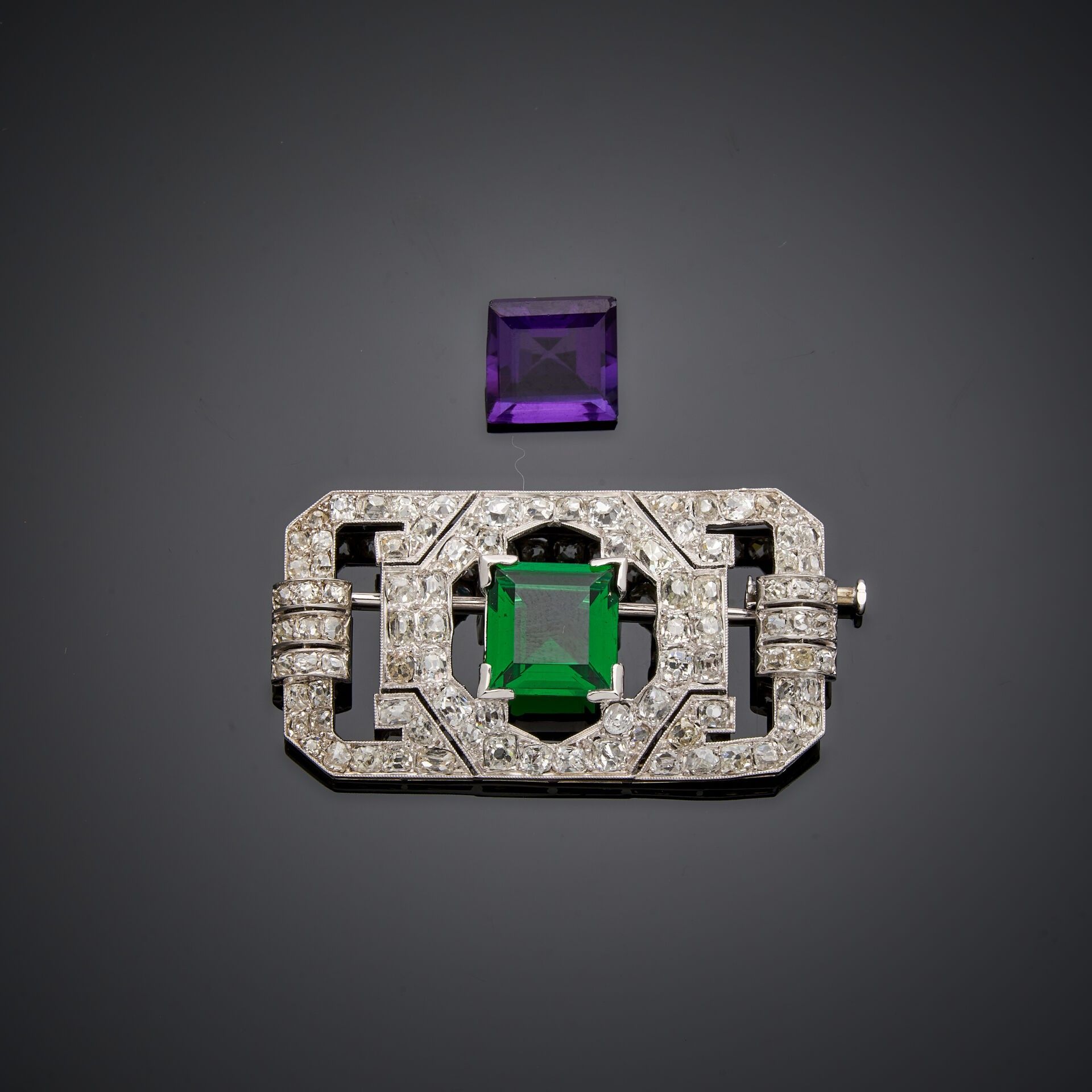 Plate brooch in 18K white gold 750‰ and platinum 850‰, of rectangular form, with canted sides with geometric decoration set with old-cut diamonds. In the centre a synthetic green stone.