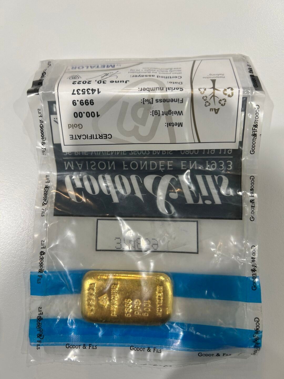 1 gold LINGOTIN 100 grams, n°143537. Under seal. Lot sold as is upon designation, not present at the auction. Delivery by appointment only. Sales charge: 14.40% incl. VAT.