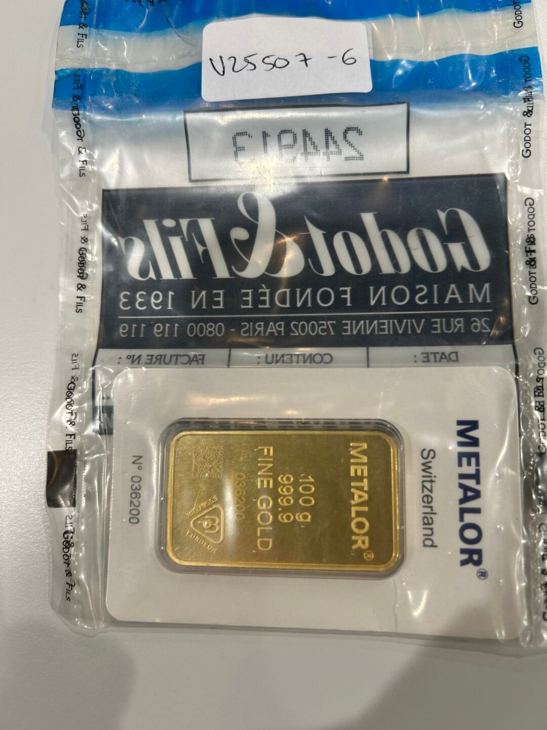 1 gold LINGOTIN 100 grams, n°3036200. Under seal. Lot sold as is upon designation, not present at the auction. Delivery by appointment only. Sales charge: 14.40% incl. VAT.