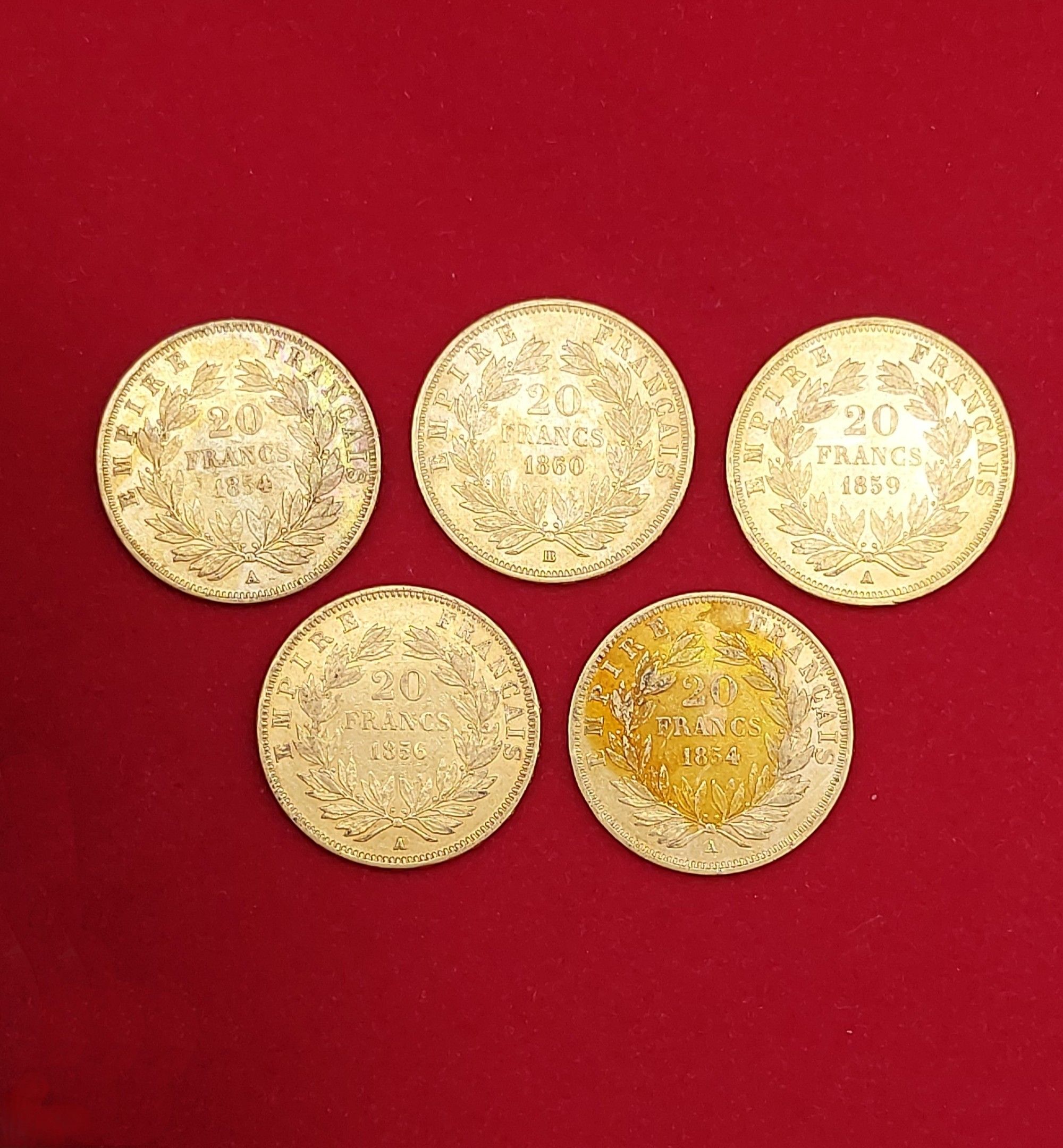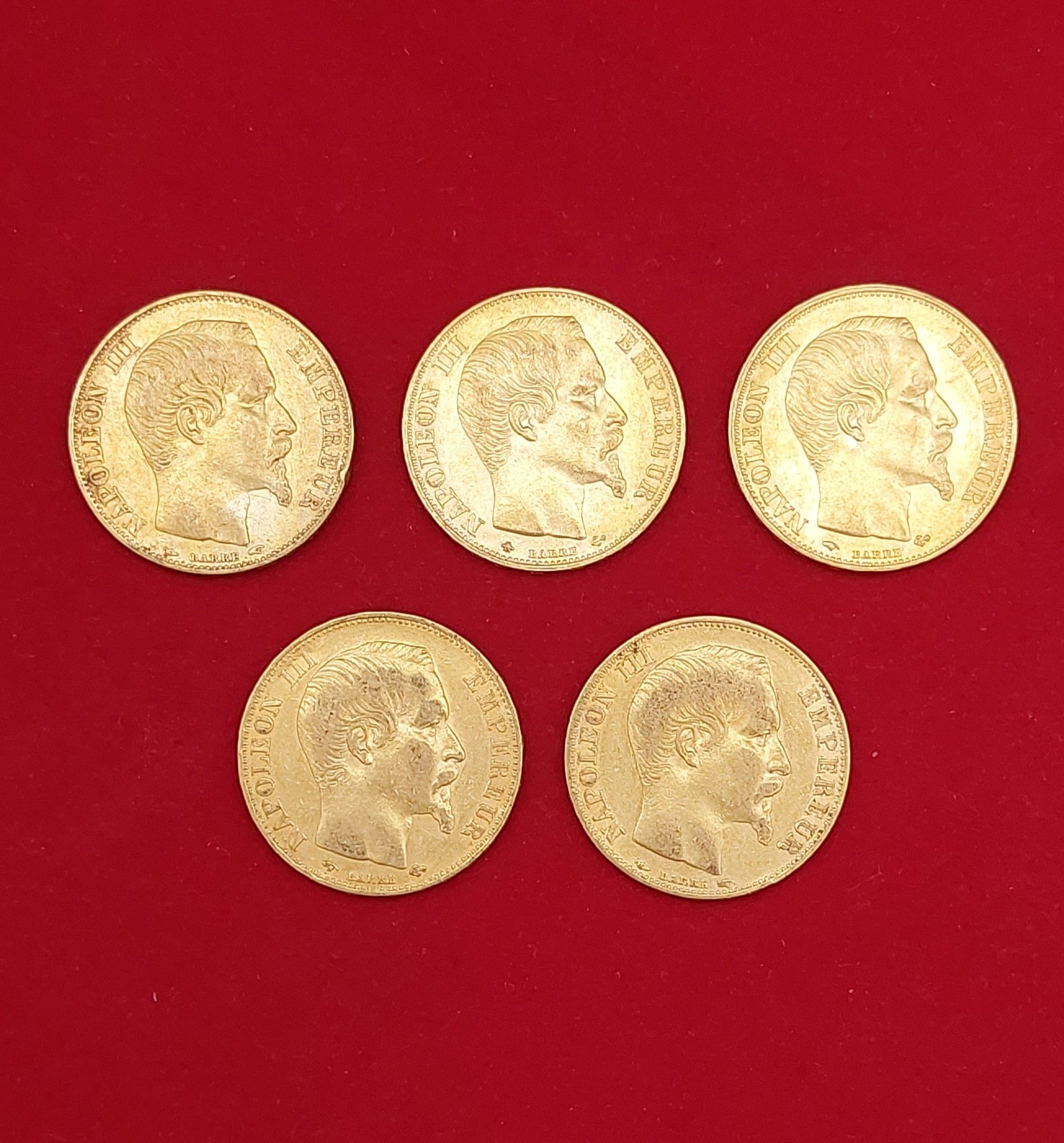NAPOLEON III (1852/187) : Lot of 5x 20 Francs Gold "Tête nue…