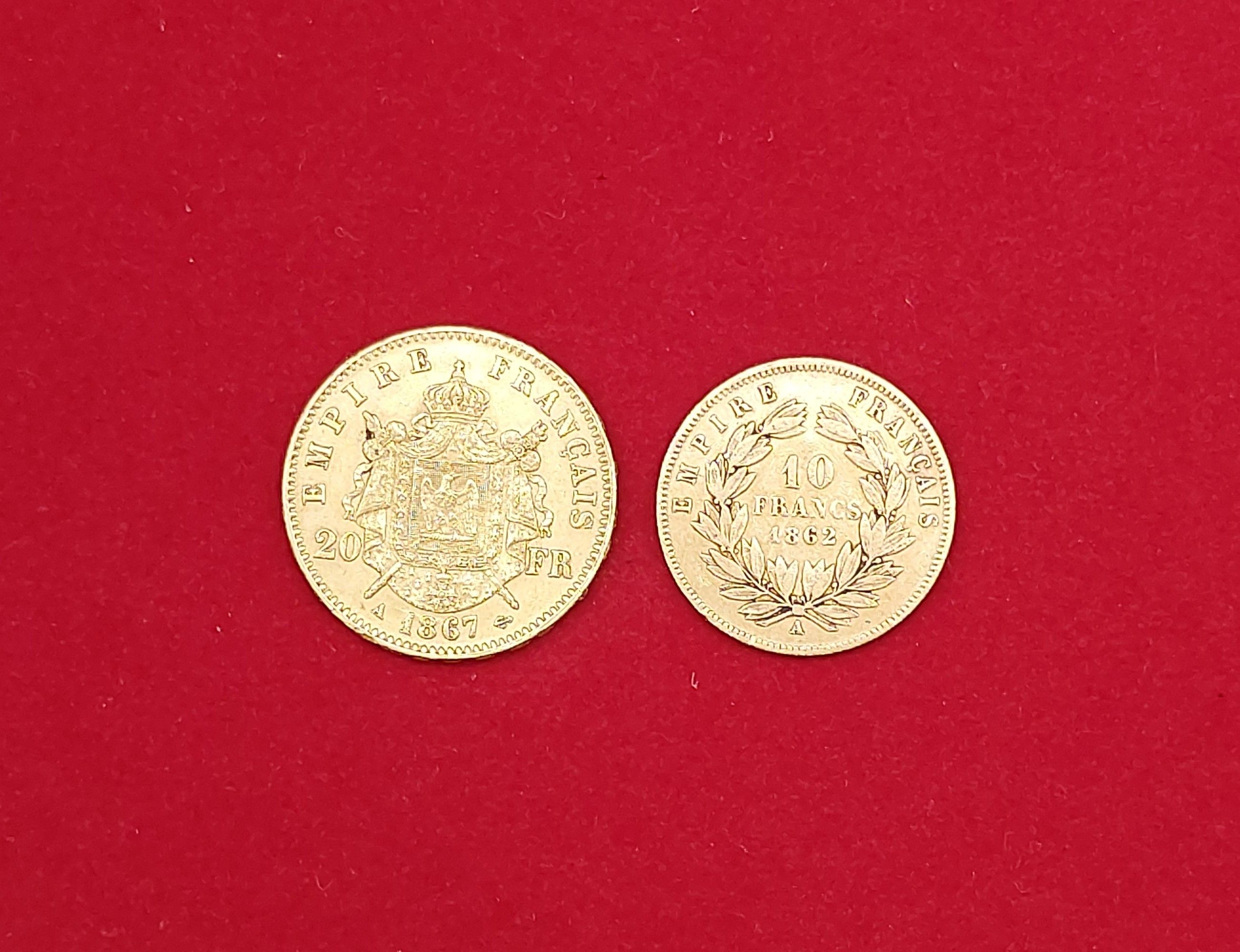 NAPOLEON III (1852/187) : Lot of 2 Gold Coins: 20 Francs 1867 A and 10 Francs 1862 A "Tête Laurée". G 1062 and 1015. TTBandTTB+.