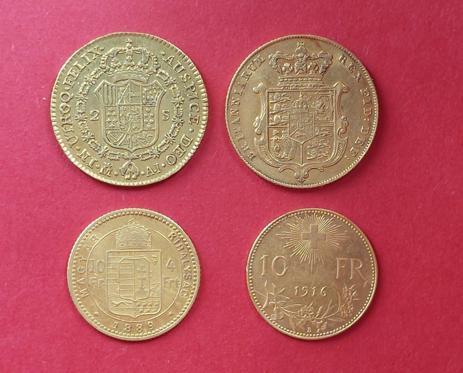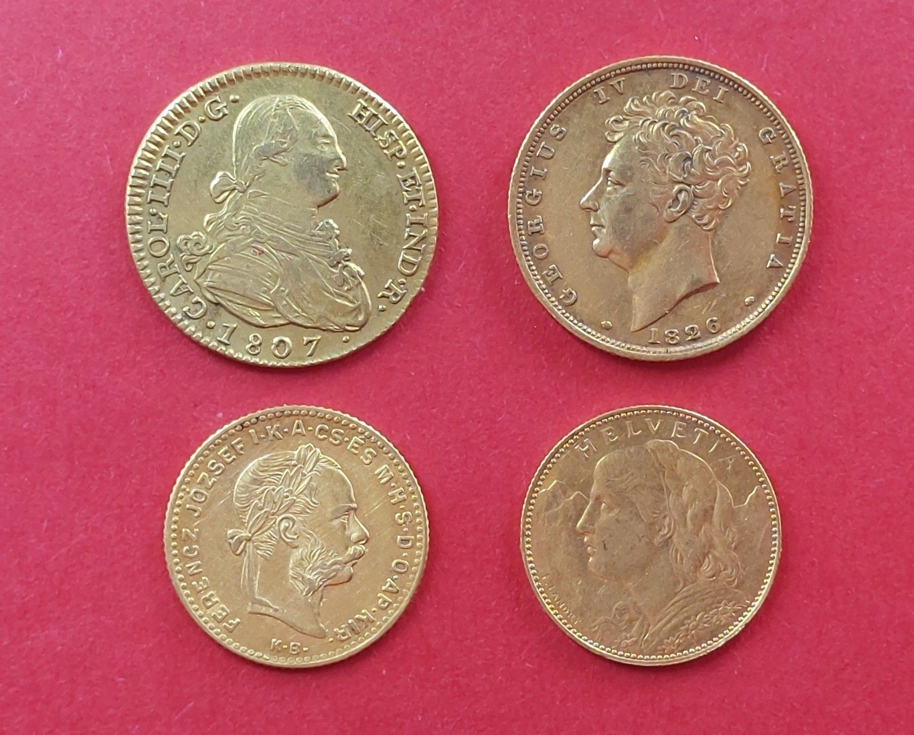 Lot of 4 Miscellaneous Gold Coins: GB Sovereign 1826; Spain 2 Escudos 1807 Madrid; Hungary 10 Francs 1889 and Switzerland 10 Francs 1961. MiscellaneousStates