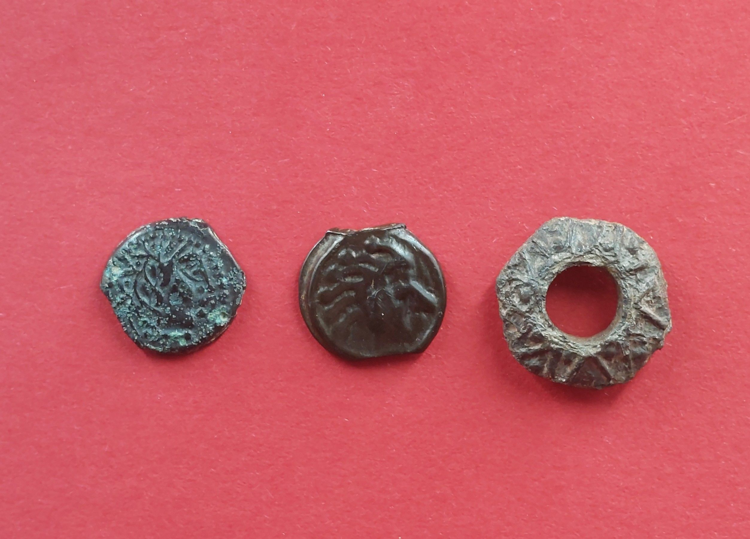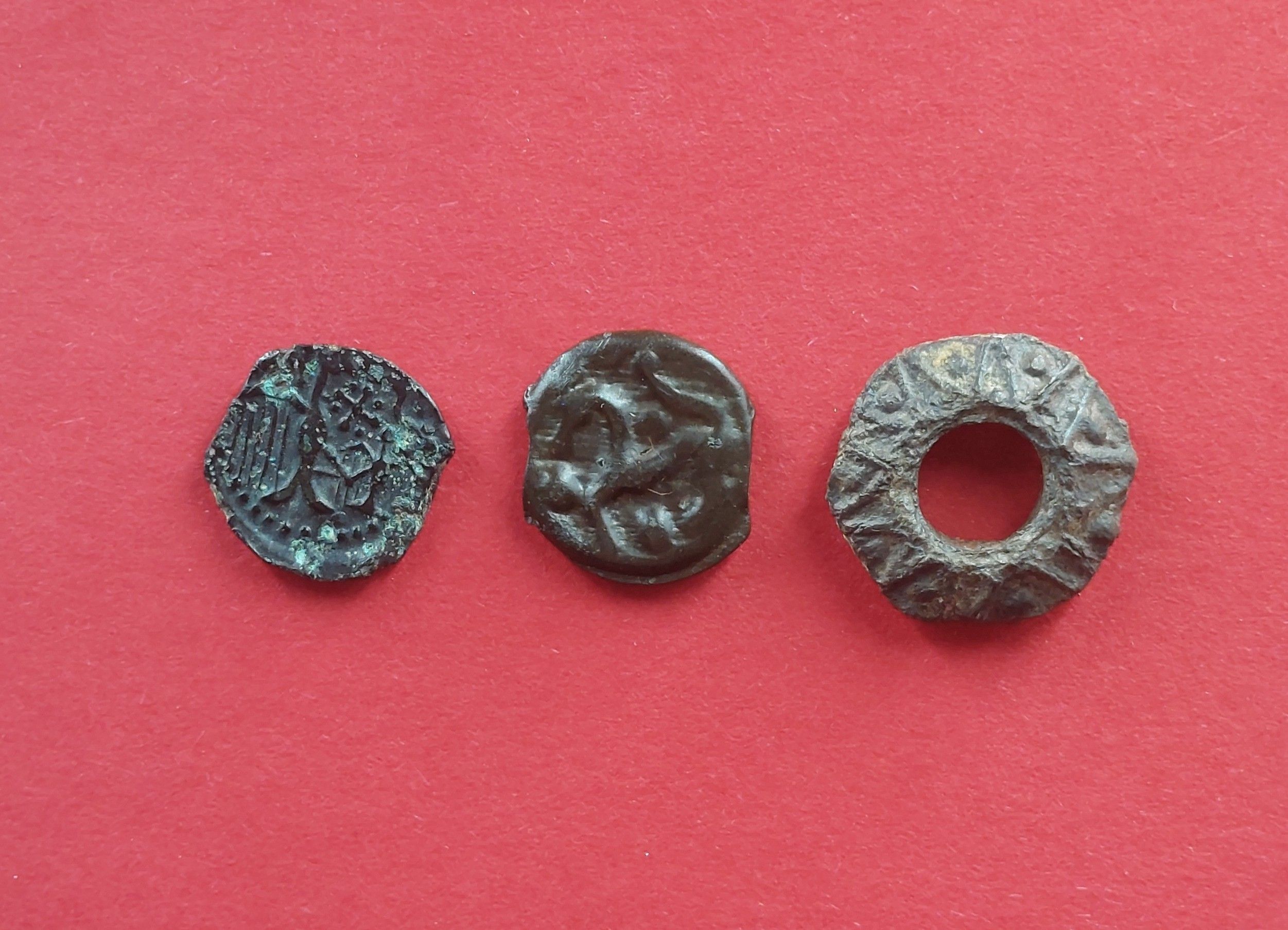 La GAULE : Lot of 3 Coins and Rouelle Les Carnutes (Chartres) Bronze with eagle. LT/F 6088 3,51g. ; Les Senones (Sens) Indian head potin LT/F 4717 4,45g. And a bi-truncated lead "Rouelle" 021mm 9 star points and 9 globules 7,55g period, to be determined. FAIR CONDITION