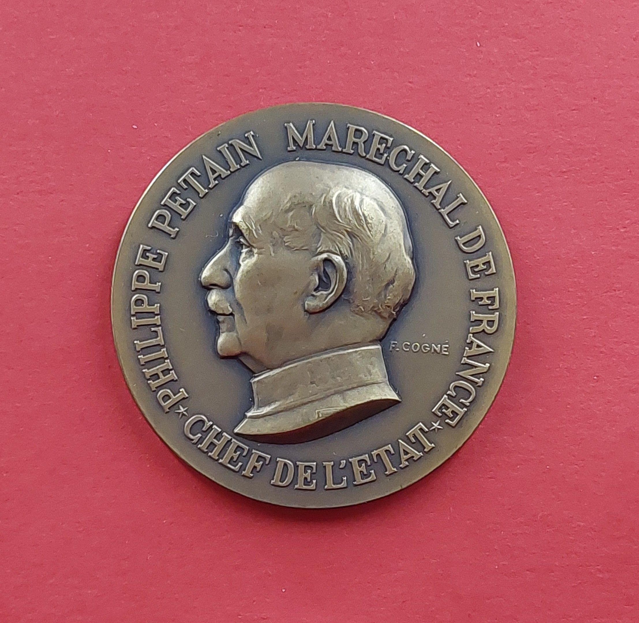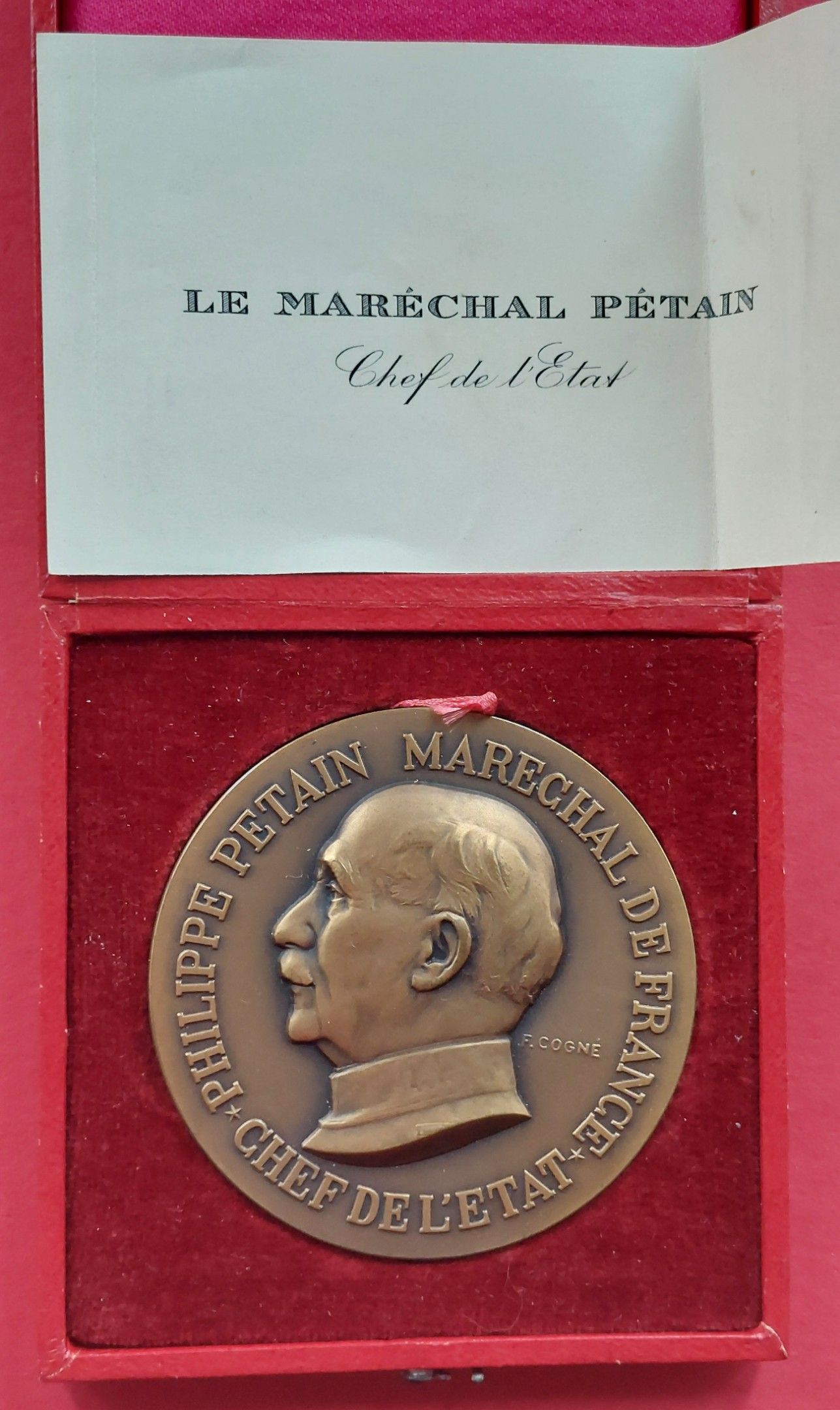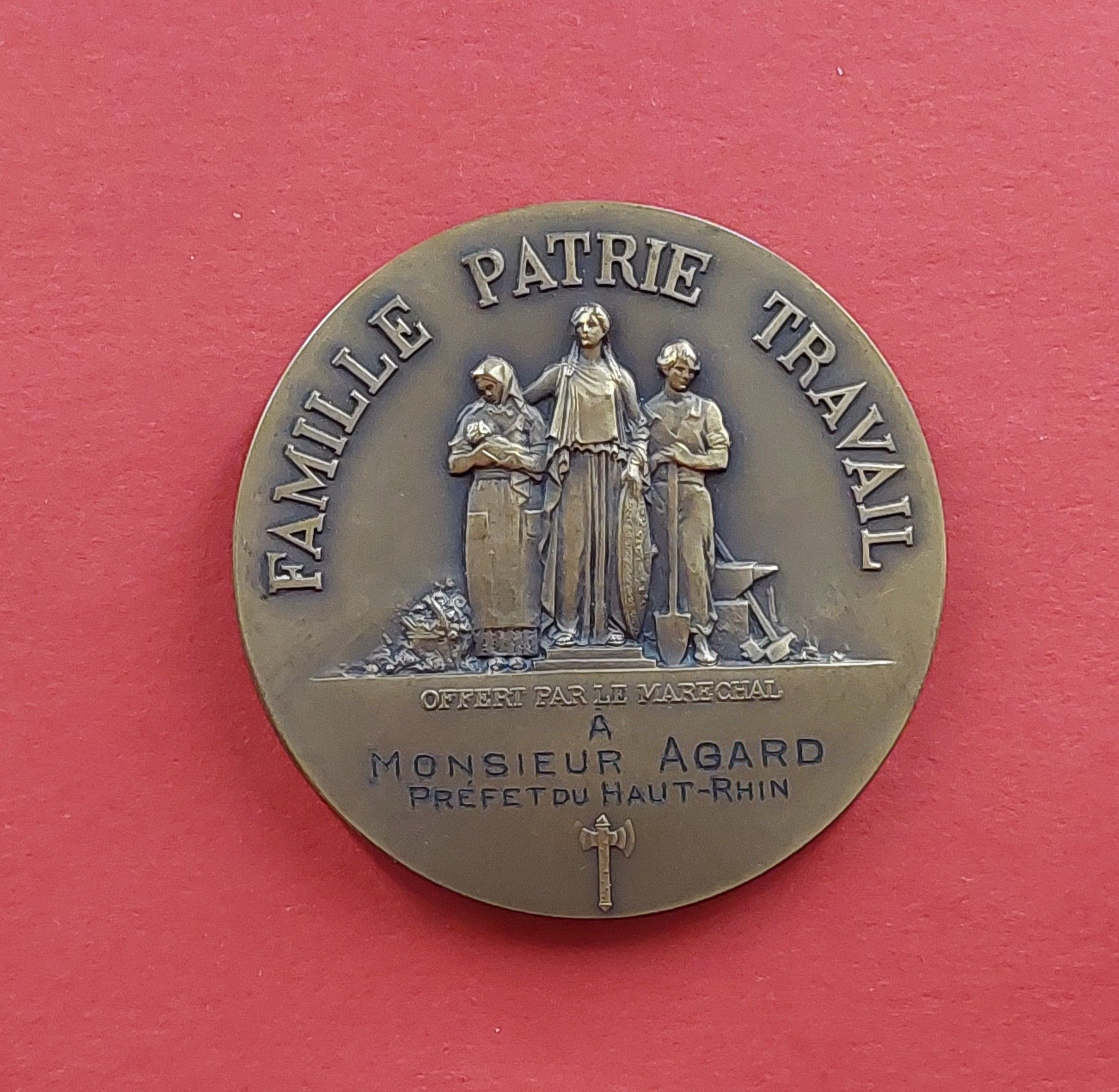 FRENCH STATE - Bronze medal "Famille Patrie Travail" offered by the Marshal 063mm by F. Cogné. Attributed. In its box with visiting card of the Marshal (folded). SUP