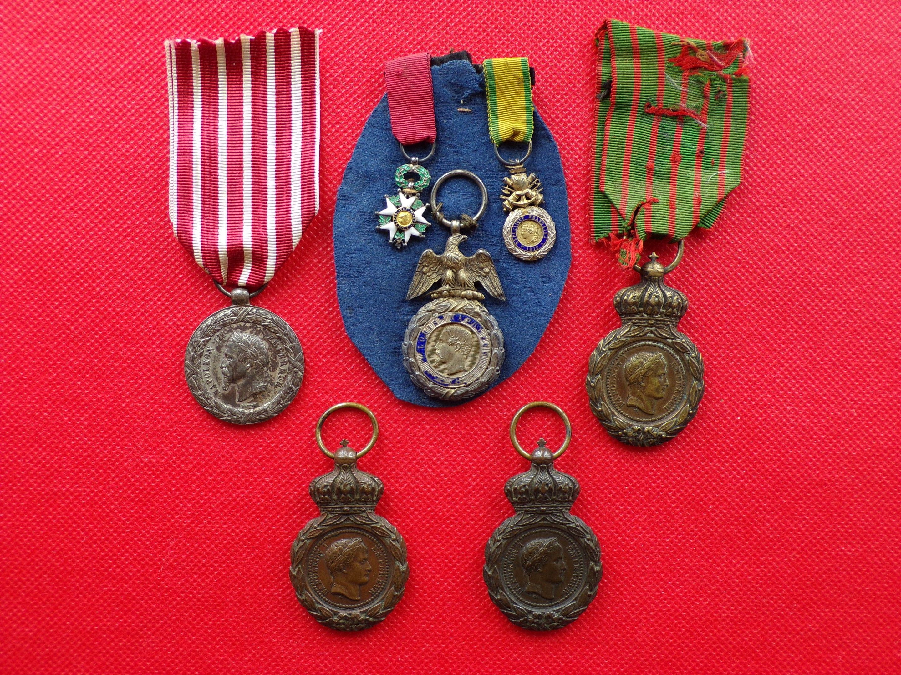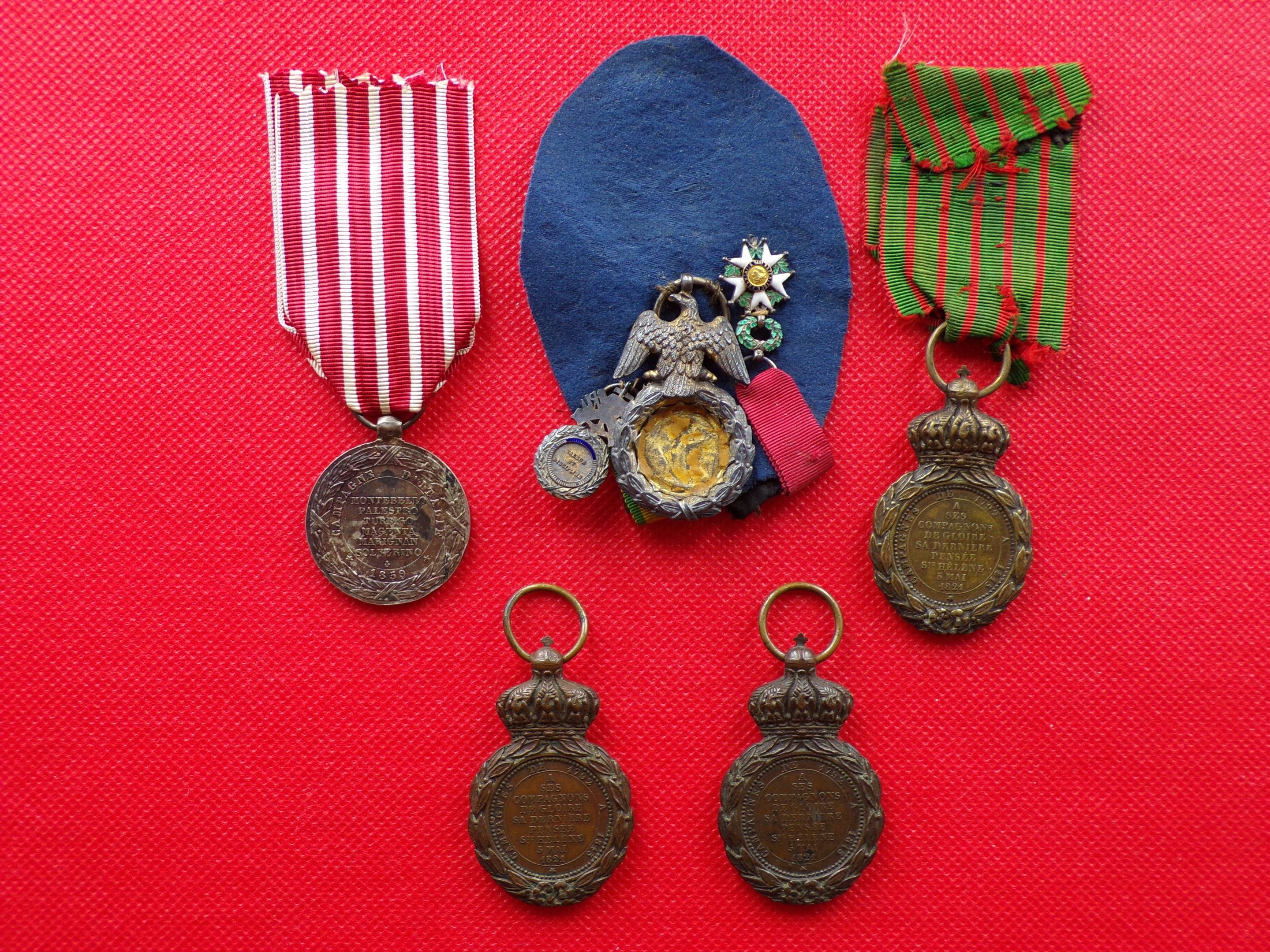 Lot of 5 Incomplete Decorations missing the back, Medal of Italy by Barre, 3 Bronze St Helena Medals Napoleon III. There are 2 reductions IIIème République Légion d'Honneur and Médaille Militaire (not articulated). ConditionVarious