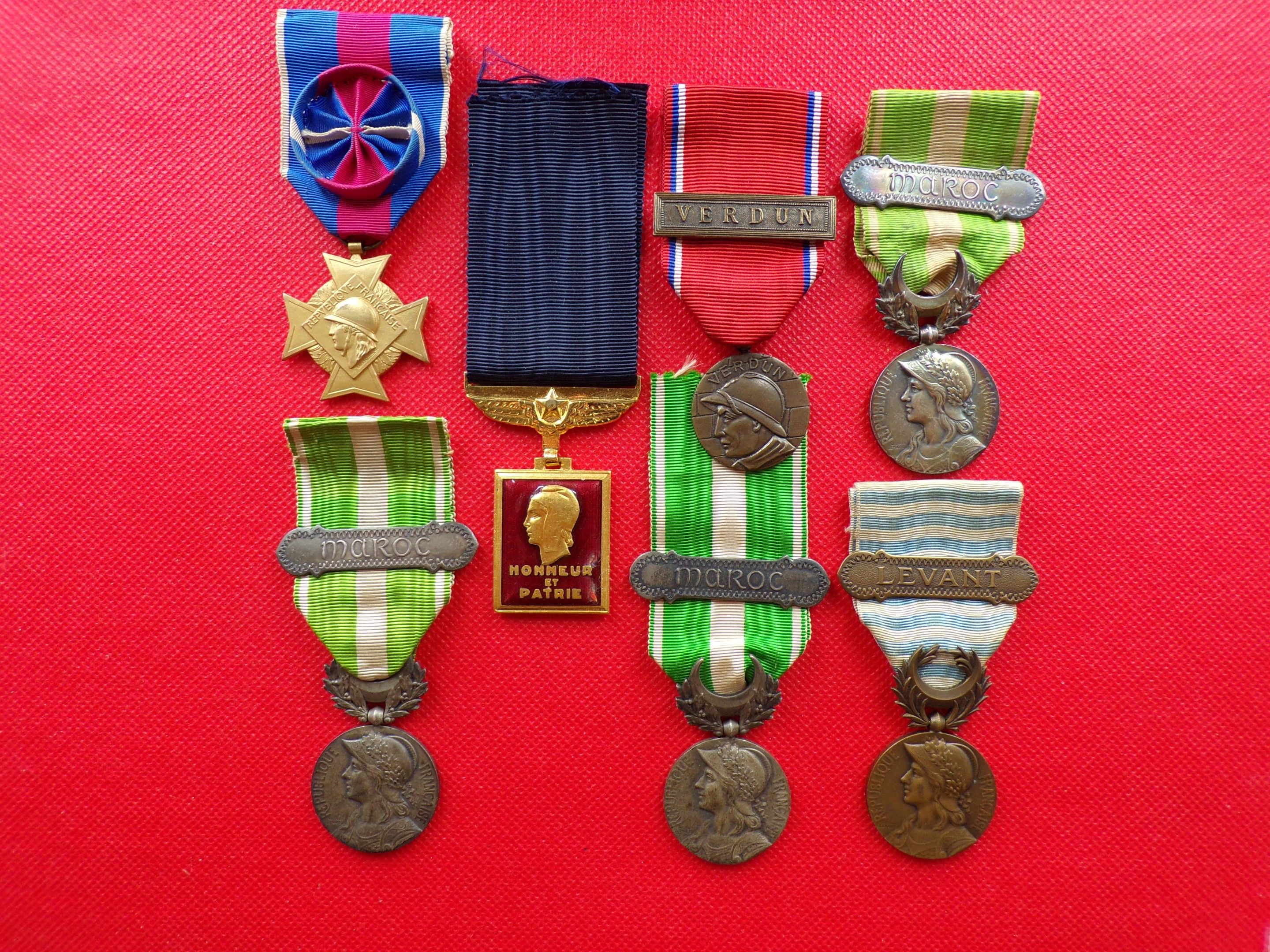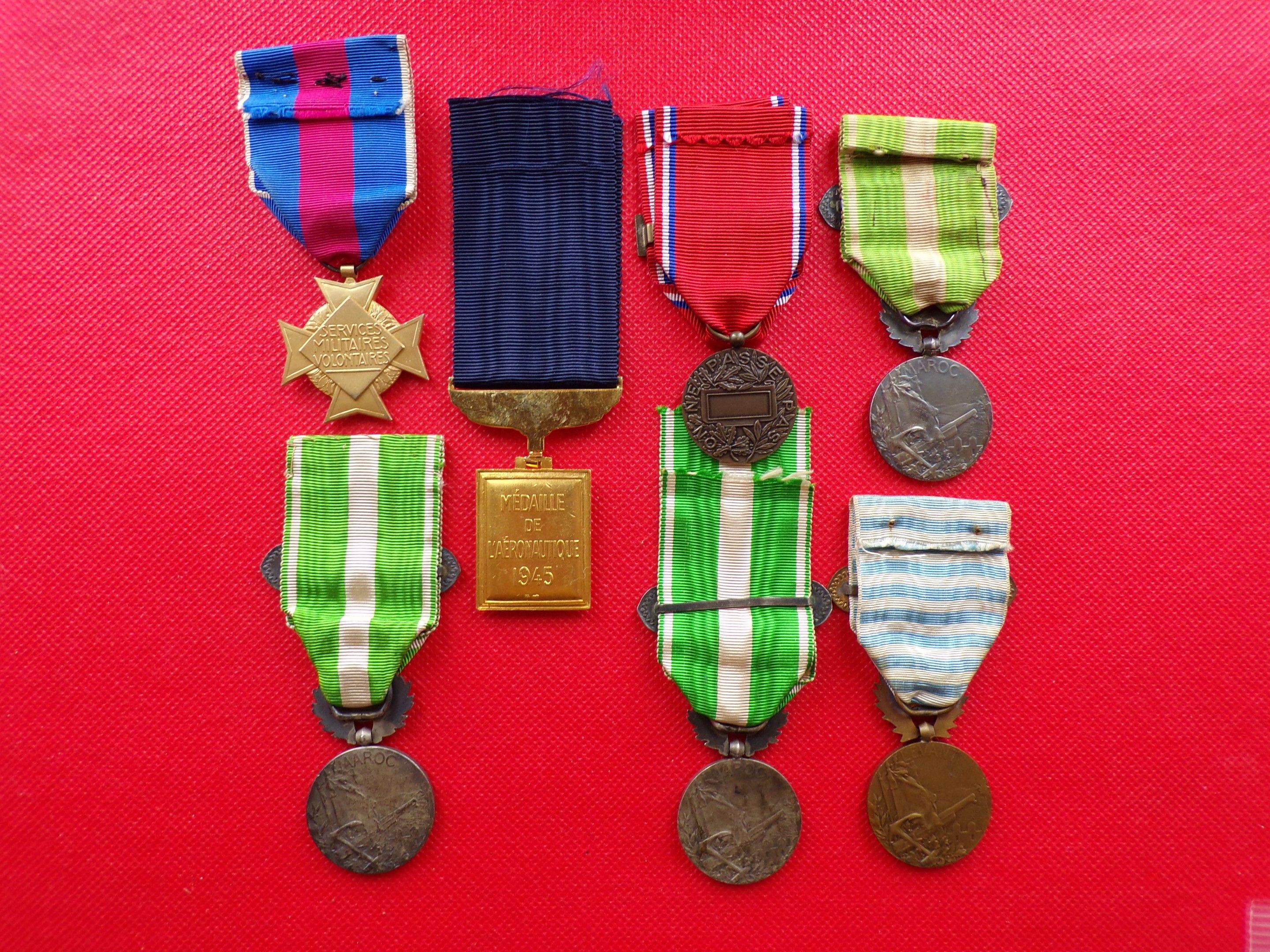 Batch of 7 Decorations: Medals of Morocco (3 with Morocco bars); Medal of the Levant with bar; Medal of Aeronautics 1945 (red enamel accidents); Medal of Verdun (anonymous model); Medal of Voluntary Military Services (Officer in vermeil). MiscellaneousStates