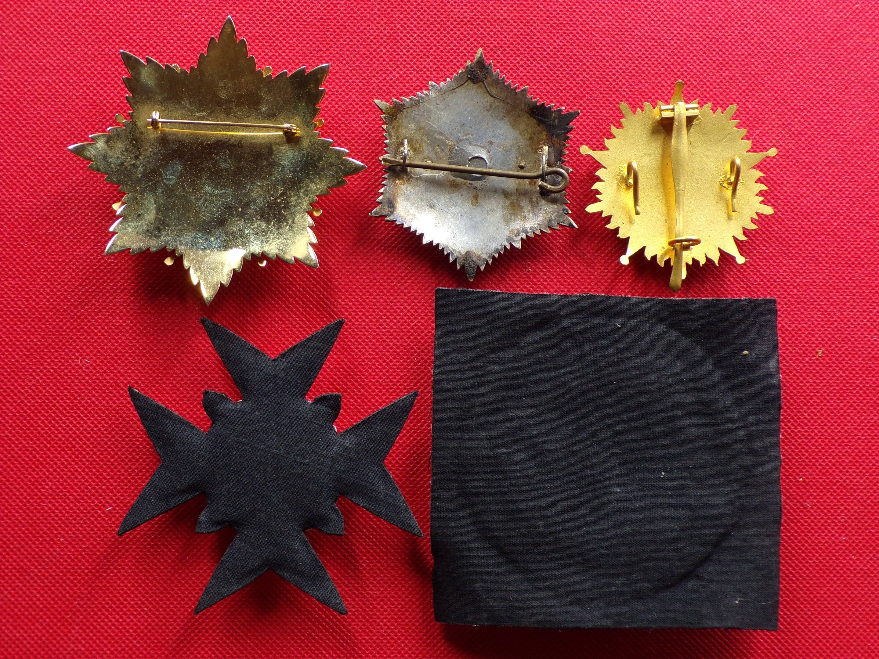 Set of 5 Plaques: Légion d'Honneur Grand Aigle Plaque in silver wire cannetille 096mm (reproduction); Ordre du Saint-Esprit in silver wire cannetille 097mm (reproduction.) Order of Saint-Lazare of Jerusalem (unofficial) Plaque in gilt metal and enamels 089mm; Académie Universelle des Sciences et Arts Industriels in silver metal and enamels 075mm; Juré Award Plaque in gilt metal and enamels 063mm.
