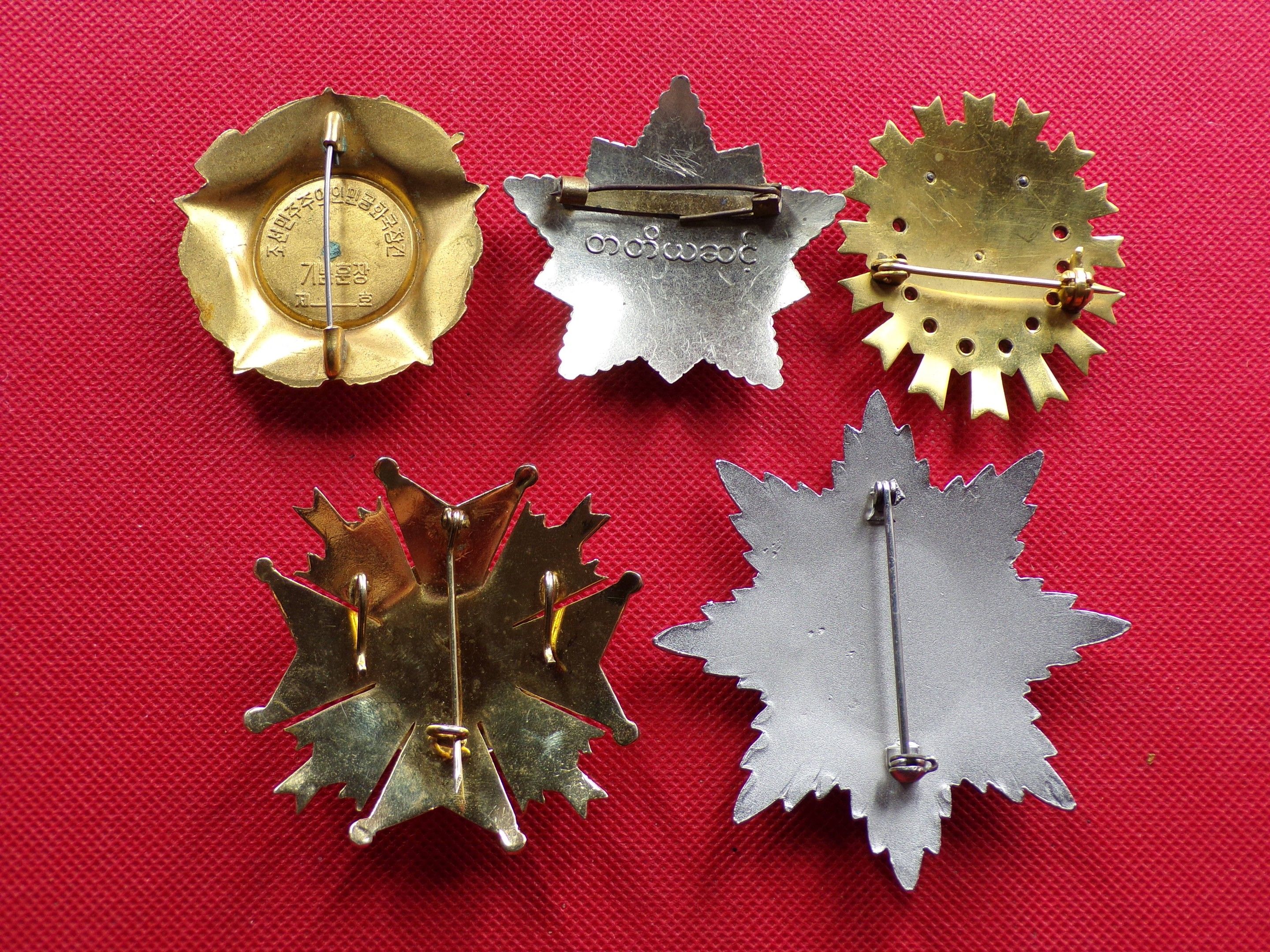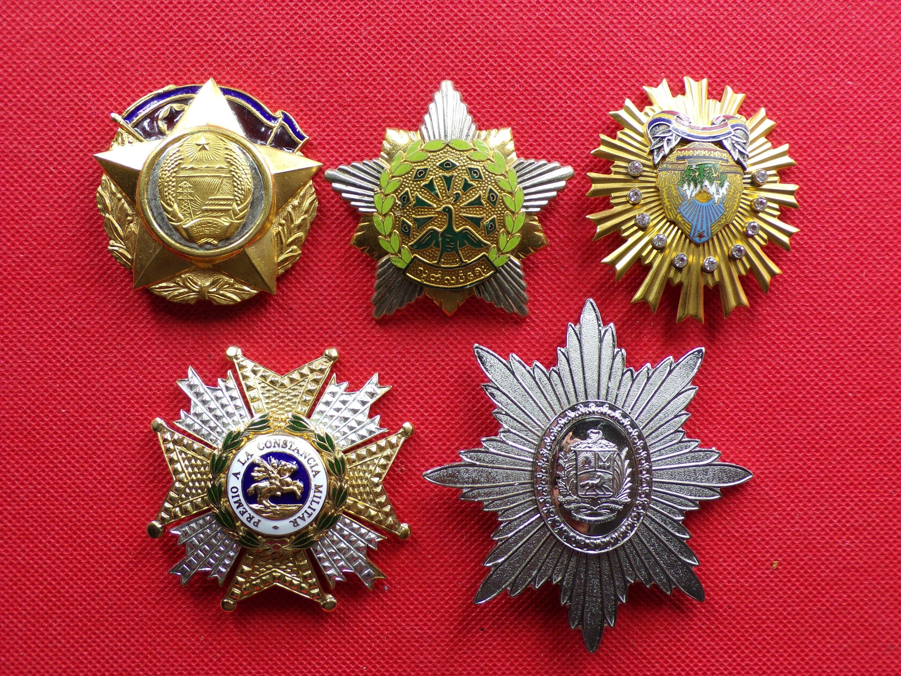 Set of 5 Plaques: Spain Royal and Military Order of St Herrenegilde in gilt, silver and enamel 068mm; Venezuela Order of St Simon Bolivar in silver Ht85mm; North Korea Order of the 20th Anniversary of the Foundation in gilt and enamel 059mm; Romania Decoration of Honour for Service to Security in gilt, enamel and rhinestone HT61mm; Burma Order of the Star of the Revolution 3rd Class in silver 062mm. Very Fine
