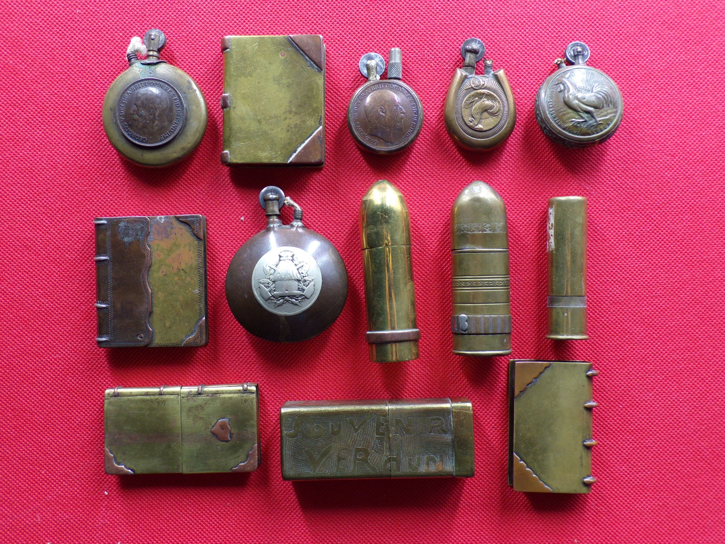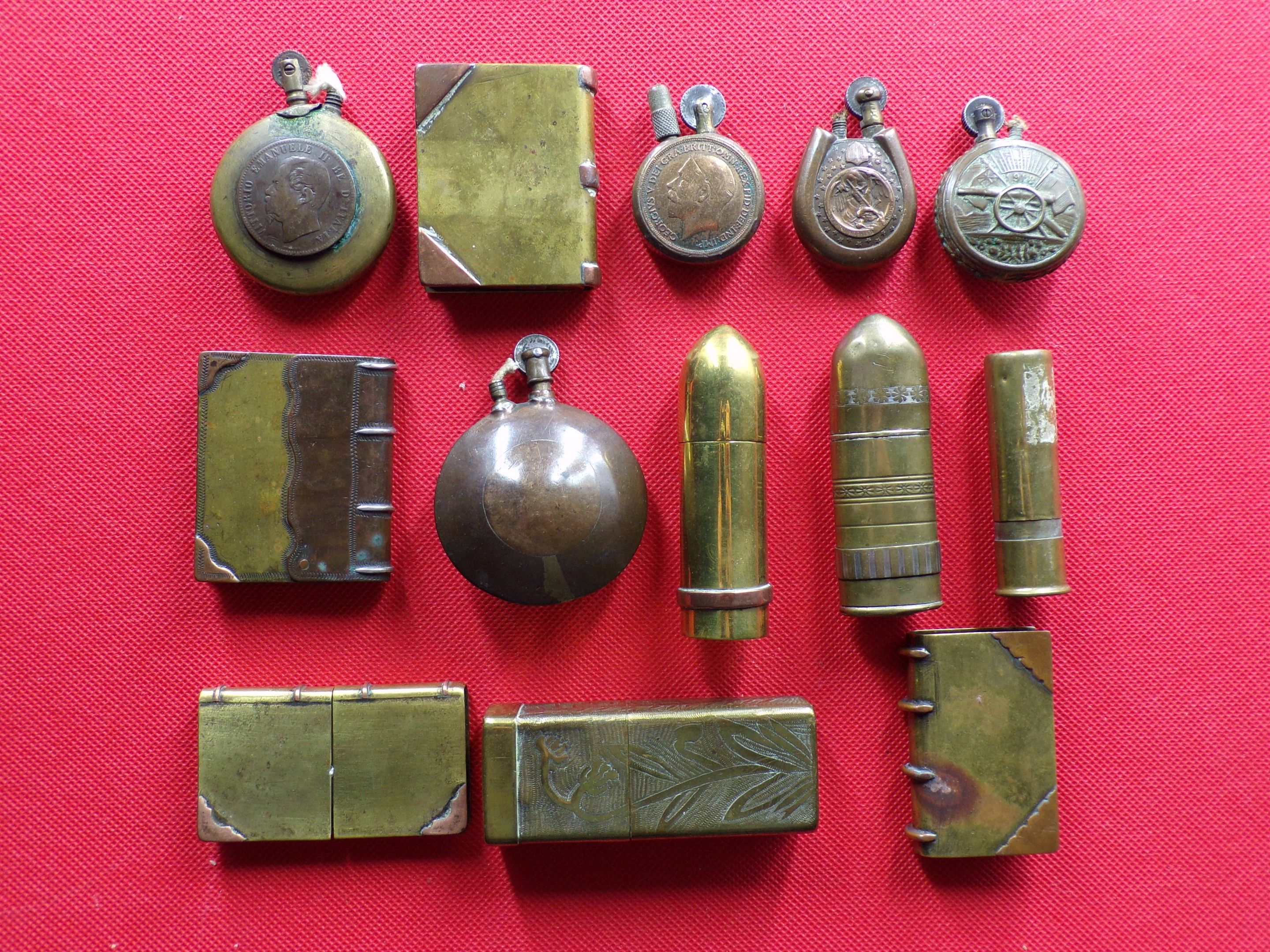 Set of 13 "Trench" Lighters in salvaged metal. Trench craft 1914/1918. RARE. ConditionVarious