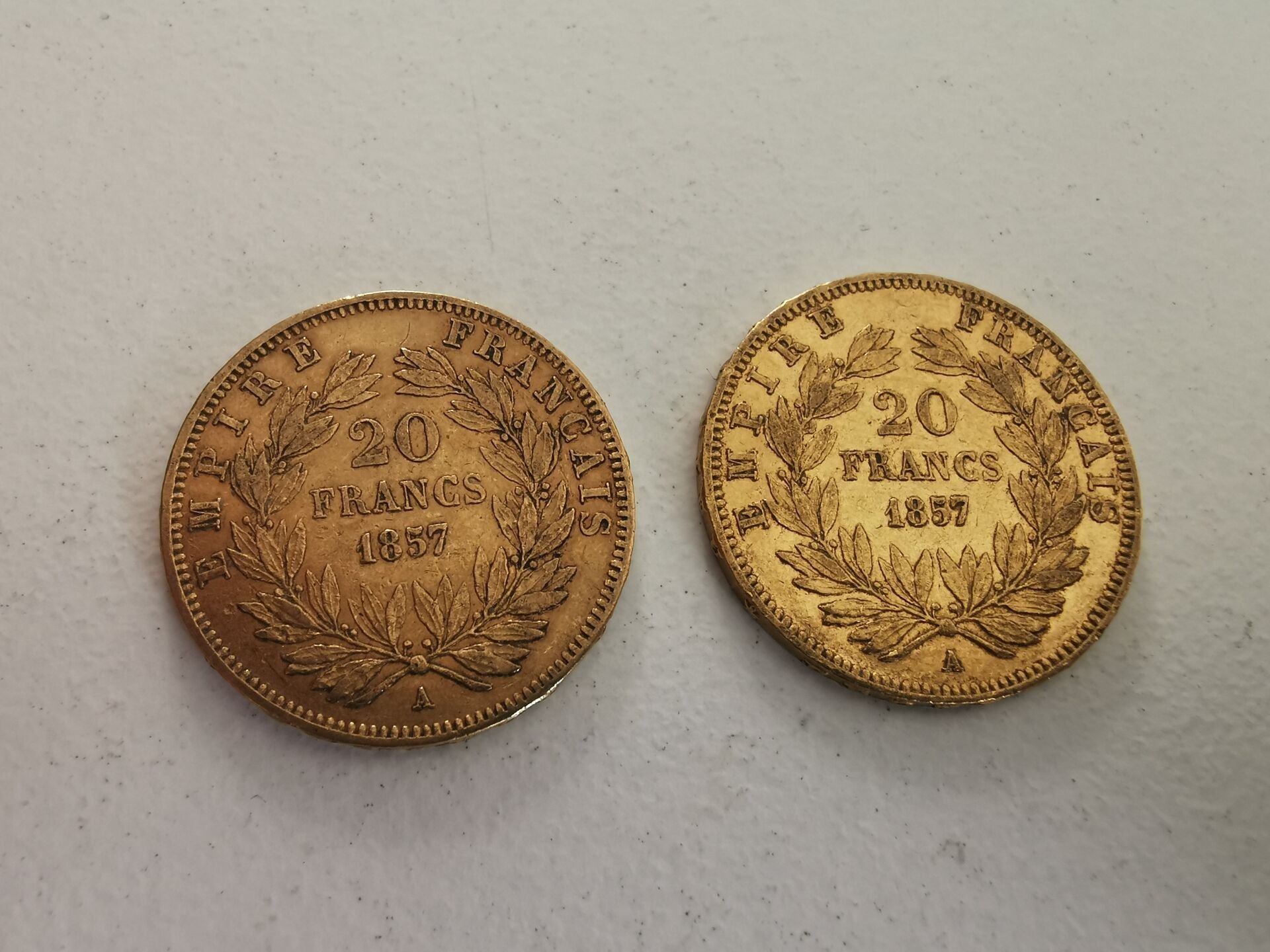 2 Gold coins of 20 Francs Napoléon III 1857 bare head - foll…