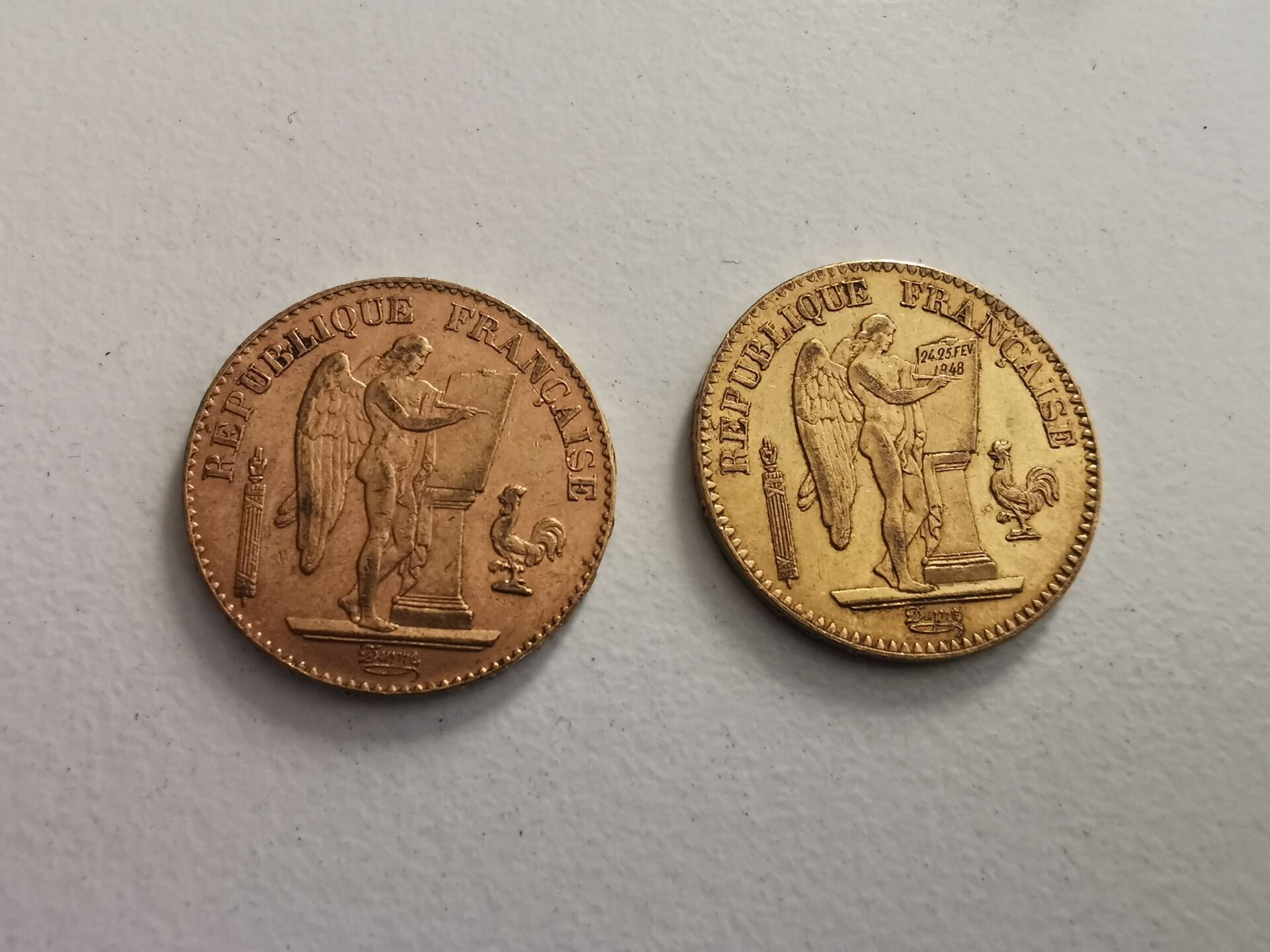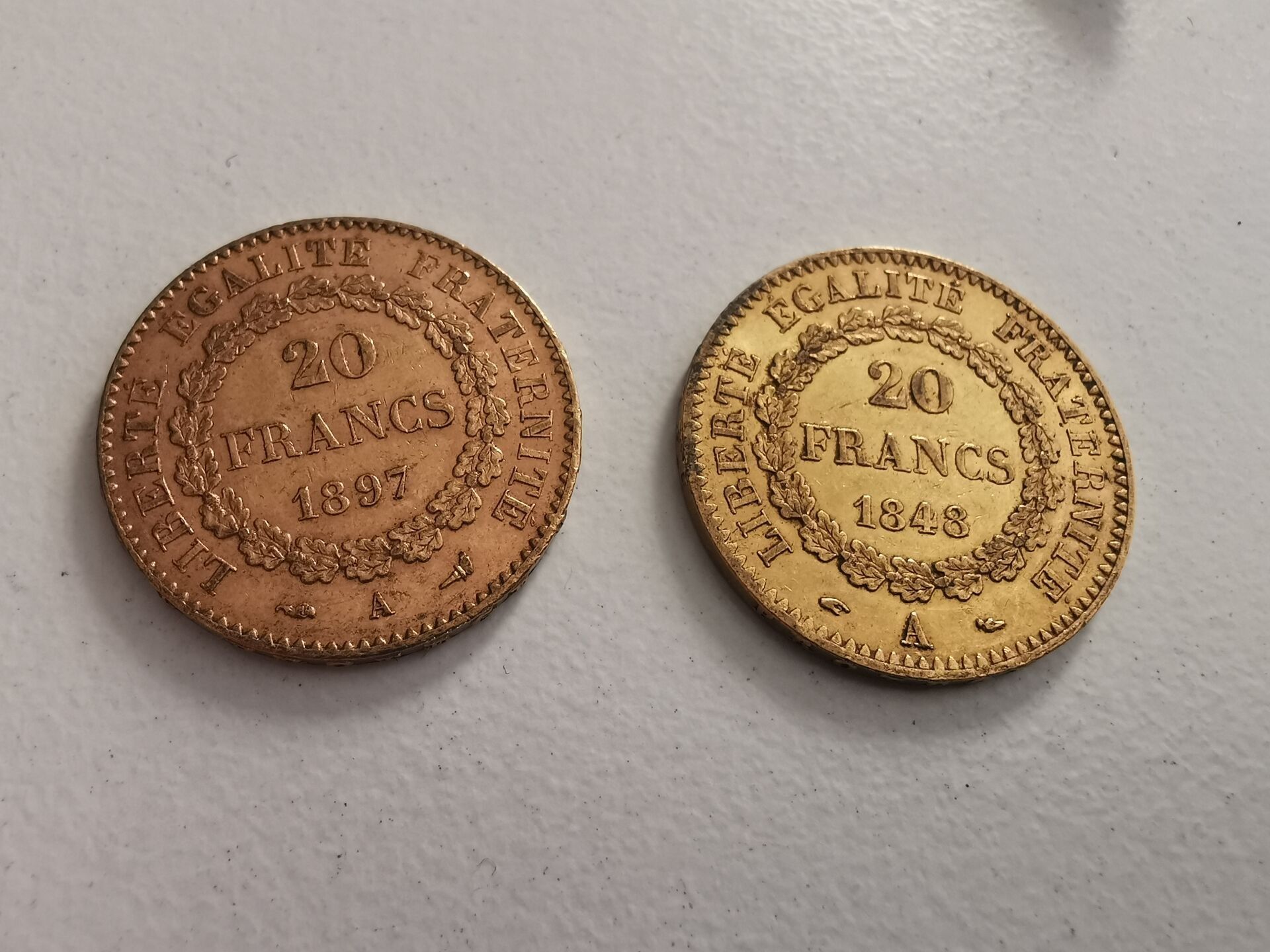 2 Gold coins of 20 Francs au Génie 1897 and 1848 - following an inheritance, sold by designation, kept in a safe at the bank, not visible at the study - The coins were sold by designation, kept in a safe at the bank, not visible at the study - The coins were sold by designation, kept in a safe at the bank, not visible at the study.