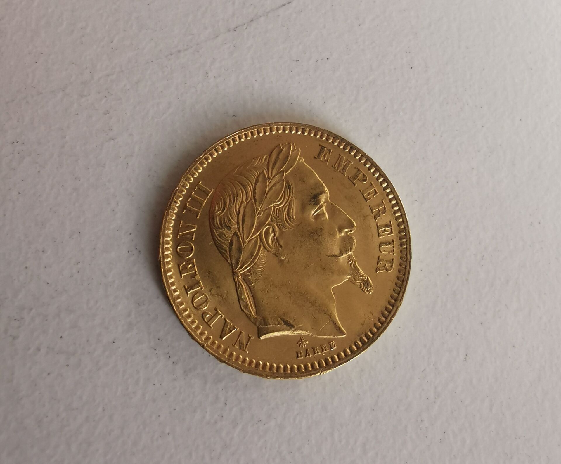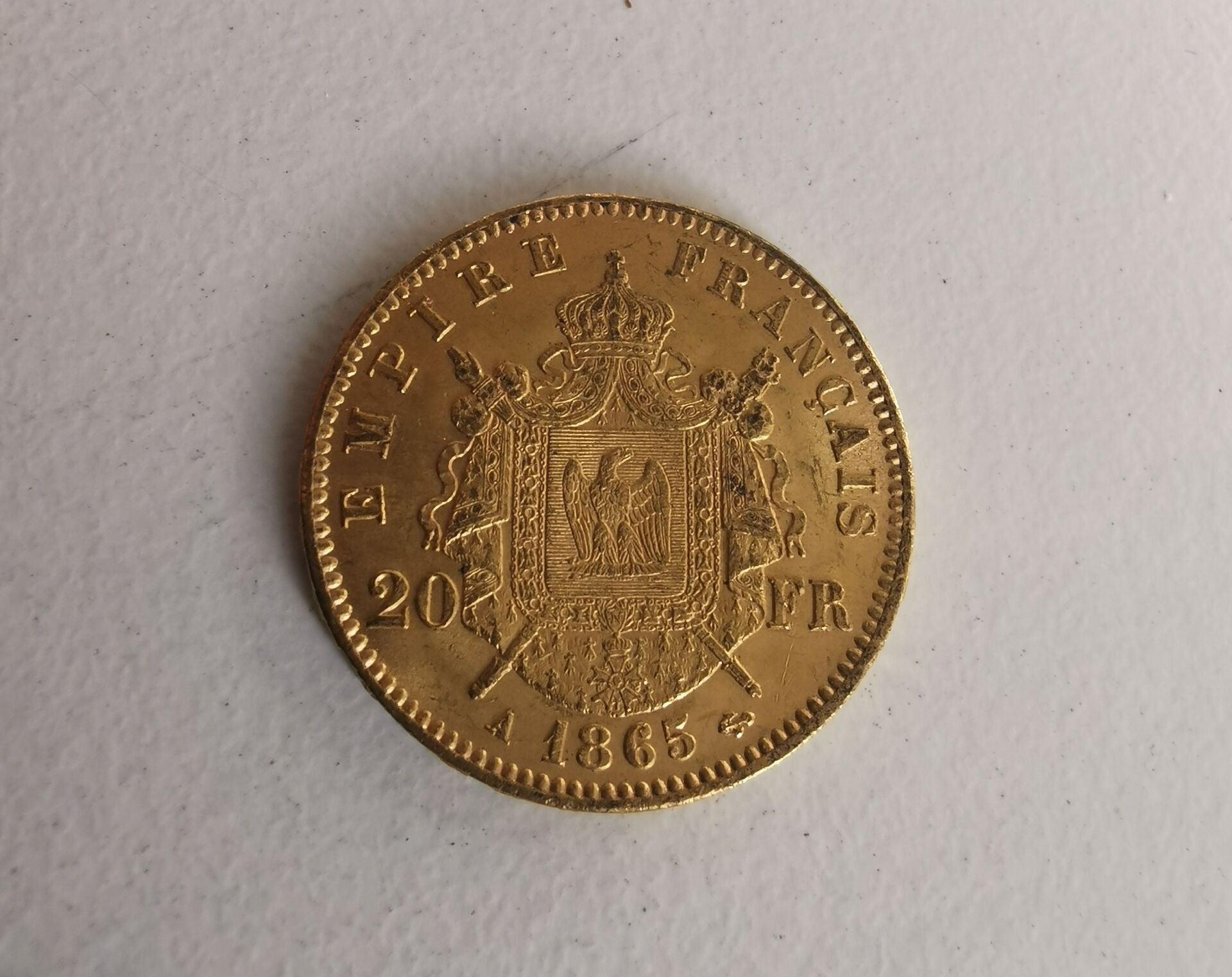 1 Gold coin of 20 Francs Napoléon 1865 Tête laurée - following an inheritance, sold by designation, kept in a safe at the bank, not visible at the study -.