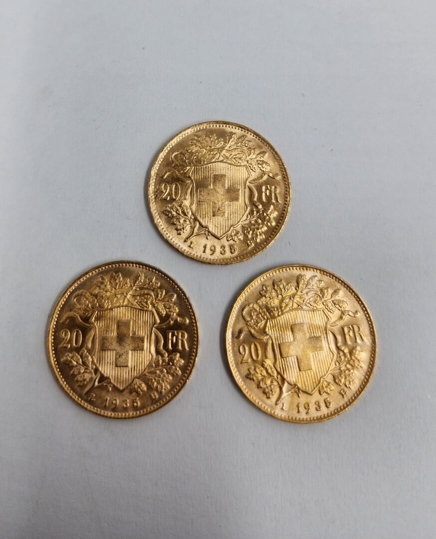 3 Swiss 20 franc gold coins - 1935 - following an inheritance, sold by designation, kept in a safe at the bank, not visible to the Auction House.