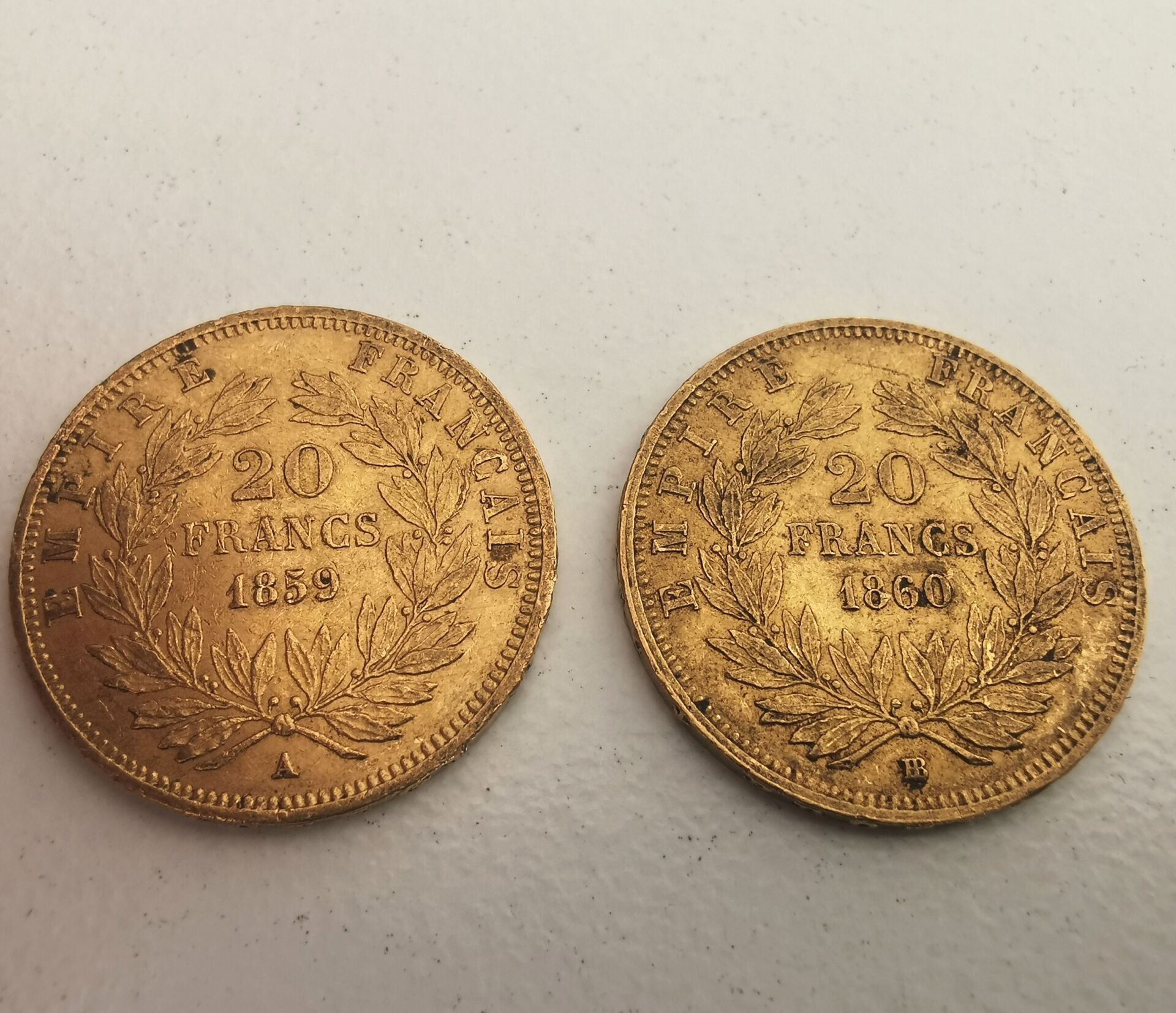 2 Gold coins of 20 Francs Napoléon III 1859 and 1860 bare he…